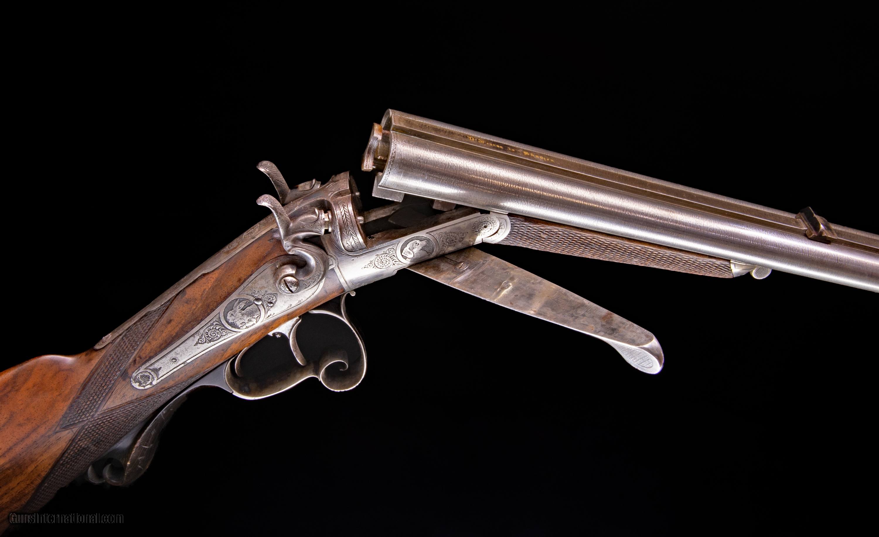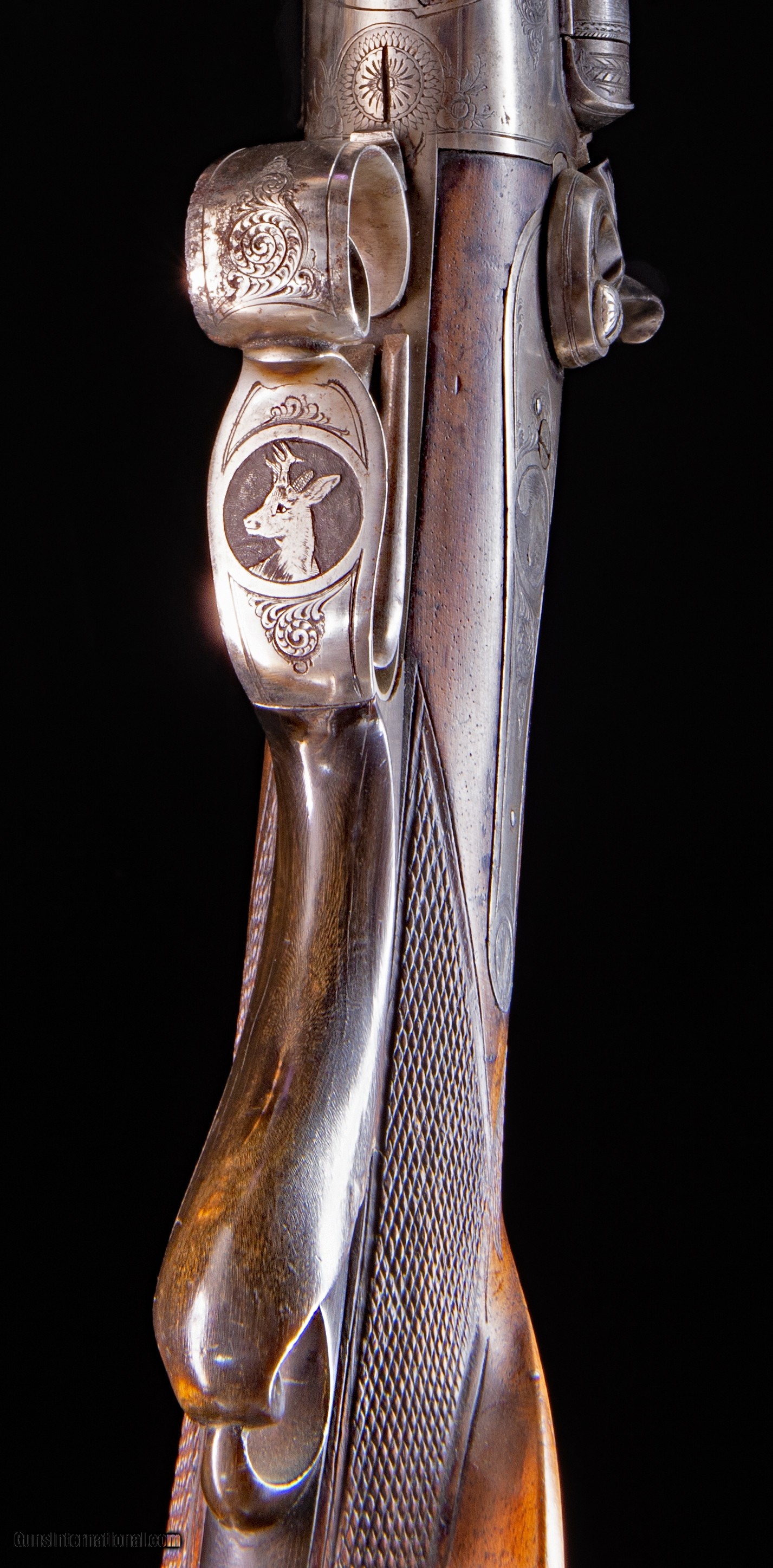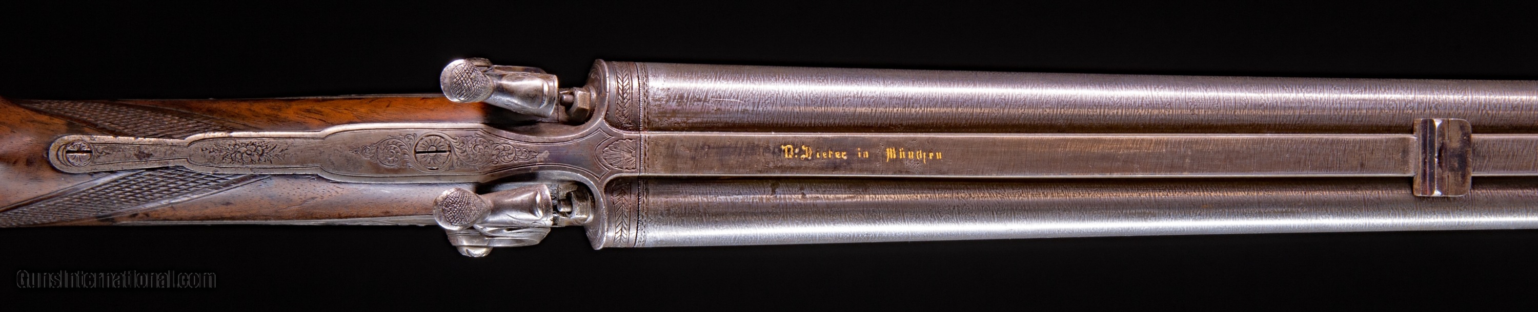Description: Drillings, Double Rifles, and Rifles - A very ornate and cool German combo gun of extremely high quality with an exceptional Damascus pattern. *** Note: To see this gun with high resolution photos and a zoom-in feature, go to the vintagedoubles main site and search for the gun ID: 4524 or browse the main site to see our full gun collection. SOLD Manufacturer: D. Dieter of Munchen (Munich Germany) combination double ~ 16g. by 9.5x47R side by side Model: None Serial Number: 6003 Caliber Info: 9.5x47R Ejectors: No Barrels: 27 Barrel Type: Damascus Action: lefaucheux Gauge Info: Caliber Stock Cast: 1/8 LOP: 13 3/8" to meta Weight: 7lbs 9oz. Choke Left: .005 Skeet Proof:Black: 16g. 2 1/2" and Minimum Wall Thickness Left: .030 |