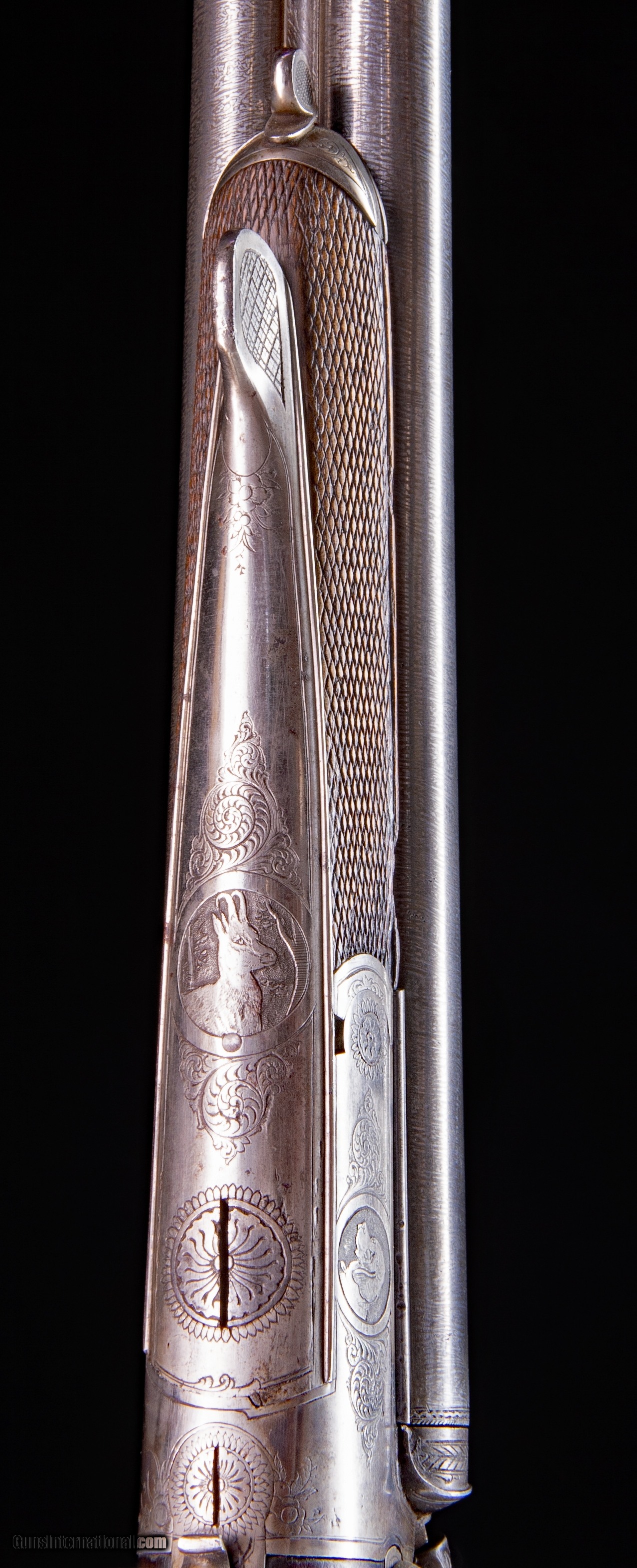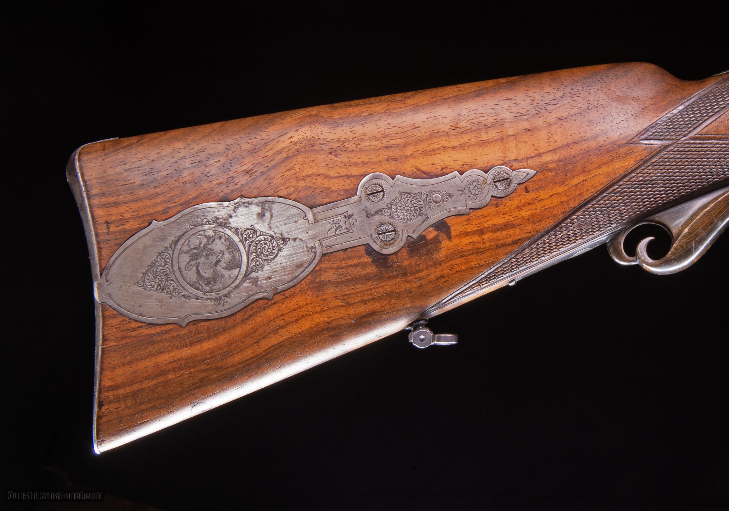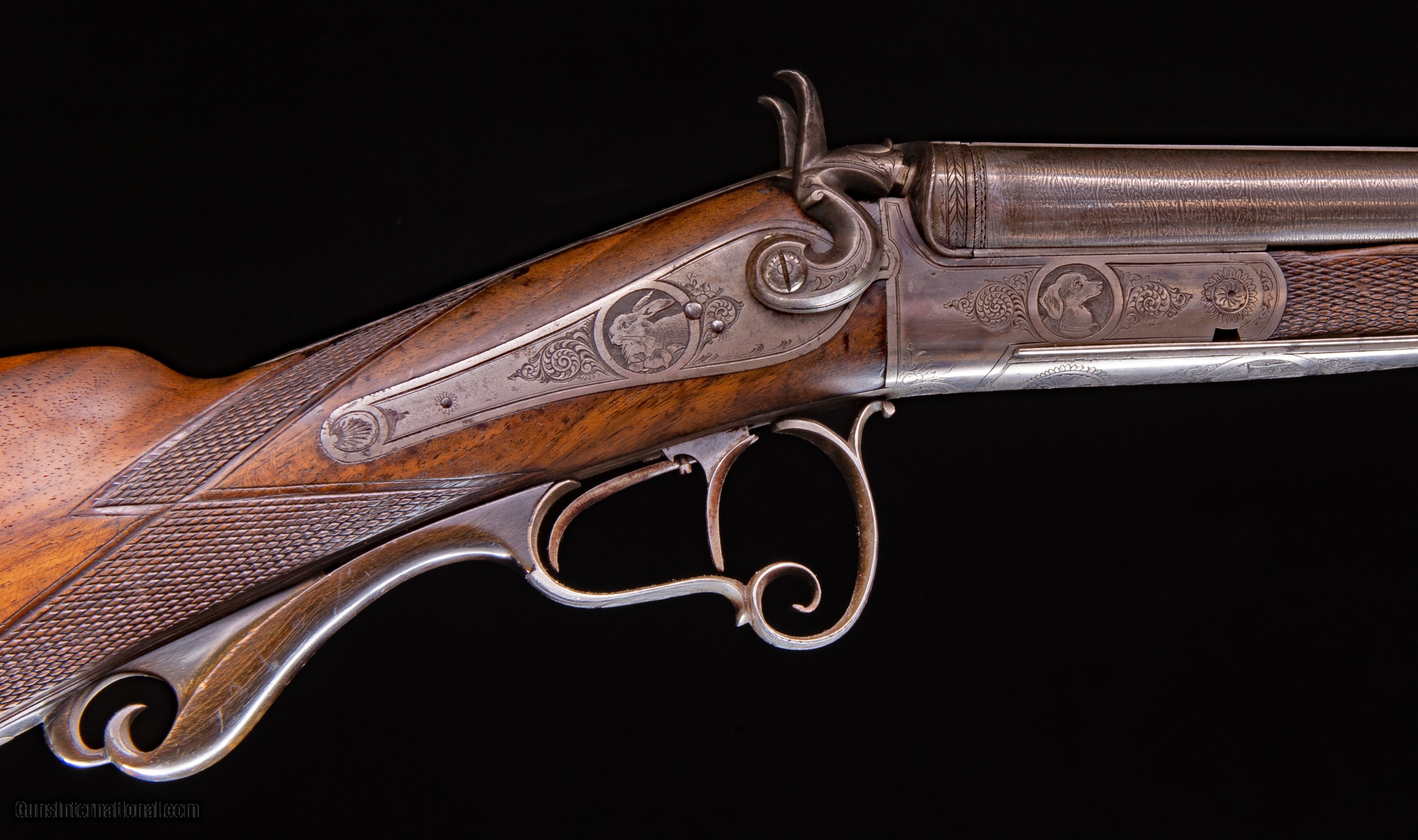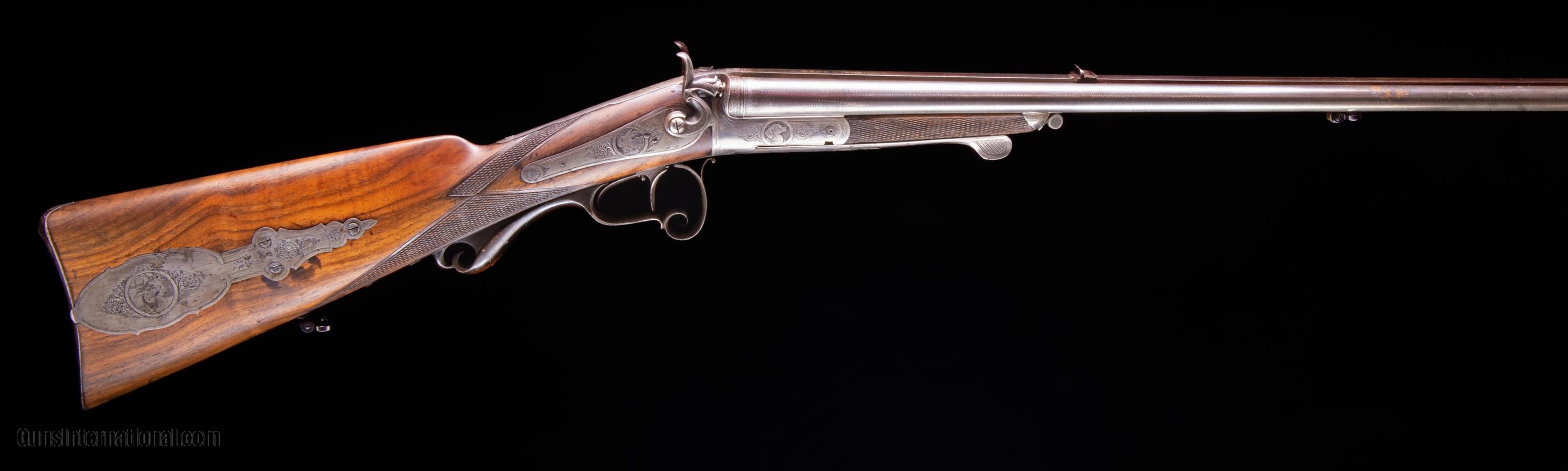 Description: Drillings, Double Rifles, and Rifles - A very ornate and cool German combo gun of extremely high quality with an exceptional Damascus pattern. *** Note: To see this gun with high resolution photos and a zoom-in feature, go to the vintagedoubles main site and search for the gun ID: 4524 or browse the main site to see our full gun collection. SOLD Manufacturer: D. Dieter of Munchen (Munich Germany) combination double ~ 16g. by 9.5x47R side by side Model: None Serial Number: 6003 Caliber Info: 9.5x47R Ejectors: No Barrels: 27 Barrel Type: Damascus Action: lefaucheux Gauge Info: Caliber Stock Cast: 1/8 LOP: 13 3/8" to meta Weight: 7lbs 9oz. Choke Left: .005 Skeet Proof:Black: 16g. 2 1/2" and Minimum Wall Thickness Left: .030 |