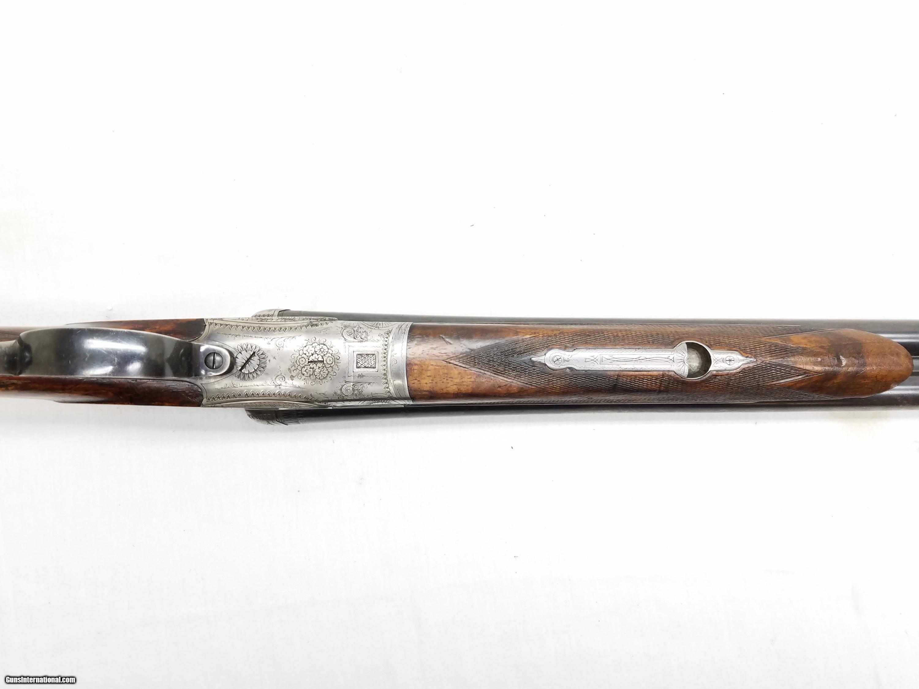 Description: This 16 gauge double hammerless shotgun has tapered blued round 29-5/8" steel barrels with a matted rib and a folding ring sight. Stamped on the left barrel is Koelenz A/RH. Stamped on the right barrel is J. B. Braun. The bores are very good but there is pitting on the outside. The P+ grade Walnut pistol grip butt stock with cheek piece and forend are in good condition and are fitted with a black carved horn pistol grip cap and a red rubber recoil pad. The forend has several small chips of wood missing on the front of the forend. On the pad is: Pachmayr Gun Works Los Angeles California Made in U.S.A. Both the wrist and the forend are checkered. The tastefully engraved action, lever and tang still shows faint color case hardening. Features sling swivels. Length of pull is 14-1/4". Factory wood to metal fit - by J.B. Braun. Condition: Good. Willing to ship anywhere in the USA to your FFL dealer. Buyer pays freight and insurance. The Gun Works is a muzzle loading specialty shop located in Springfield Oregon. SOLD Manufacturer: J.B. Braun Serial Number: 7X0 Metal Condition: fair Bore Condition: Very Good Barrels: 2 Action: Break-Open Triggers: 2 Gauge Info: 16 Ga |