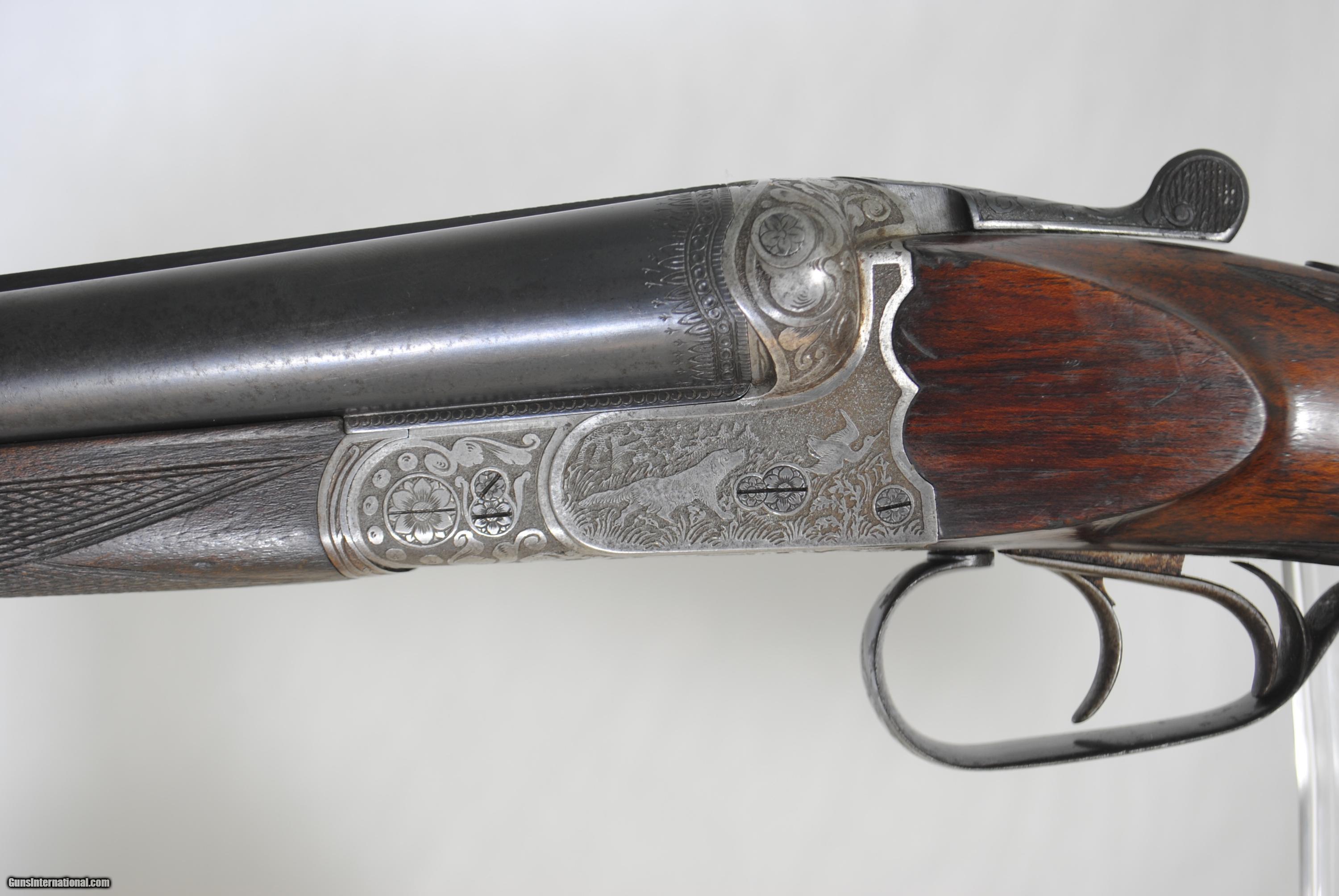 Description: Here is a highly engraved with game scenes, European Guild shotgun in 12 gauge with 30" barrels. Arcaded fences. Anson & Deeley action with Greener style third fastener. Scalloped frame. Tight on face / no loose ribs. Left hand cheek piece - although stock cast is nuetral. Horn grip cap and butt plate. Engraved set screws for lifters and hammers. Engraved 5 row barrel bands. Right bore measures at .729 with 27/1000 choke (Improved Modified). Left bore also at .729 with 34/1000 choke (Full). Weght of gun is 6 LBS 11 1/2 OZ. Shipping is $40. Stock dimensions follow. LOP - 14 3/16" Drop at Comb - 1 3/8" Drop at Heel - 2 1/2" For inquiries please call Guy - 407-721-3748 SOLD Curio/Relic: Yes |