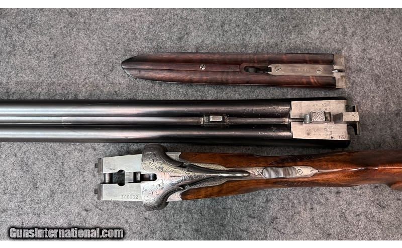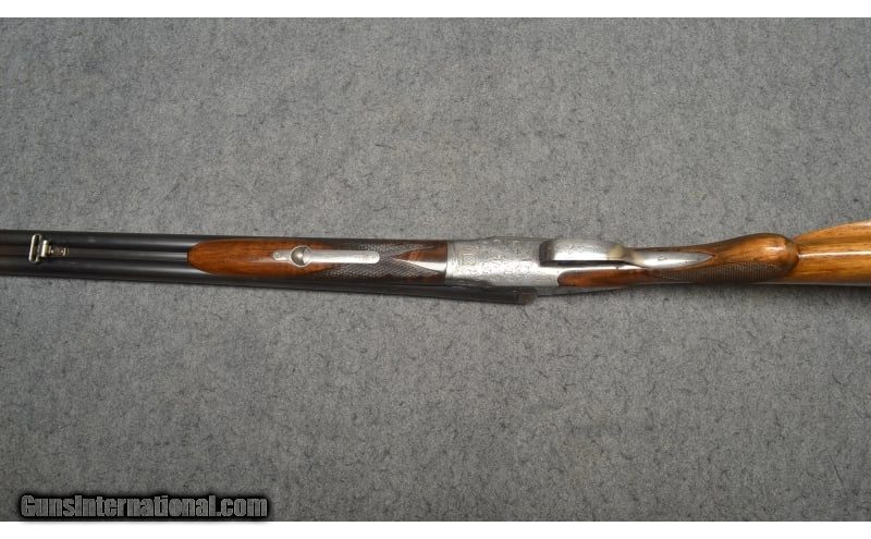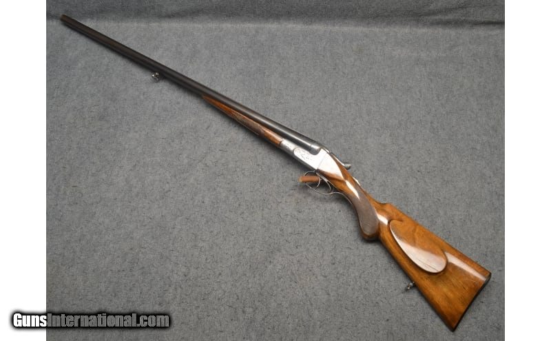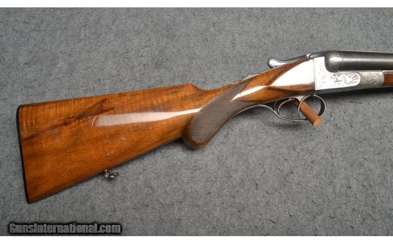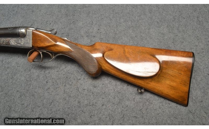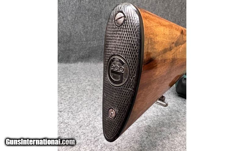Description: This break action side-by-side double barrel shotgun is marked "Geco" and is chambered in 16 Gauge. It contains the superimposed "SS" stamping on the water table. It is also stamped "Nitro" which indicates it is for smokeless powder. The barrels are marked "Krupp Laufstahl" (Laufstahl means fluid steel, not damascus steel) and is the manufacturer of the steel in the barrels. The butt stock has a round knob, a Monte Carlo style check rest, original sling loops top and bottom, a round bead fixed front sight, and beautiful game birds engraving on the receiver. The date code indicates that it was manufactured in 1932. It is in good condition overall showing a great patina, with no apparent rust. The butt stock does show some scratches, but the high gloss finish is very much intact. 16 Gauge SOLD Metal Condition: Great patina Wood Condition: Butt stock and forearm show signs of handling wear and scratches Bore Condition: Bright and shiny Barrels: 28 inch barrels Triggers: Double triggers Stock Dimensions: "14¼ LOP, 44¼ overall length Fore End: Diamond checkered wood fore end Butt Pad: Original "Geco" butt plate Weight: 6 lbs 6 oz Sights: Round bead front sight Chokes: Full Item Location: Wichita, KS |