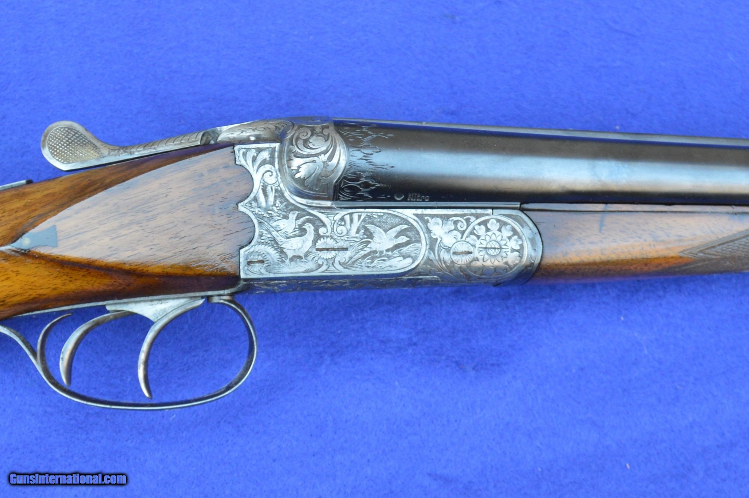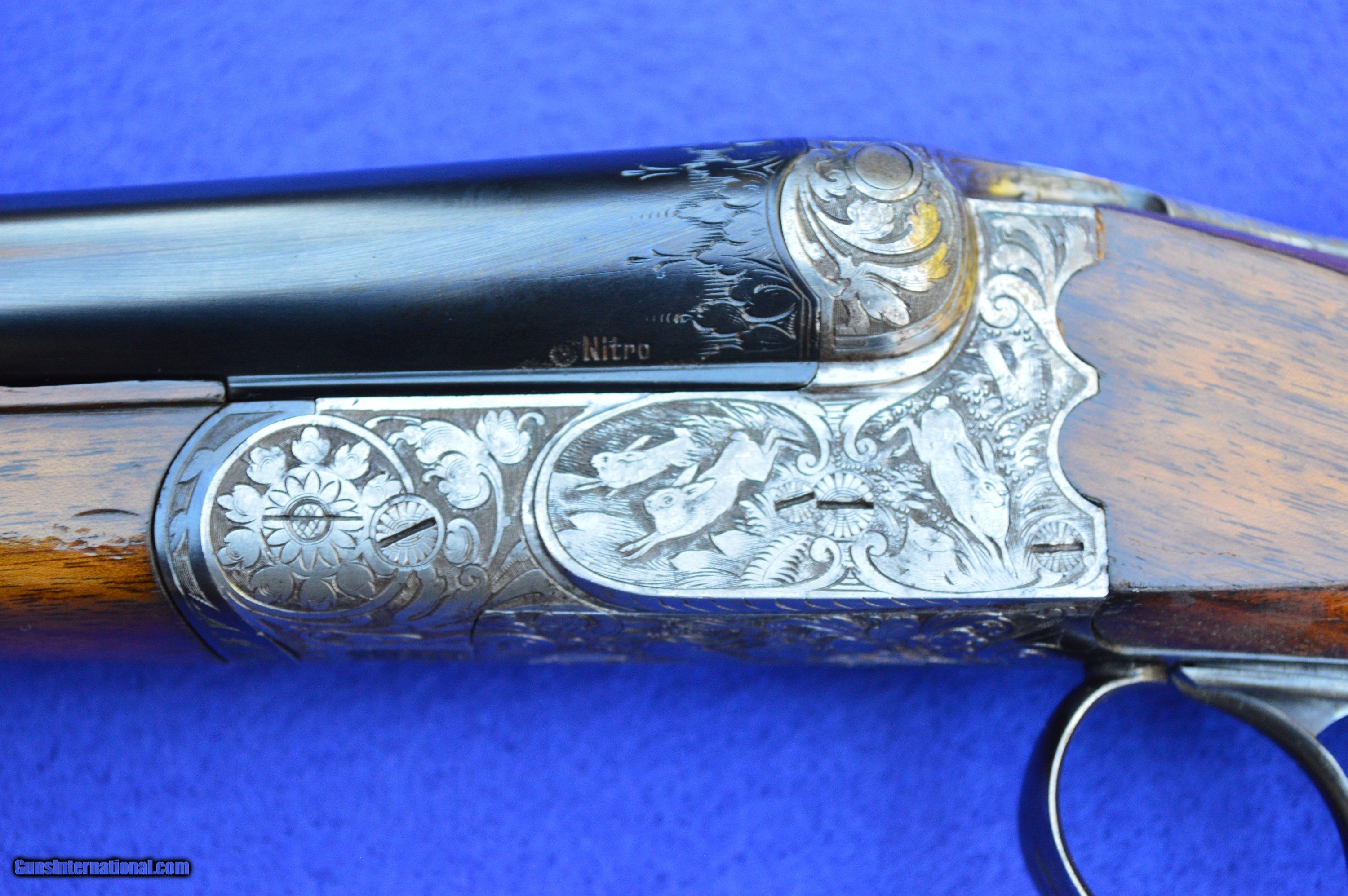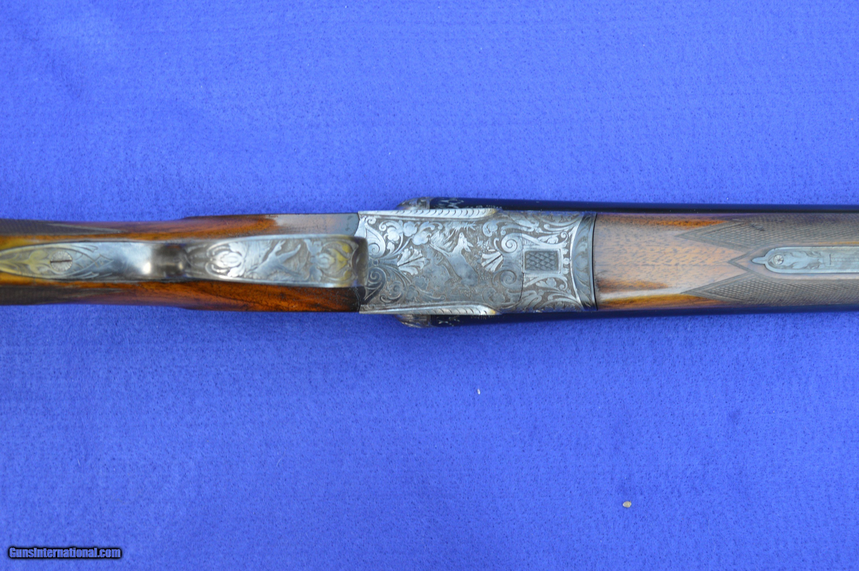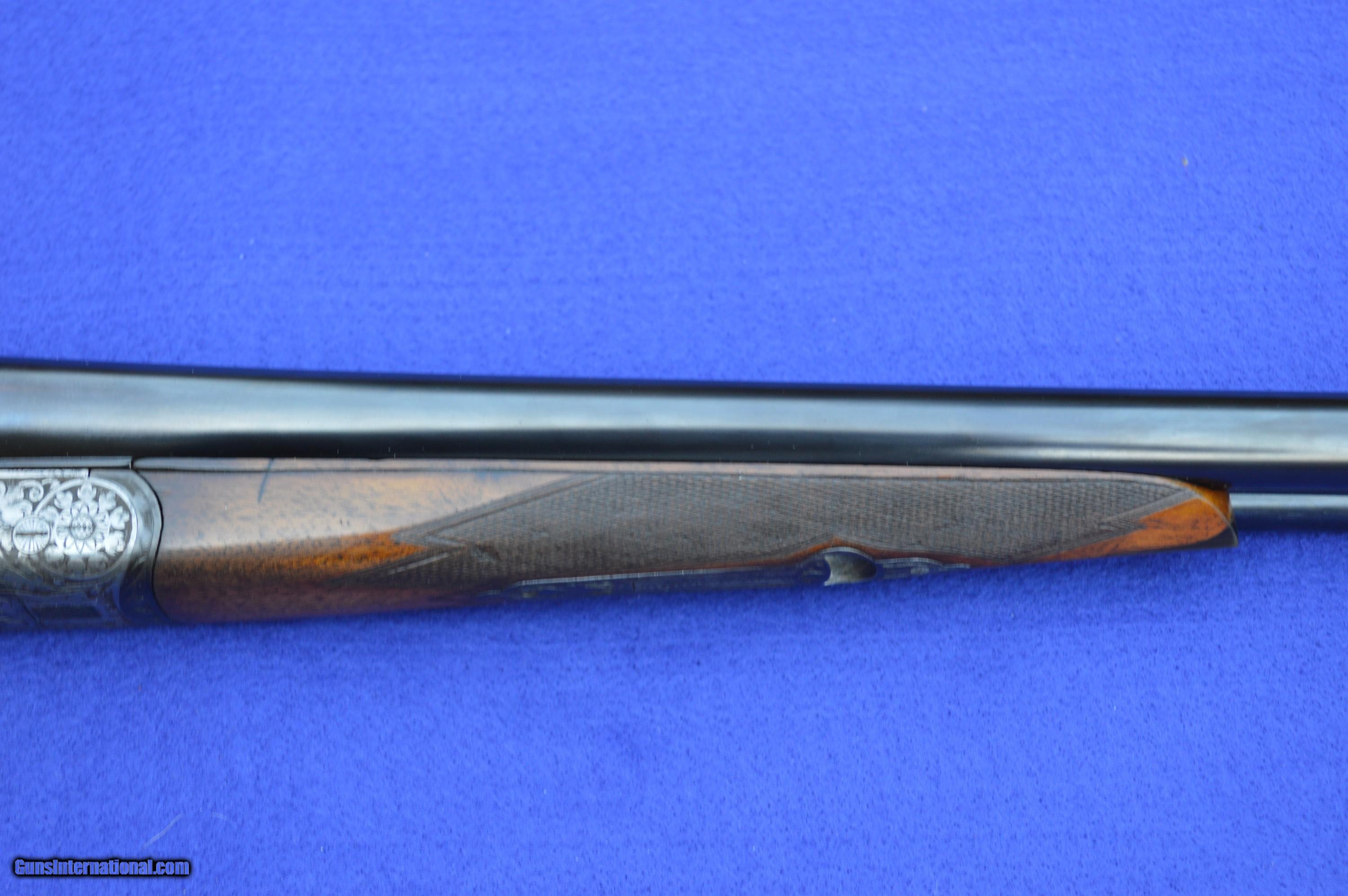 Description: The master gunsmith who created this 16-gauge shotgun, and the person he made it for, are unknown. However, the quality of this gun is evident in its superb balance and handling, light weight, fine engraving, 32-point checkering, Greener cross bolt, fences, and engraved barrels. This shotgun was very likely brought to the United States by a GI after WWII. The original pommel was missing, which suggests that it may have been made of precious metal perhaps engraved with a family crest. The weight and balance of this gun are such that it can be shouldered with the right hand while pushing away tag alders with the left. It is an awesome grouse and quail gun. The 70-centimeter (27-5/8”) nitro-proofed Krupp steel barrels have 70-millimeter (2-3/4”) chambers and are both without constriction (cylinder choke). Both bores are .688” measured at 9 inches from the breech, and the outside diameters of the barrels at the muzzle are both .740”. The minimum wall thickness for the right barrel is .025” and the left barrel .026”. The bores are bright and the exterior of the reconditioned barrels is flawless. The stock and forearm are made of English walnut. Drop at the comb is 1-5/8” and at the heel 2-3/8”. Length of pull from the front trigger to the end of the recoil pad is 14”. The replacement for the pommel is made of ebony. The gun has had a full preventive maintenance service, a $250 value. The gun locks up tightly. Both triggers pull at 4 pounds of pressure. The gun weighs 6 pounds 2 ounces. The price does not include shipping cost, which is paid by buyer. The inspection period is 10 days from receipt. The gun has been hunted and fired on the range on many occasions using standard factory 2-3/4” target loads. However, as for any antique or vintage shotgun, it is recommended that the new owner have it inspected by his or her gunsmith before firing. Please do not hesitate to call with questions Steve at 703-625-4830. SOLD Curio/Relic: Yes |