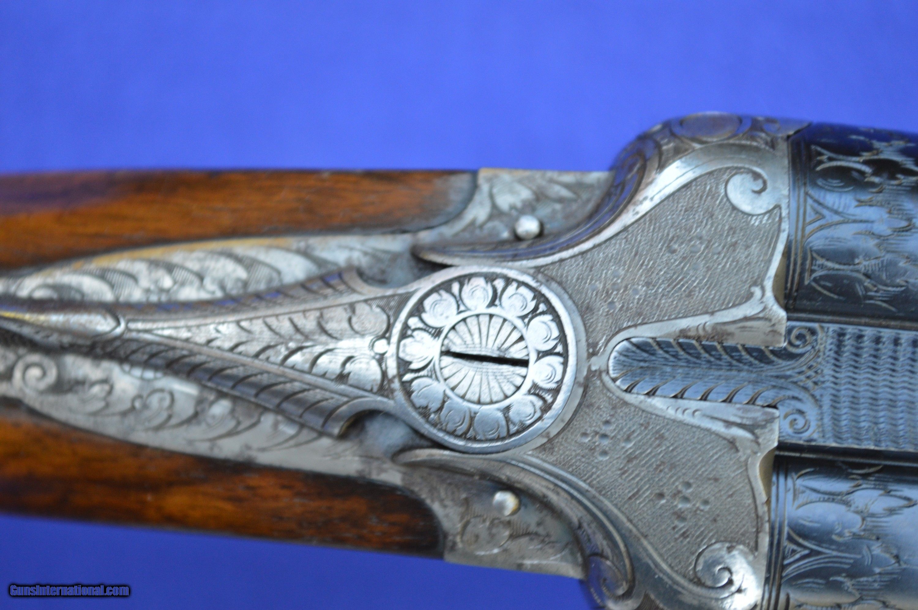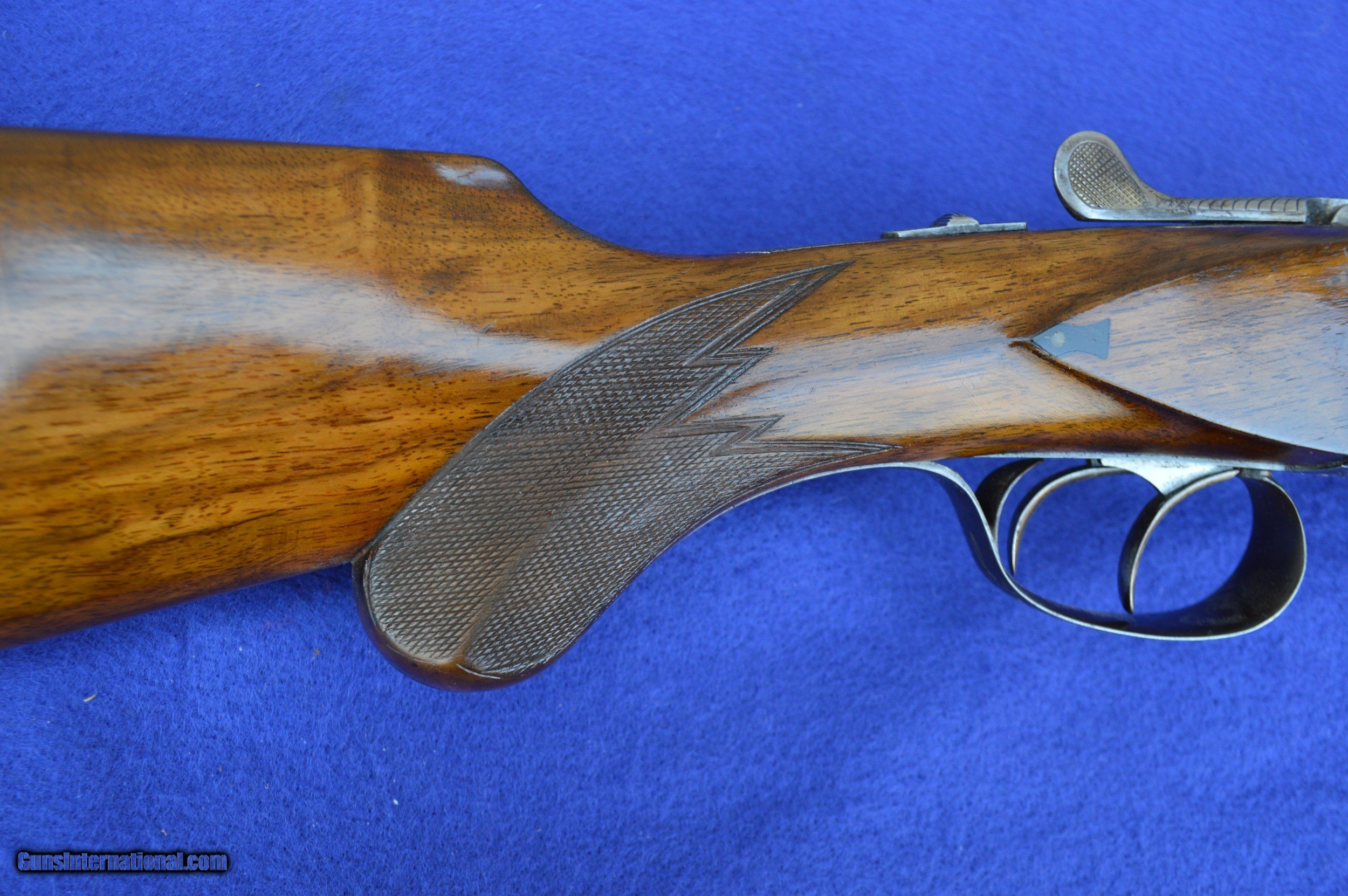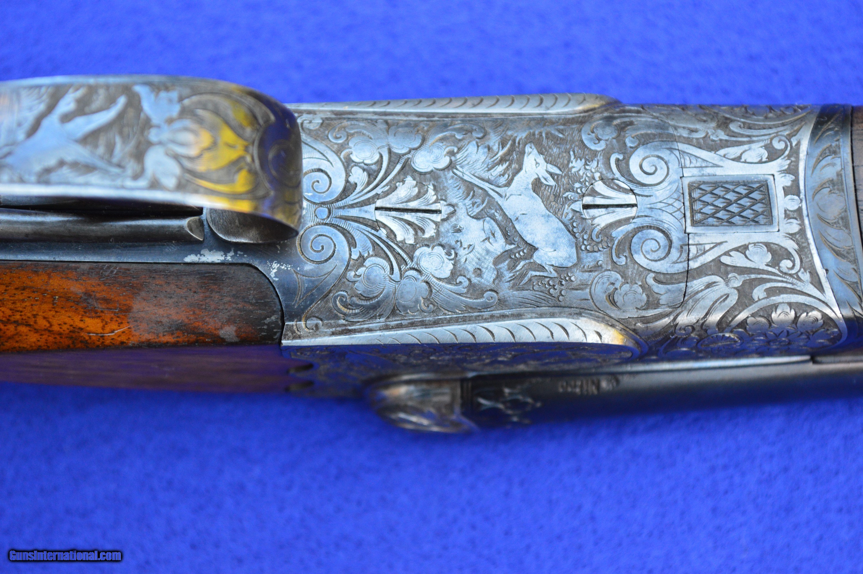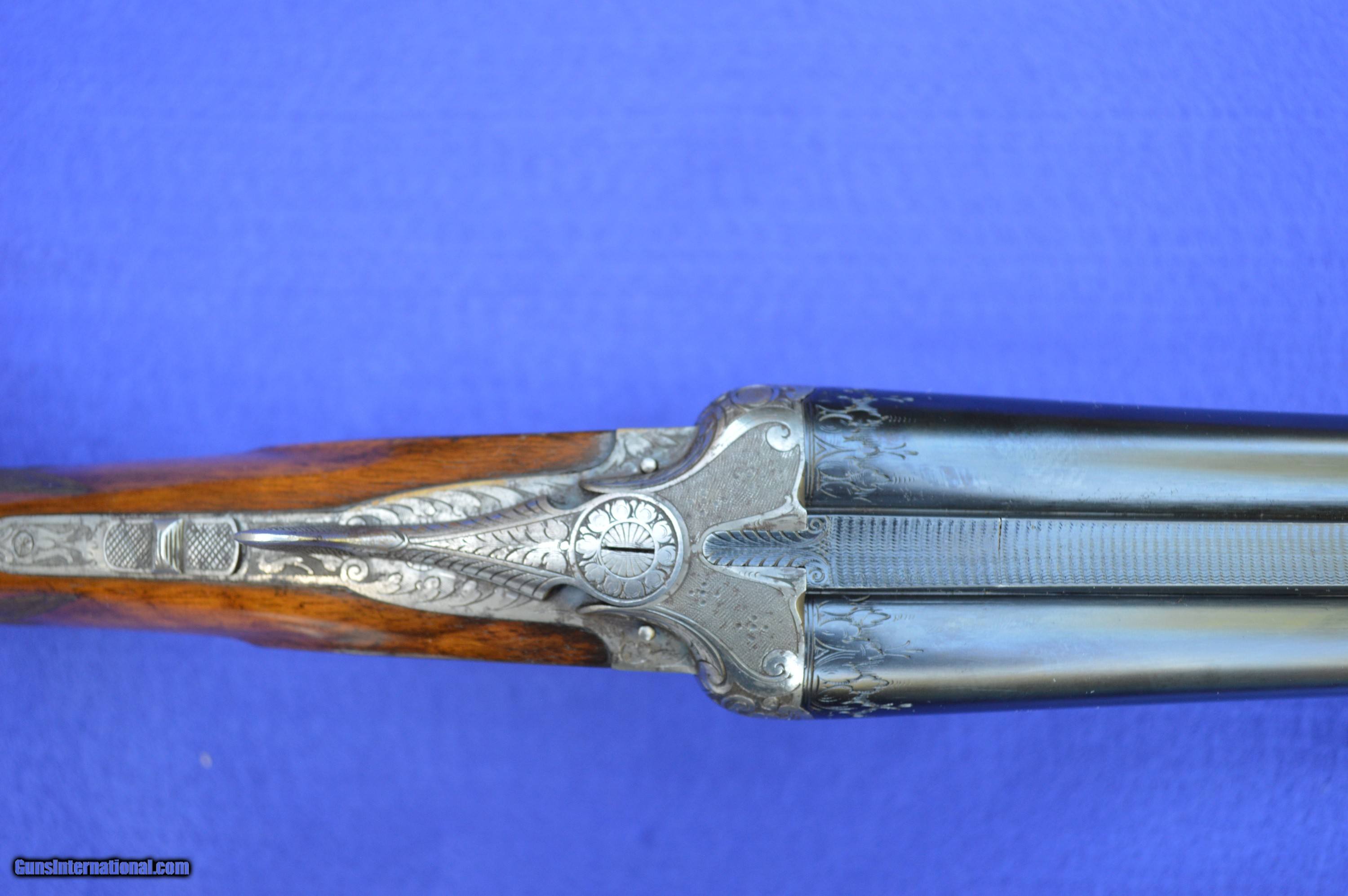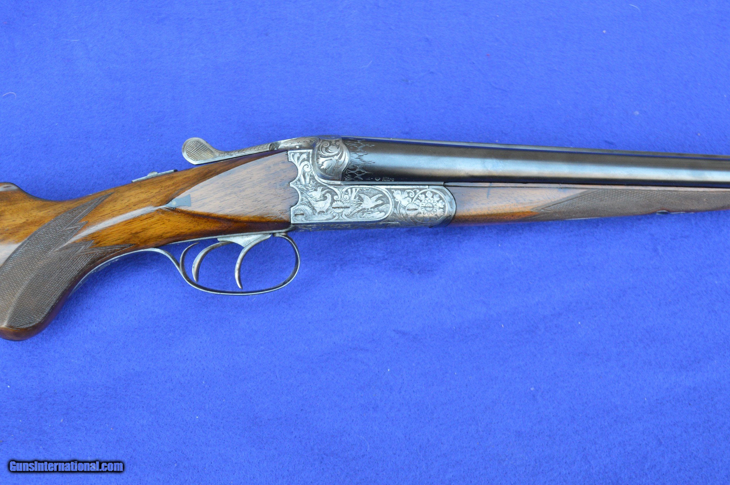 Description: The master gunsmith who created this 16-gauge shotgun, and the person he made it for, are unknown. However, the quality of this gun is evident in its superb balance and handling, light weight, fine engraving, 32-point checkering, Greener cross bolt, fences, and engraved barrels. This shotgun was very likely brought to the United States by a GI after WWII. The original pommel was missing, which suggests that it may have been made of precious metal perhaps engraved with a family crest. The weight and balance of this gun are such that it can be shouldered with the right hand while pushing away tag alders with the left. It is an awesome grouse and quail gun. The 70-centimeter (27-5/8”) nitro-proofed Krupp steel barrels have 70-millimeter (2-3/4”) chambers and are both without constriction (cylinder choke). Both bores are .688” measured at 9 inches from the breech, and the outside diameters of the barrels at the muzzle are both .740”. The minimum wall thickness for the right barrel is .025” and the left barrel .026”. The bores are bright and the exterior of the reconditioned barrels is flawless. The stock and forearm are made of English walnut. Drop at the comb is 1-5/8” and at the heel 2-3/8”. Length of pull from the front trigger to the end of the recoil pad is 14”. The replacement for the pommel is made of ebony. The gun has had a full preventive maintenance service, a $250 value. The gun locks up tightly. Both triggers pull at 4 pounds of pressure. The gun weighs 6 pounds 2 ounces. The price does not include shipping cost, which is paid by buyer. The inspection period is 10 days from receipt. The gun has been hunted and fired on the range on many occasions using standard factory 2-3/4” target loads. However, as for any antique or vintage shotgun, it is recommended that the new owner have it inspected by his or her gunsmith before firing. Please do not hesitate to call with questions Steve at 703-625-4830. SOLD Curio/Relic: Yes |