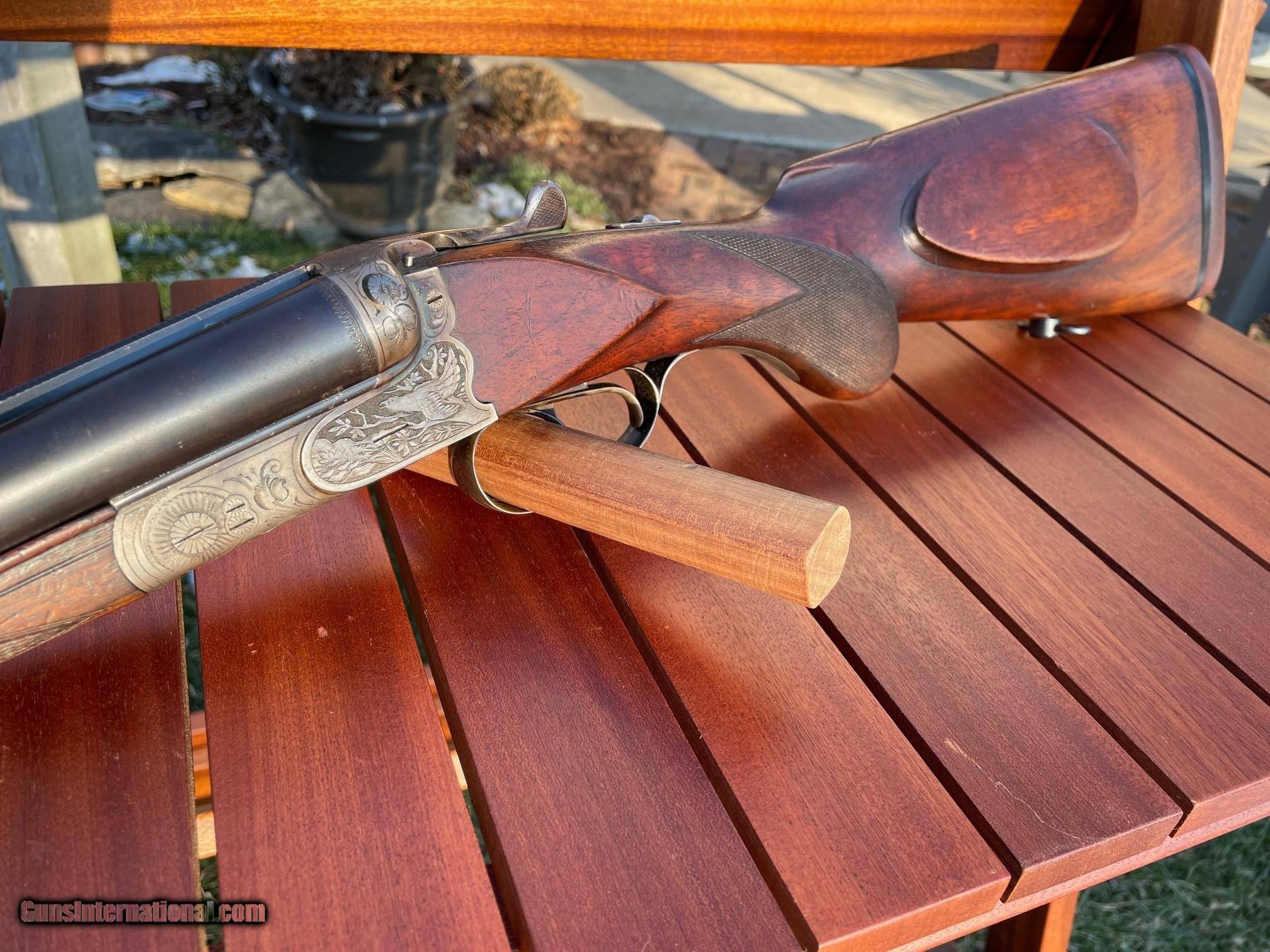 Description: German Side by Side 16 gauge. Full and Full Choked 29.375" barrel. 14.75" LOP 1.375 drop at comb 2.5 drop at heel. 2.5" chambers Cocking indicators, double trigger and ejectors. Locks up tight. Fine engraved scenes and sides. One of a running rabbit and the other a flushing Capercaillie. I pointed to area on the barrel that looks to be touched up. Just wanted to point that out. This would make a excellent gun for the upland hunter or collector. PENDING SALE REDUCED PRICE! $1495. Was $1995. Owner motivated to sell! Shipping to your FFL in Continetal US $50. SOLD Shotgun Gauge: 16 Gauge |