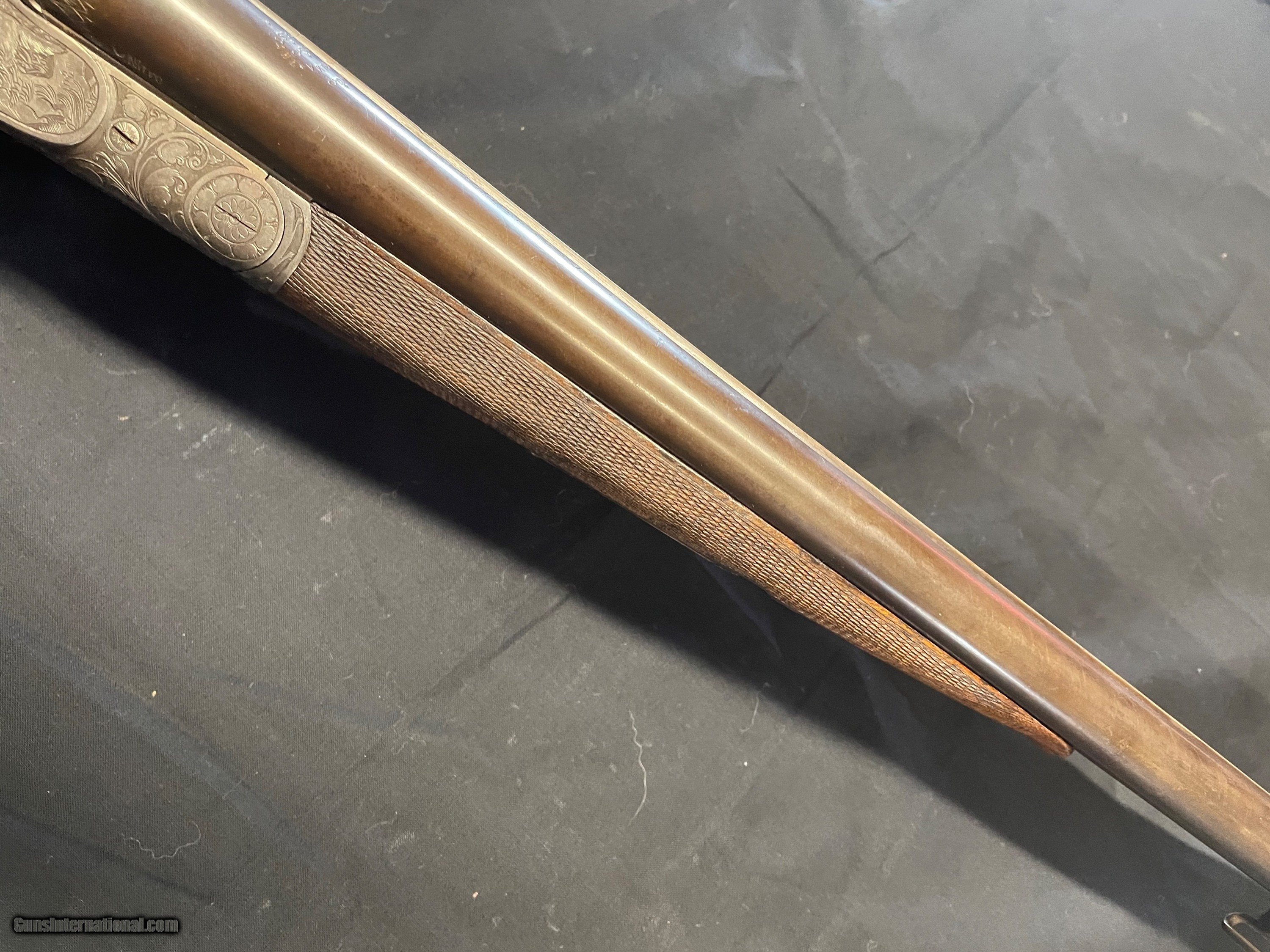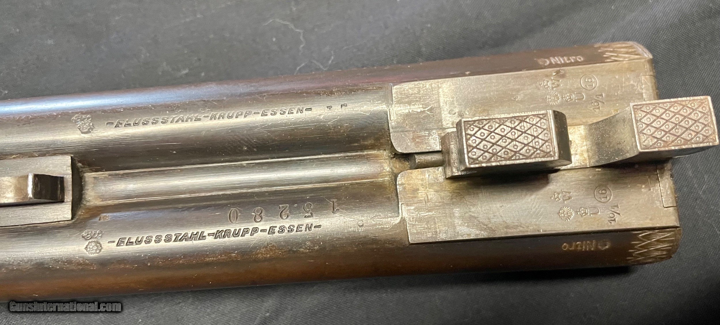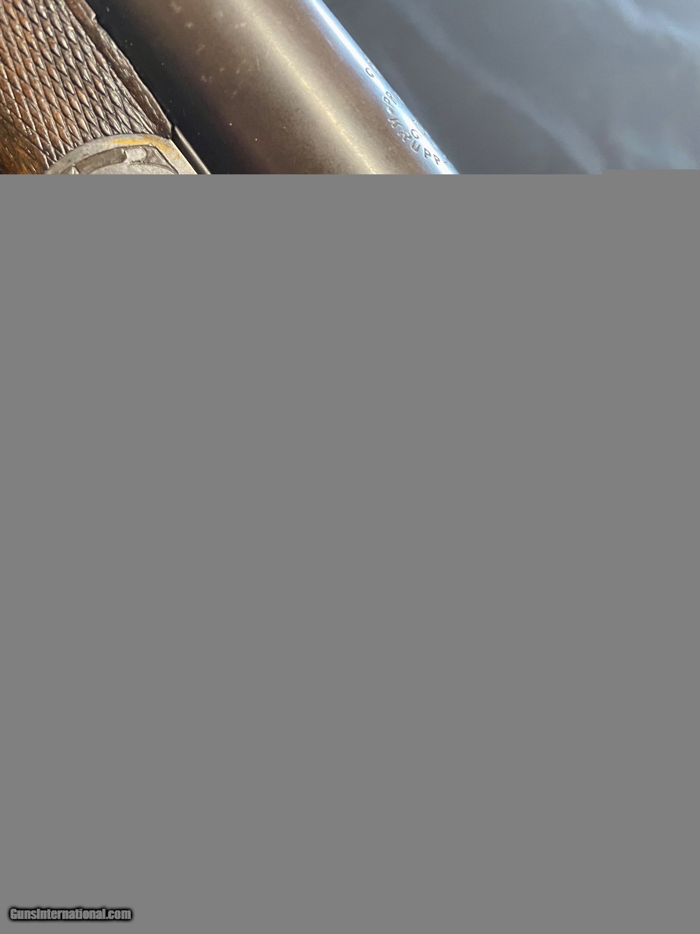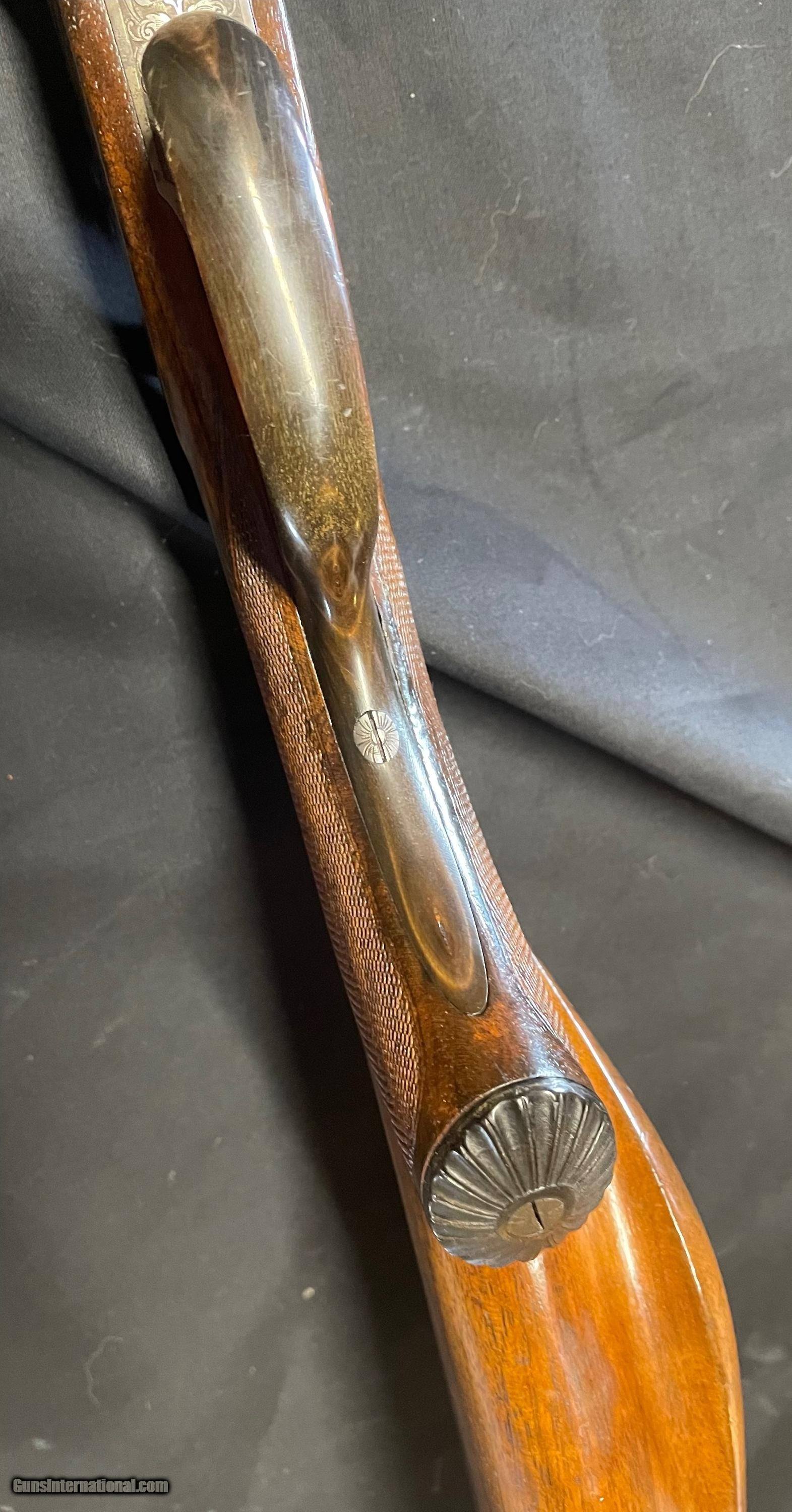 Description: Vintage German 16 ga. SN 13280 hammerless boxlock shotgun, nicely engraved with traditional Germanic Style Engraving. Top of the barrel is chisel engraved Hans Bleisteiner Lauf AD Pegnitz probably the original owner which the gun was made for in Pegnitz Bavania Germany otherwise unmarkedboxlock shotgun. The barrel is further stampedNitro and Prima Krupp Stahl on both sides, the flats with various proofs including bore designation, choke bore barrels, pre 1939 definitive proof and cylinder bore shot. In front of flats is matching serial number,Flussstahl-Krupp-Essen and eagle crown S smoothbore proof. Features of the shotgun include matte rib, cocking indicators, double triggers, sling swivels and walnut stocks. Pistol grip buttstock is finely checkered at the wrist withincorporated cheek piece capped in horn to match trigger guard unfinished shortening with no buttplate. Receiver is 95% engraved coverage in floral tendrils with bordered deer and hunt dog panel scenes on each side, light engraving onbreech end of 29 3/4" long barrels, 2 9/16th chambers matching engraving on forend hardware. Stock has been refinished and a pad has been added. Action functions nicely with good bores. Length of Pull: 14 1/4" SOLD call with questions 860-595-9515 jay szymaszek SOLD Shotgun Gauge: 16 Gauge Manufacturer: German Guildgun Model: SxS Serial Number: 13280 Chambers: 2 9/16” Condition: Good Metal Condition: Good Wood Condition: Good Bore Condition: Good Stock Comb: 1 1/4” Stock Heel: 1 1/2” Butt Pad: Yes LOP: 14 3/4“ |