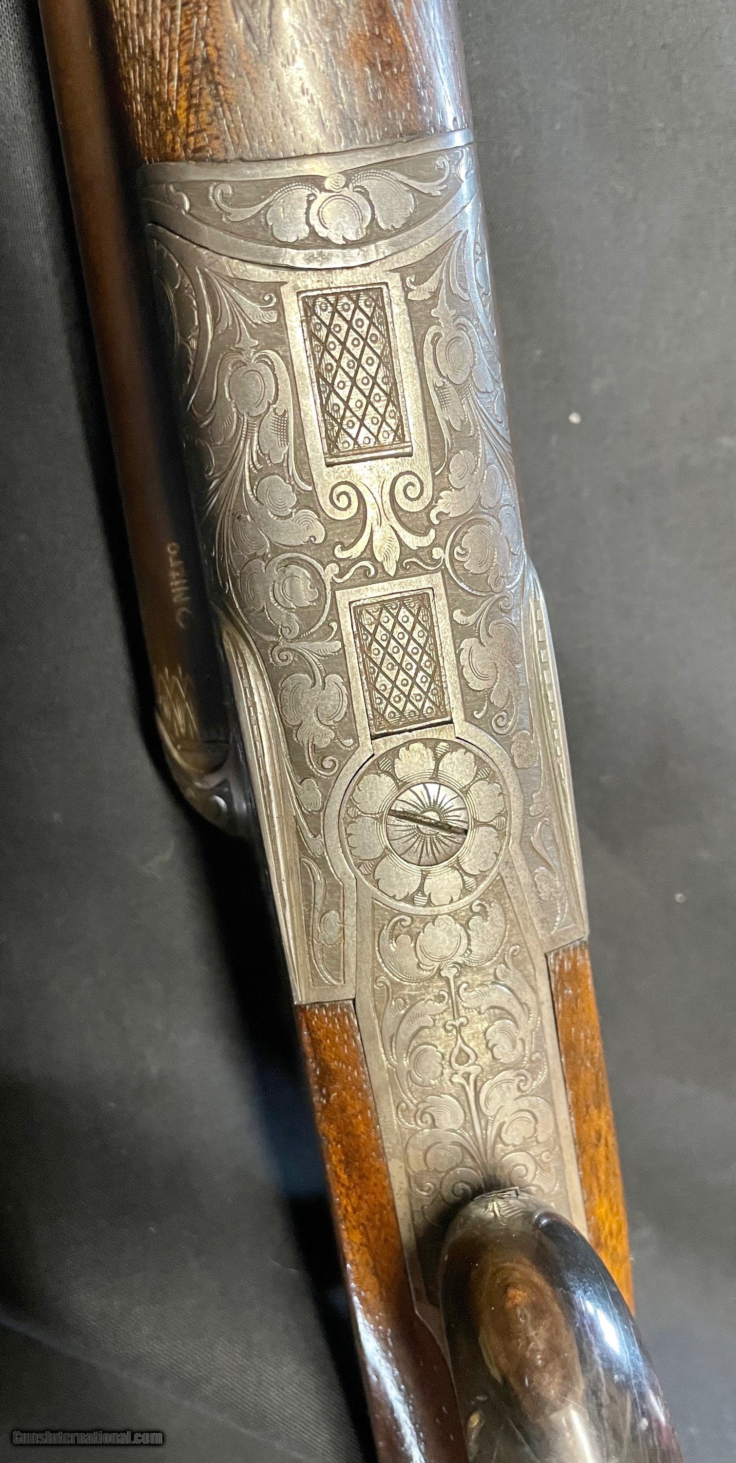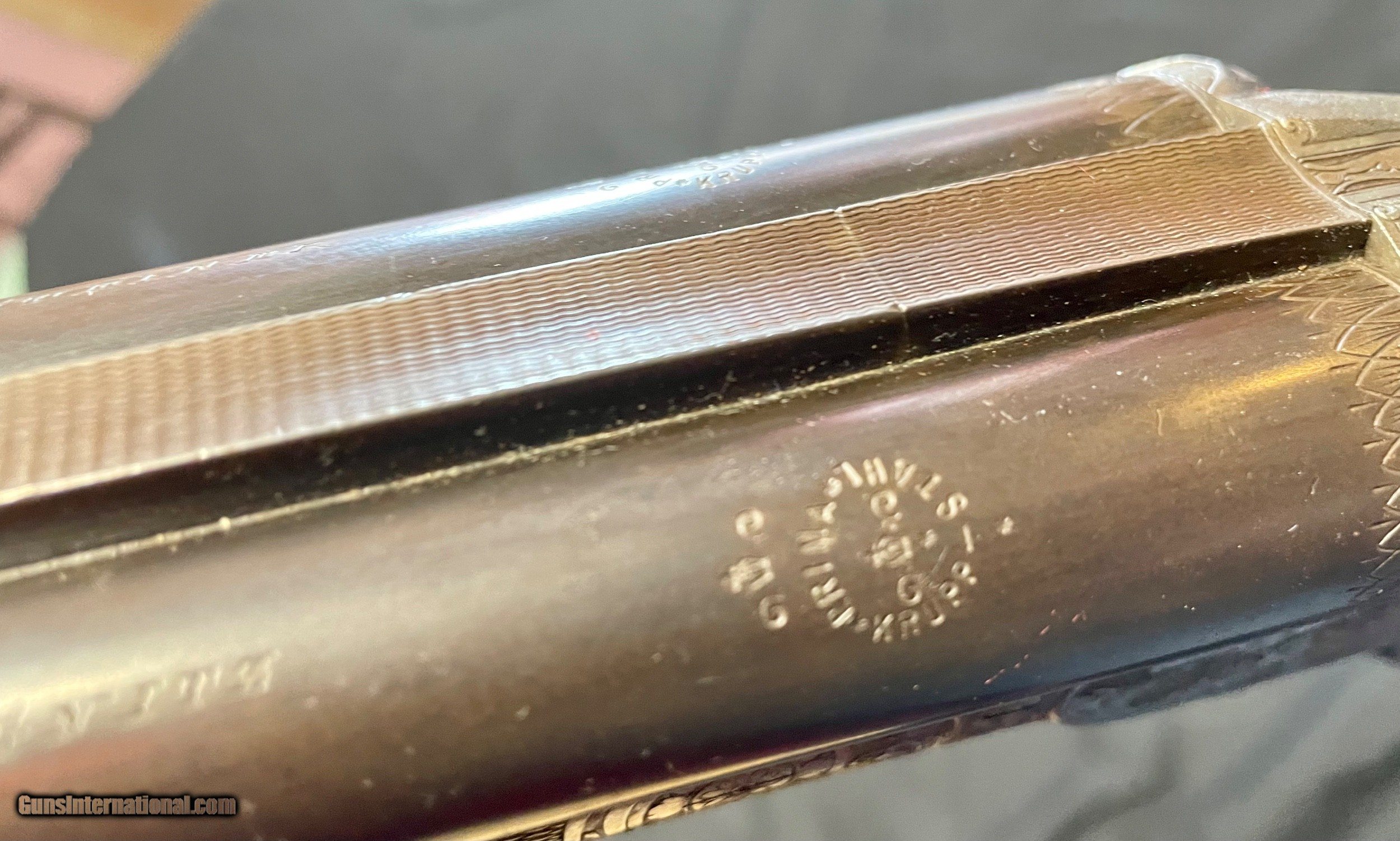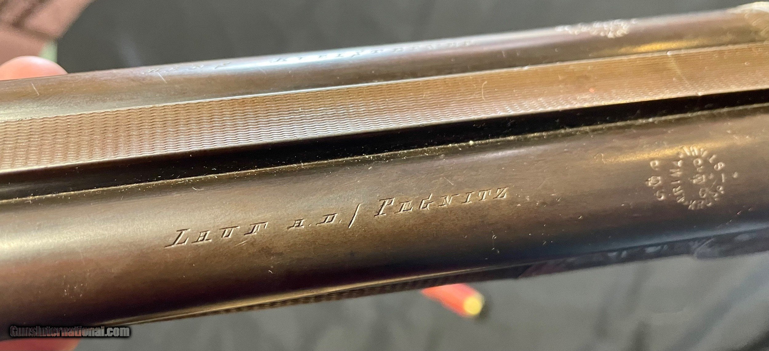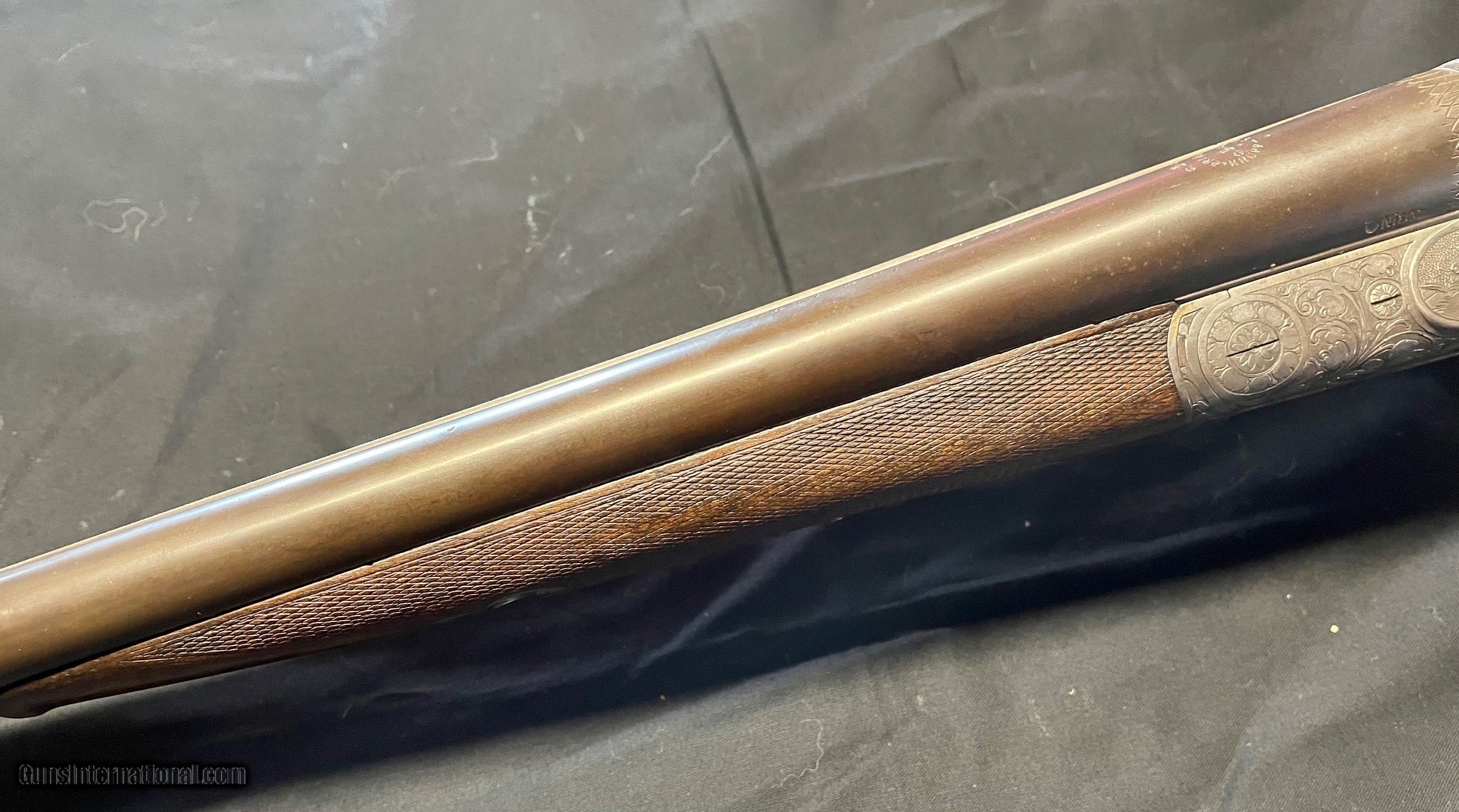 Description: Vintage German 16 ga. SN 13280 hammerless boxlock shotgun, nicely engraved with traditional Germanic Style Engraving. Top of the barrel is chisel engraved Hans Bleisteiner Lauf AD Pegnitz probably the original owner which the gun was made for in Pegnitz Bavania Germany otherwise unmarkedboxlock shotgun. The barrel is further stampedNitro and Prima Krupp Stahl on both sides, the flats with various proofs including bore designation, choke bore barrels, pre 1939 definitive proof and cylinder bore shot. In front of flats is matching serial number,Flussstahl-Krupp-Essen and eagle crown S smoothbore proof. Features of the shotgun include matte rib, cocking indicators, double triggers, sling swivels and walnut stocks. Pistol grip buttstock is finely checkered at the wrist withincorporated cheek piece capped in horn to match trigger guard unfinished shortening with no buttplate. Receiver is 95% engraved coverage in floral tendrils with bordered deer and hunt dog panel scenes on each side, light engraving onbreech end of 29 3/4" long barrels, 2 9/16th chambers matching engraving on forend hardware. Stock has been refinished and a pad has been added. Action functions nicely with good bores. Length of Pull: 14 1/4" SOLD call with questions 860-595-9515 jay szymaszek SOLD Shotgun Gauge: 16 Gauge Manufacturer: German Guildgun Model: SxS Serial Number: 13280 Chambers: 2 9/16” Condition: Good Metal Condition: Good Wood Condition: Good Bore Condition: Good Stock Comb: 1 1/4” Stock Heel: 1 1/2” Butt Pad: Yes LOP: 14 3/4“ |