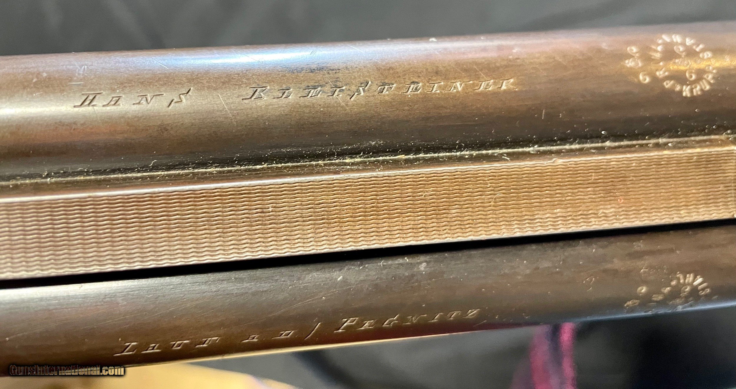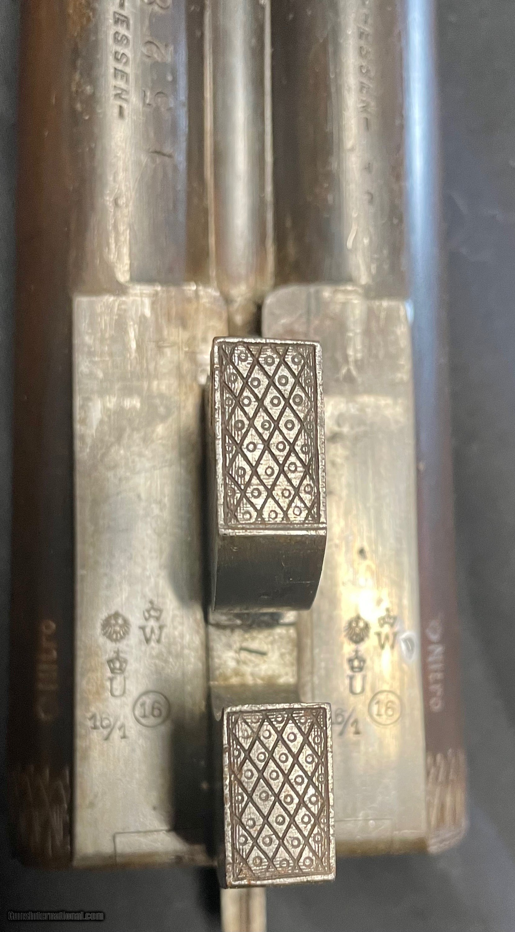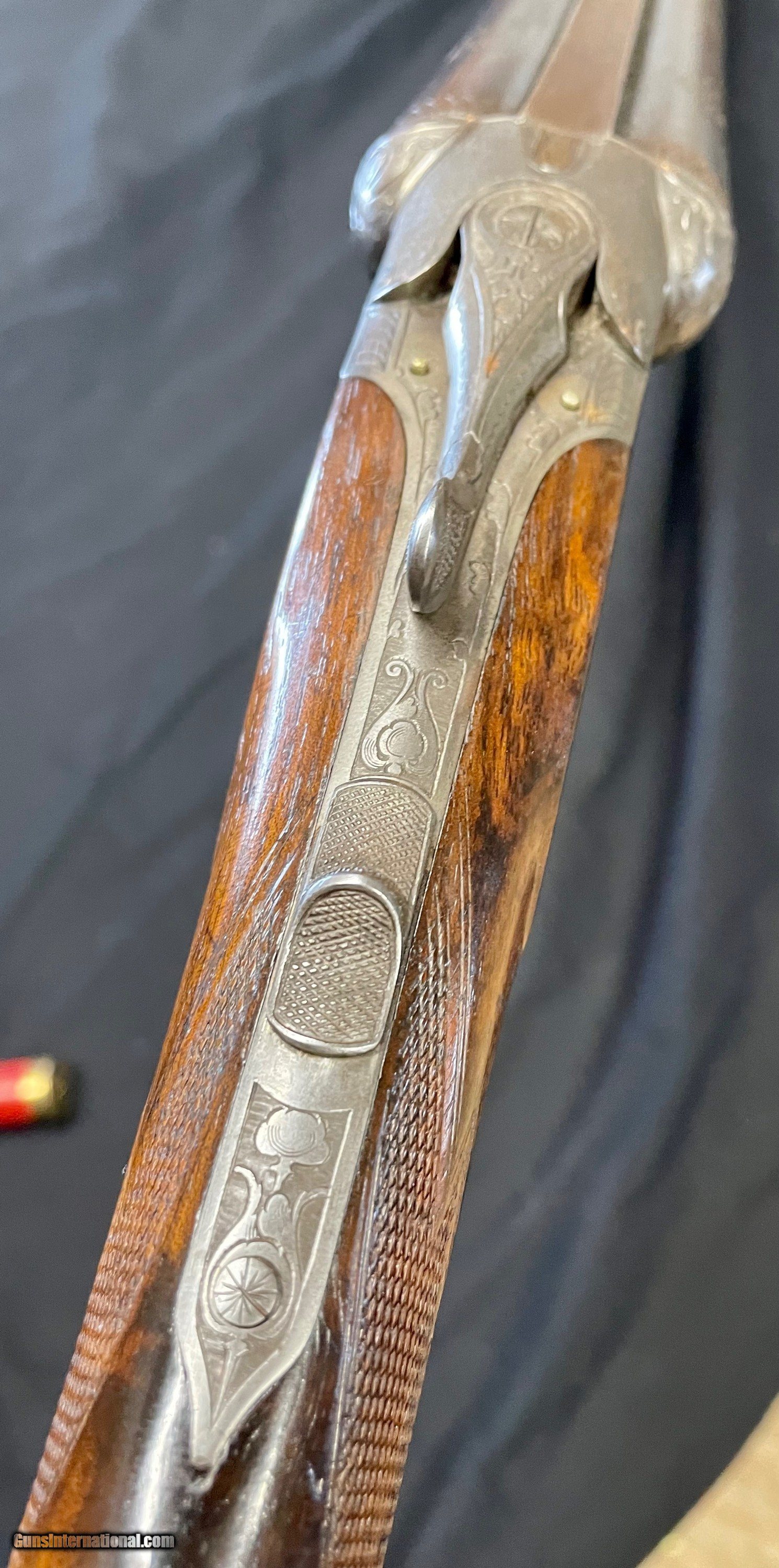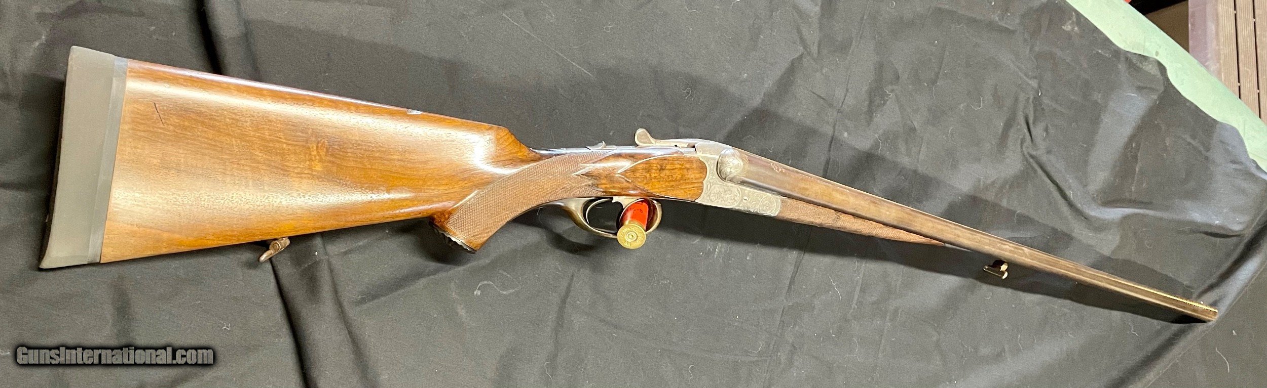Description: Vintage German 16 ga. SN 13280 hammerless boxlock shotgun, nicely engraved with traditional Germanic Style Engraving. Top of the barrel is chisel engraved Hans Bleisteiner Lauf AD Pegnitz probably the original owner which the gun was made for in Pegnitz Bavania Germany otherwise unmarkedboxlock shotgun. The barrel is further stampedNitro and Prima Krupp Stahl on both sides, the flats with various proofs including bore designation, choke bore barrels, pre 1939 definitive proof and cylinder bore shot. In front of flats is matching serial number,Flussstahl-Krupp-Essen and eagle crown S smoothbore proof. Features of the shotgun include matte rib, cocking indicators, double triggers, sling swivels and walnut stocks. Pistol grip buttstock is finely checkered at the wrist withincorporated cheek piece capped in horn to match trigger guard unfinished shortening with no buttplate. Receiver is 95% engraved coverage in floral tendrils with bordered deer and hunt dog panel scenes on each side, light engraving onbreech end of 29 3/4" long barrels, 2 9/16th chambers matching engraving on forend hardware. Stock has been refinished and a pad has been added. Action functions nicely with good bores. Length of Pull: 14 1/4" SOLD call with questions 860-595-9515 jay szymaszek SOLD Shotgun Gauge: 16 Gauge Manufacturer: German Guildgun Model: SxS Serial Number: 13280 Chambers: 2 9/16” Condition: Good Metal Condition: Good Wood Condition: Good Bore Condition: Good Stock Comb: 1 1/4” Stock Heel: 1 1/2” Butt Pad: Yes LOP: 14 3/4“ |