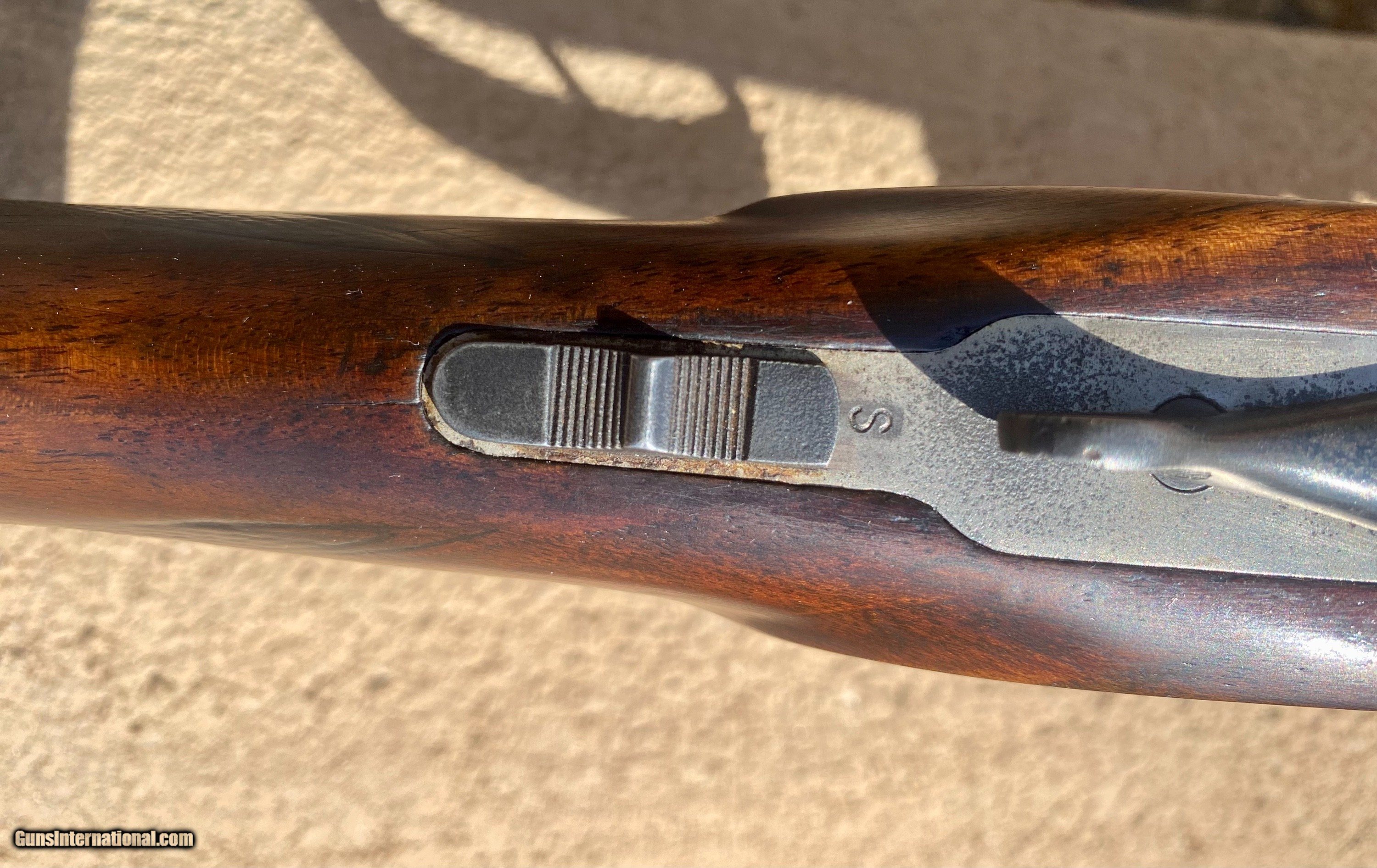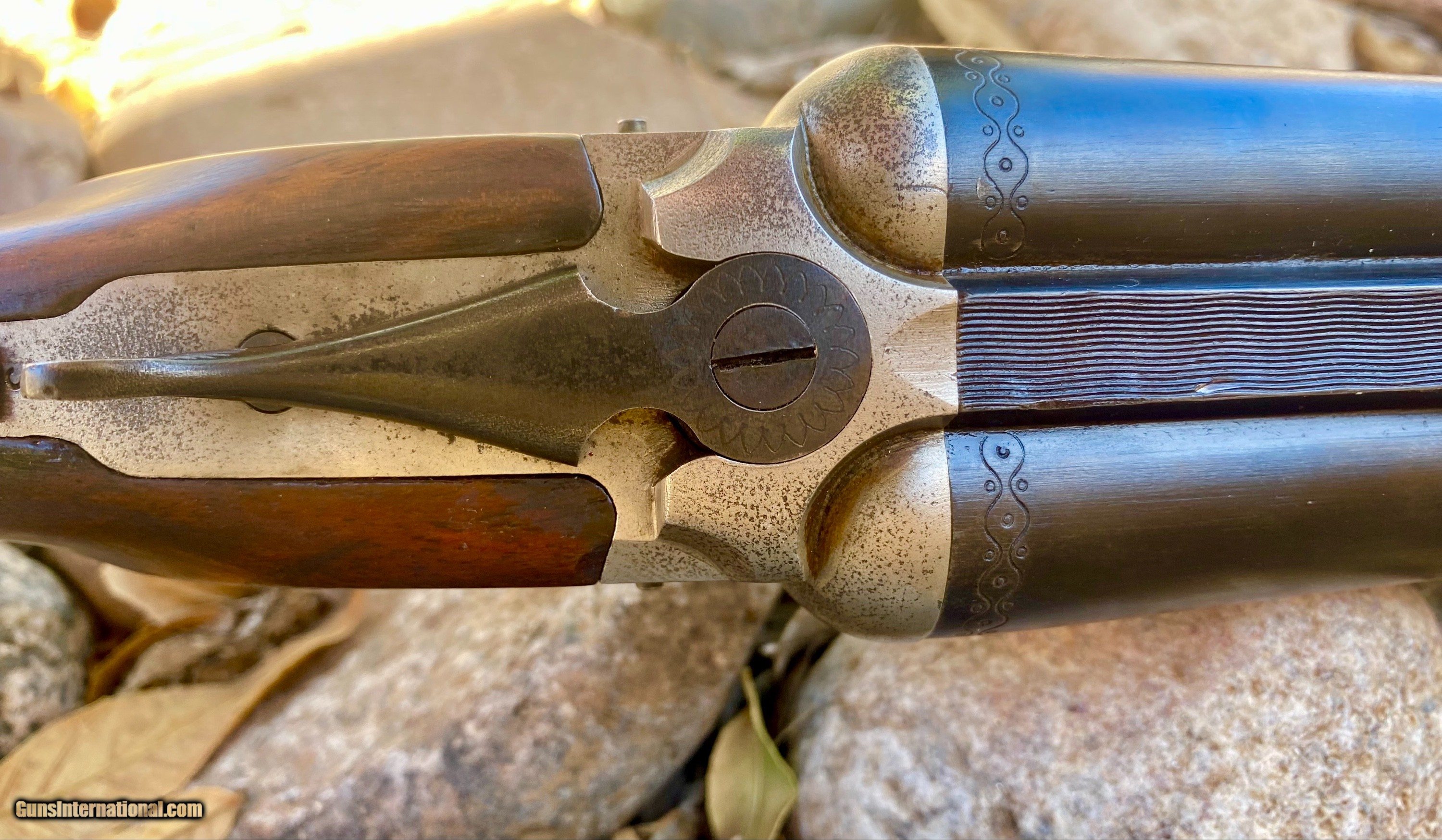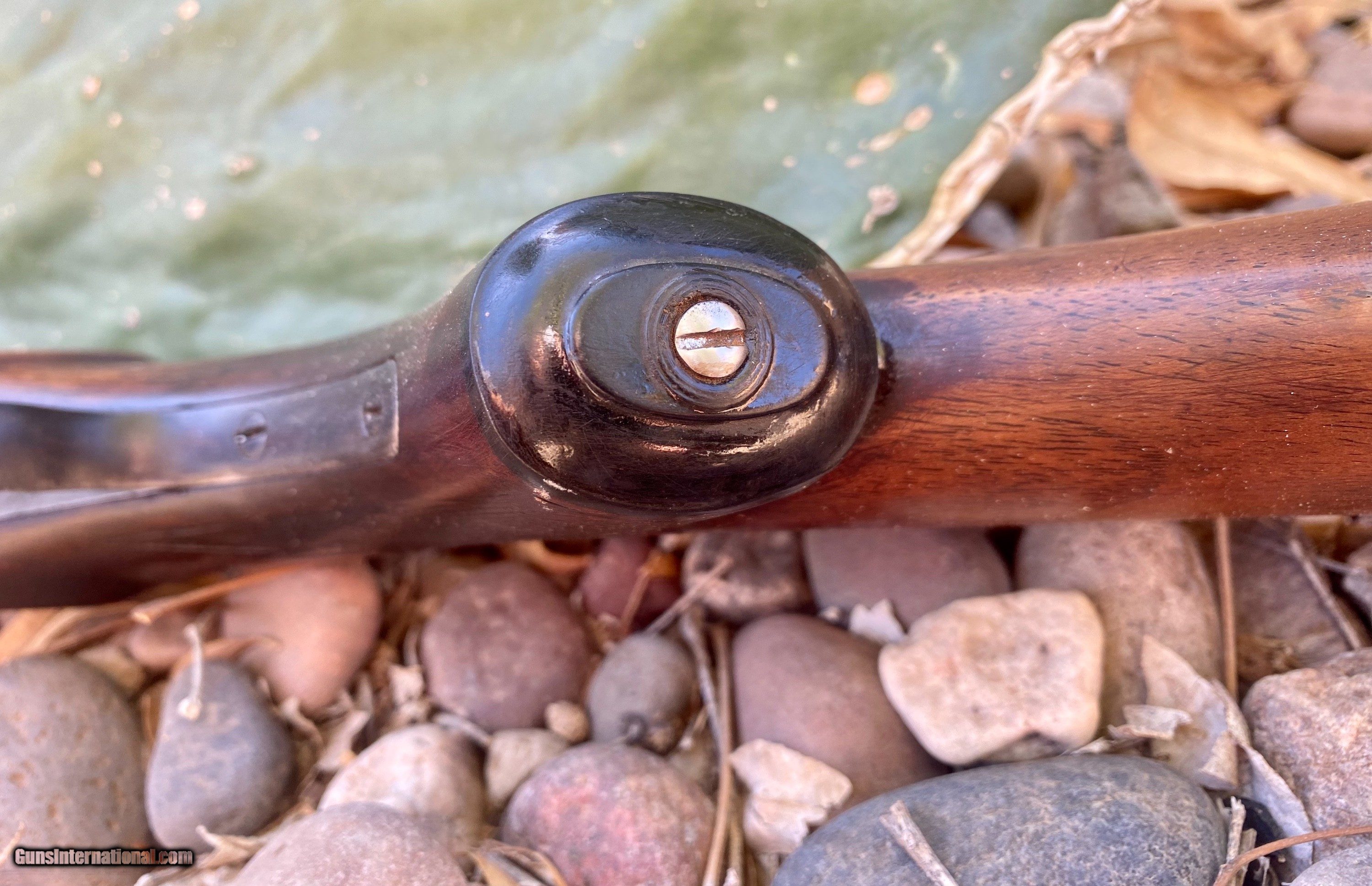 Description: 12 GA scallped back boxlock ejector with cocking indicators. Made in West Germany. Weighs 6 1/2#. 28" barrels with nice blue. The bores are bright and measure .719 right and .719 left. Choks are .020 right and .035 left. Double triggers. Strong, nicely timed ejectors. 2 3/4" chambers. The action is tight and on face. The wood is in good shape with no missing pieces or cracks. Oil finish. LOP is 14 3/4" to a 1/2" rubber pad. DAC 1 1/4", DAH 2". Pistol grip stock with a splinter fore-end. This gun will someone a really nice, lightweight shooter at a bargain price. SOLD Shotgun Gauge: 12 Gauge |