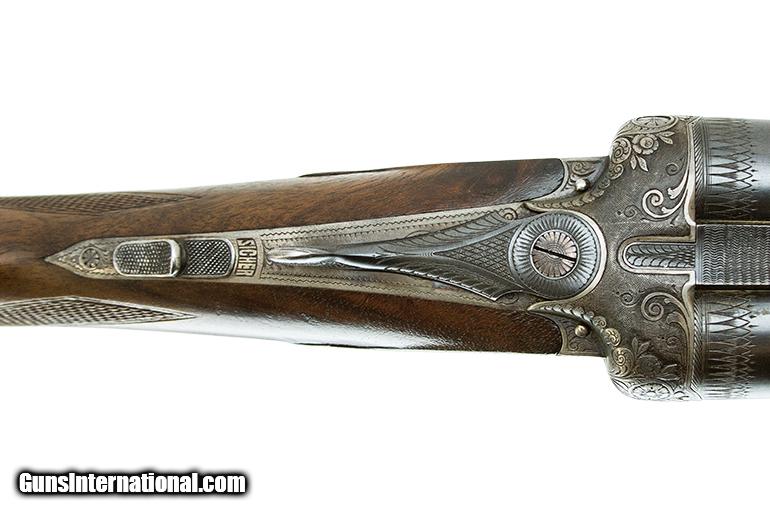 Description: 29 1/2" BARRELS FULL AND FULL 2 1/2" CHAMBERS DOUBLE TRIGGER EJECTORS SPLINTER FOREARM PISTOL GRIP ORIGINAL CONDITION WITH LIGHT BLUE WEAR AND LIGHT HANDLING MARKS IN WOOD 6LBS 2 OZ X 2 1/2 X 1 1/2 X 14 SOLD |