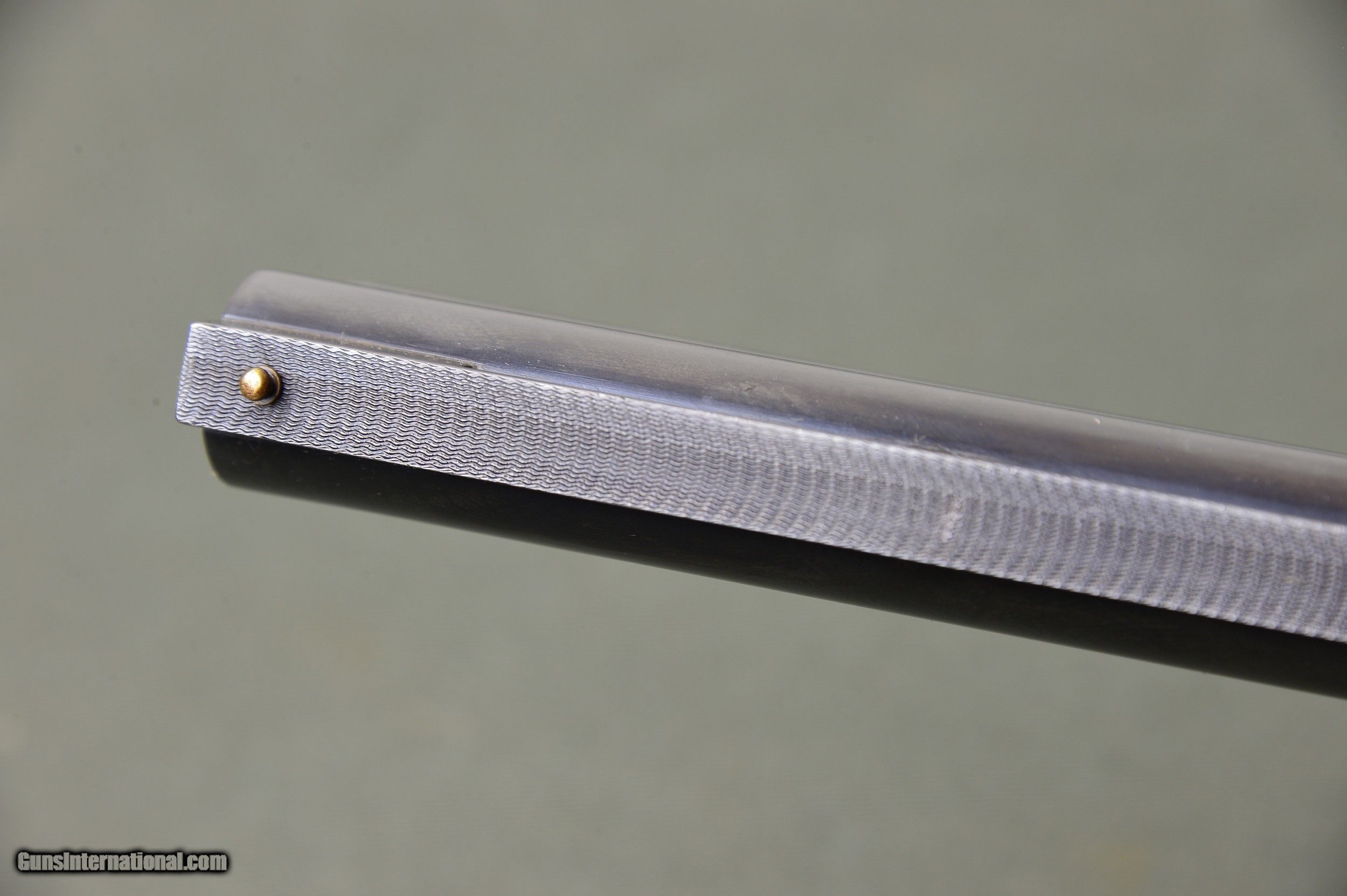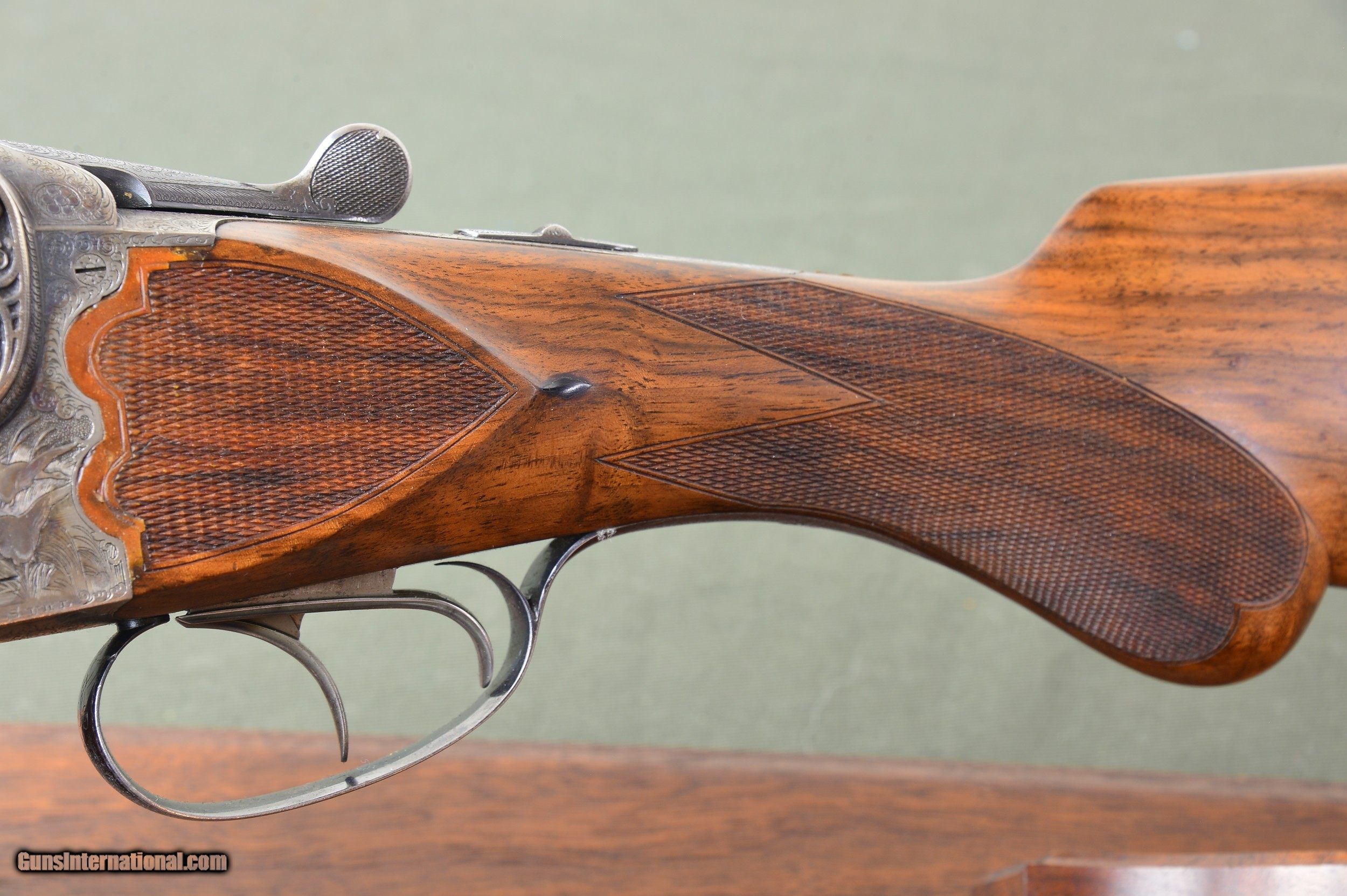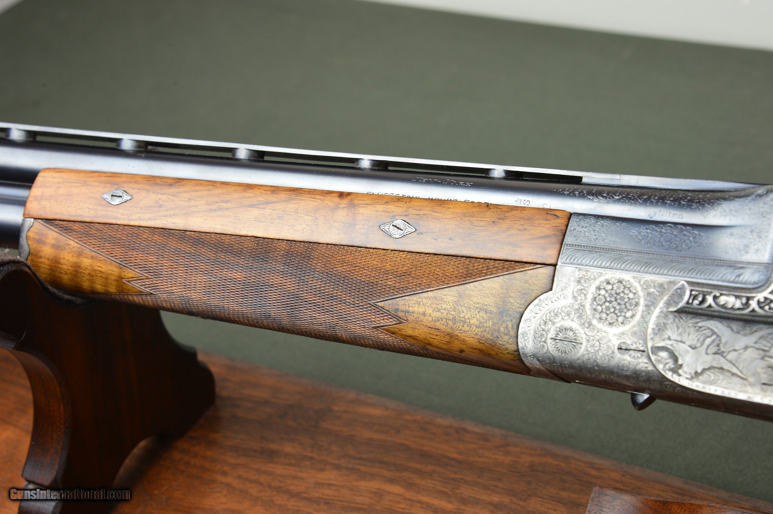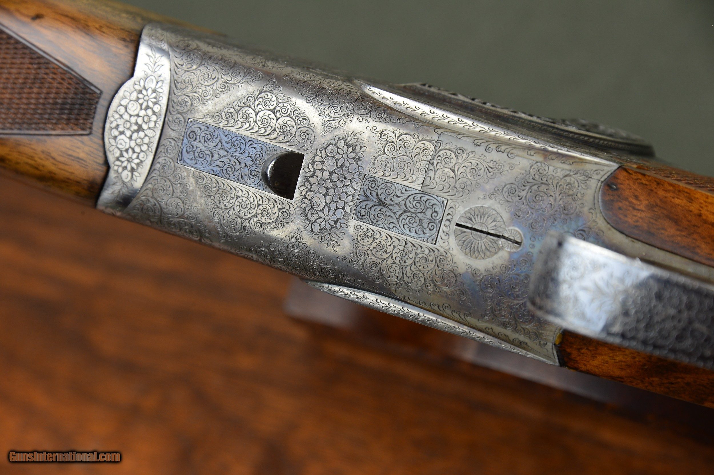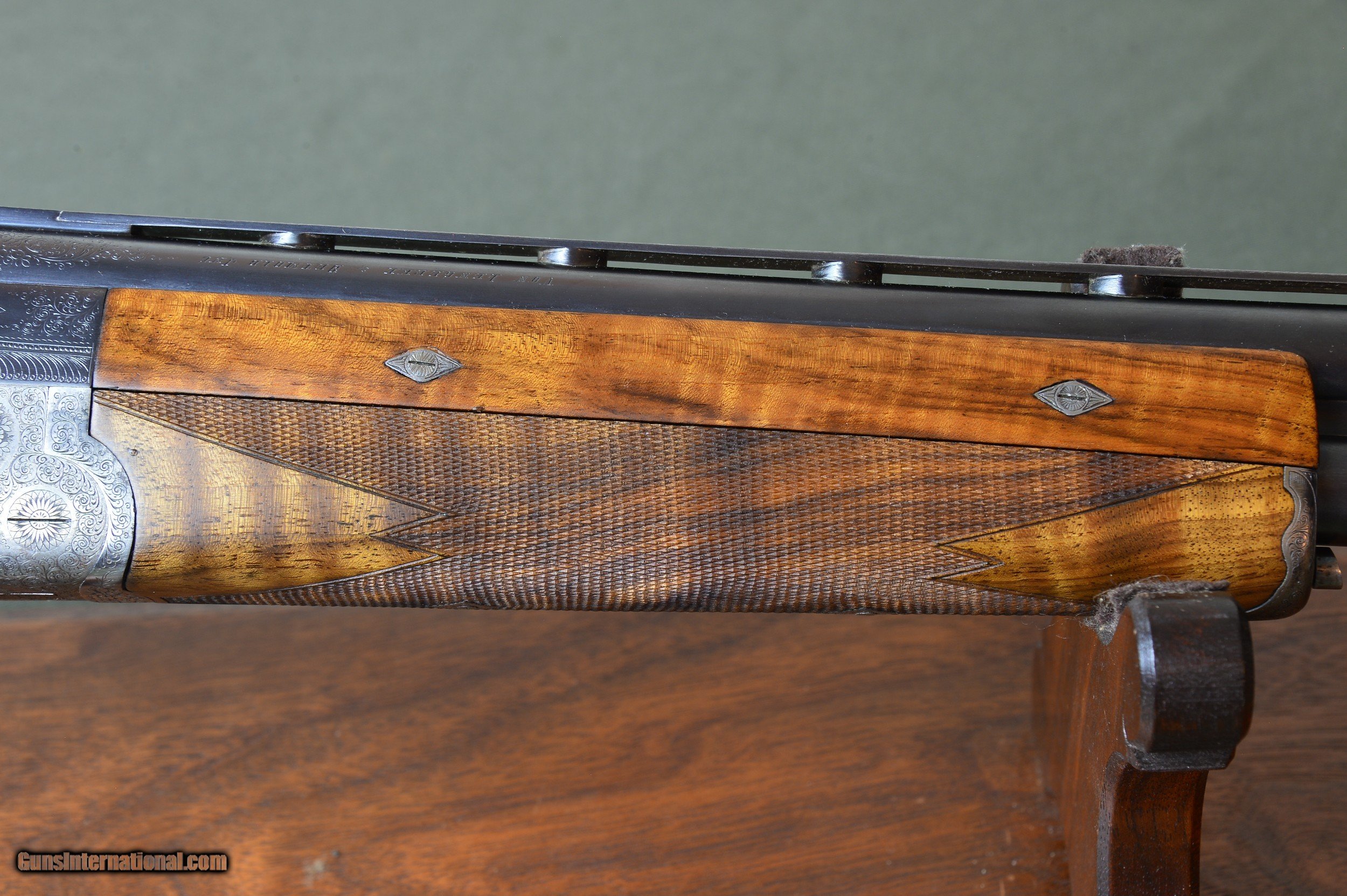 Description: *** SOLD *** Handsome Greifelt over/under 12 gauge shotgun with profuse engraving and gorgeous highly figured European walnut with very fine and crisp checkering. The action and forearm iron are covered in game scene and rose & scroll engraving. This Greifelt & Co. over/under was made in Suhl, Germany and imported by Von Langerke & Detmold of New York. It has double triggers, auto ejectors, auto safety, Kersten cross-bolt, and two piece forearm. Serial number is 30301. Made circa 1905 - 1930 and it weighs 7lbs 10oz. *** The 30” nitro steel barrels are equipped with ejectors and topped by a raised ventilated rib. They are chambered for 2-3/4” shotshells. The right side of the top barrel is inscribed “Von Langerke & Detmold Inc”. The left side of the top barrel is inscribed “New – York”. The bottom barrel is bored 0.722 with a constriction of 0.042 for Full choke. The top barrel is also bored 0.722 and has a constriction of 0.042 for Full choke. This would be a great pheasant gun as it is or the chokes could be easily and inexpensively opened up. *** The pistol grip stock and semi-beavertail forearm are made of highly figured European walnut with checkered side panels. The stock is beautifully colored in a caramel background with dark chocolate swirls flowing through it. Satin finish with very fine crisp checkering. There is a professionally repaired three inch vertical scratch visible on the right side of the buttstock. Let me emphasize that it is not a crack, just a long scratch. See photo. Otherwise, there are only a few very minor handling marks. Stock dimensions are 15-3/8” including a 1” leather covered recoil pad by 1-1/2” by 2”. Very slightly cast off for the righthanded shooter. *** This is a great handling very high quality German made over/under. Profusely engraved and with outstanding wood you will be proud to uncase it at the range or carry it afield. *** I am an FFL and will need a signed copy of your dealer’s FFL license. The photographs are part of the description. Not for sale where prohibited by state or local laws. Buyer is responsible for all shipping, insurance, and any other related charges. I give a 3-day non-firing inspection period and will only accept returns at buyer’s expense. SOLD |