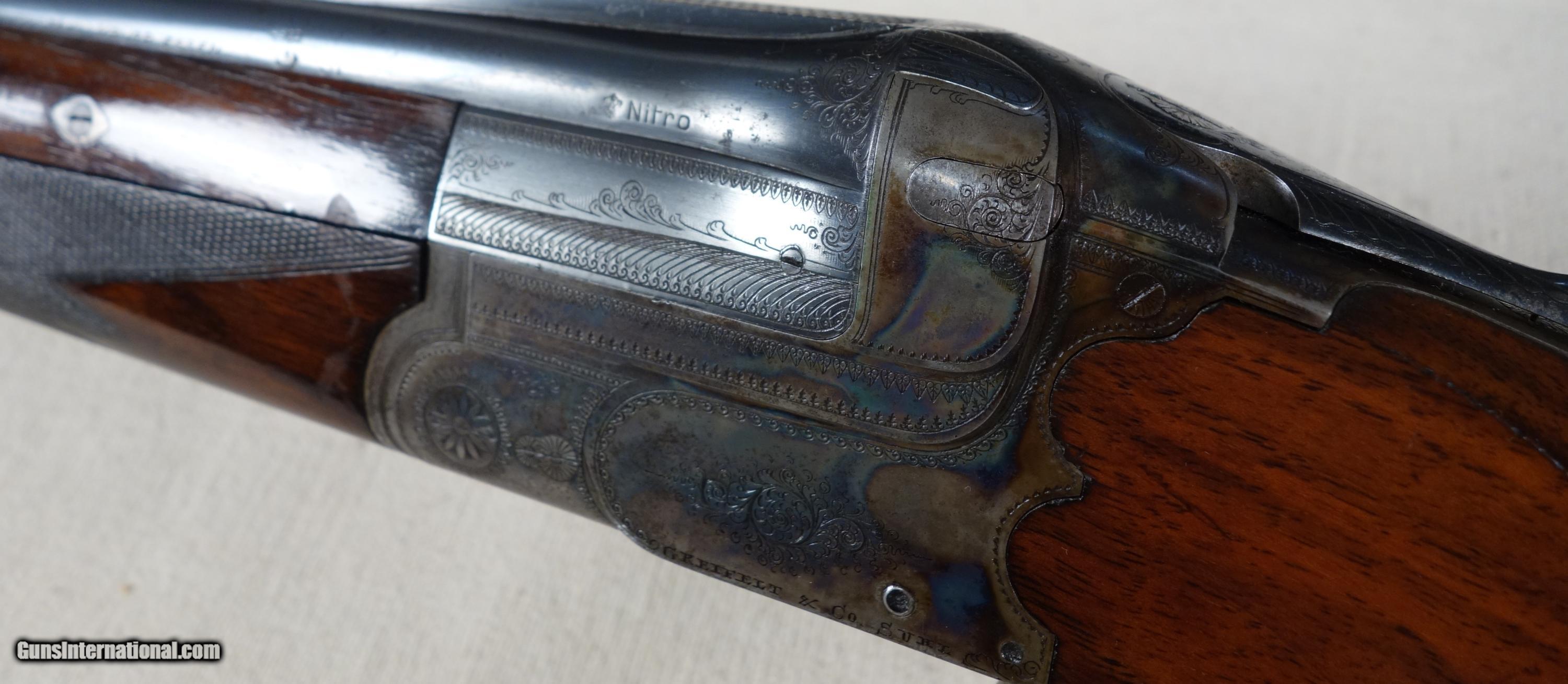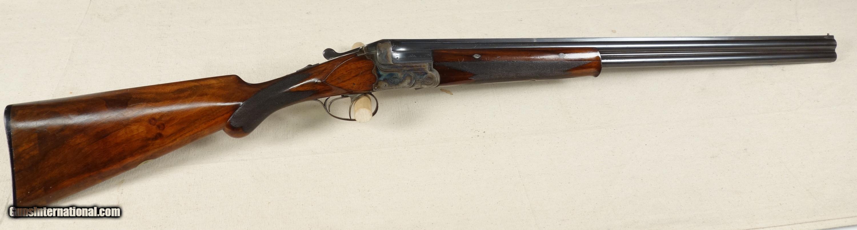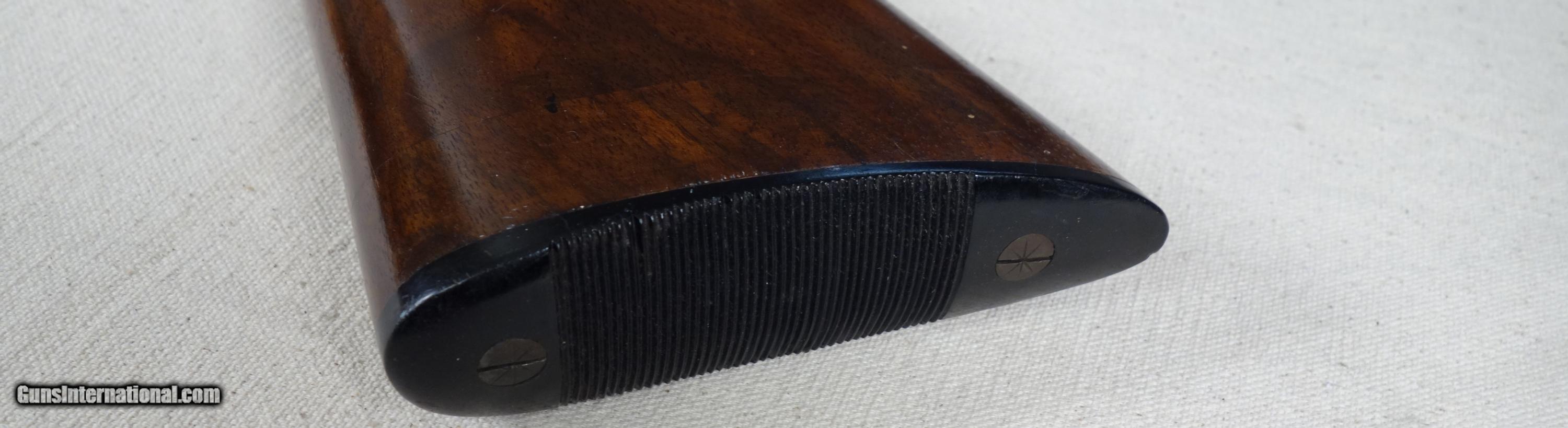 Description: An exquisite 20 gauge over & under shotgun mfg. by Greifelt & Co, Suhl, Germany. Precisely constructed throughout. Beautifully and intricately engraved. Locks up like a bank vault, yet weighs only 5.7 lbs. and points like a dream. This is a pre WWII, fine European sporting shotgun with 26 inch barrels, extractors, finely checkered forearm and round knob pistol grip, solid matted rib, and bright bores. Imported back in the day by Von Lengerke & Detmold of New York and is so marked on barrel. Serial number is 29829. Condition is very good with only notable issue a seam in butt stock about 1" from plate where section of stock was removed and later reattached, along with it's original butt plate. The work was very well done and does not detract unless under fairly close scrutiny. The nicely grained and richly colored wood is in otherwise very good shape with no significant marks or cracks.The rust blued barrels are in equally nice shape with just a few scattered light pitting marks on underside of bottom barrel very near the muzzle which are stable. The swirling case colors on receiver remain somewhat vivid overall. Stock dimensions are approximately: 14 5/8 LOP, 1 5/8 drop at comb, 2 3/4 drop at heel. Chokes appear to be very similar at improved cylinder according to my step gauge. SOLD Curio/Relic: Yes |