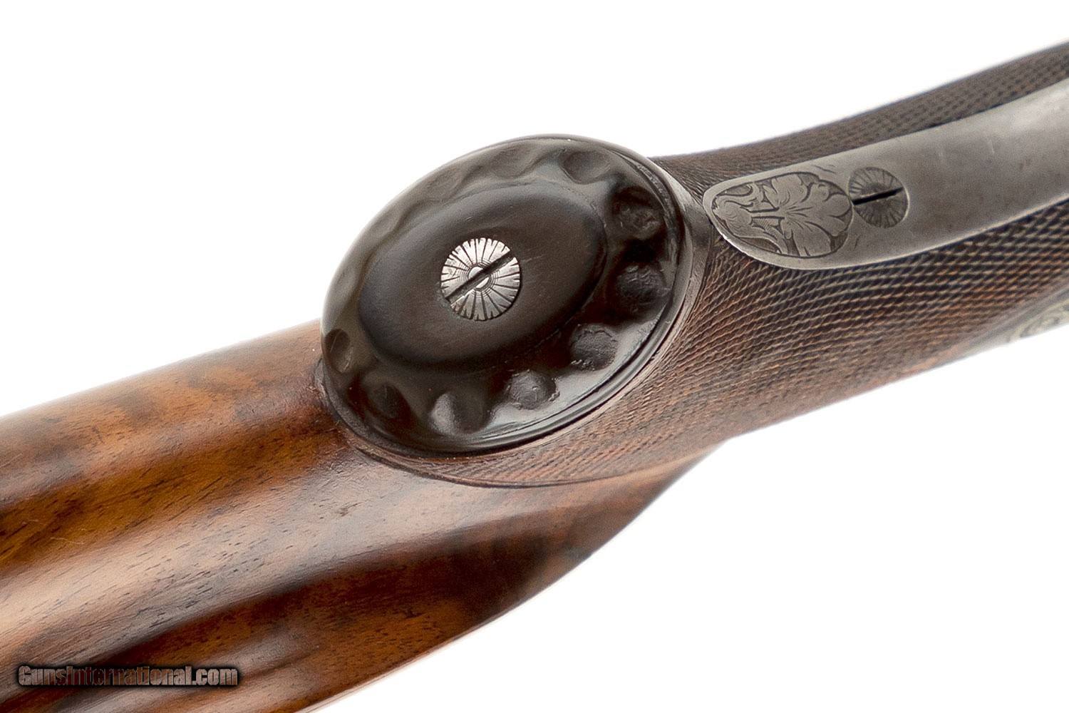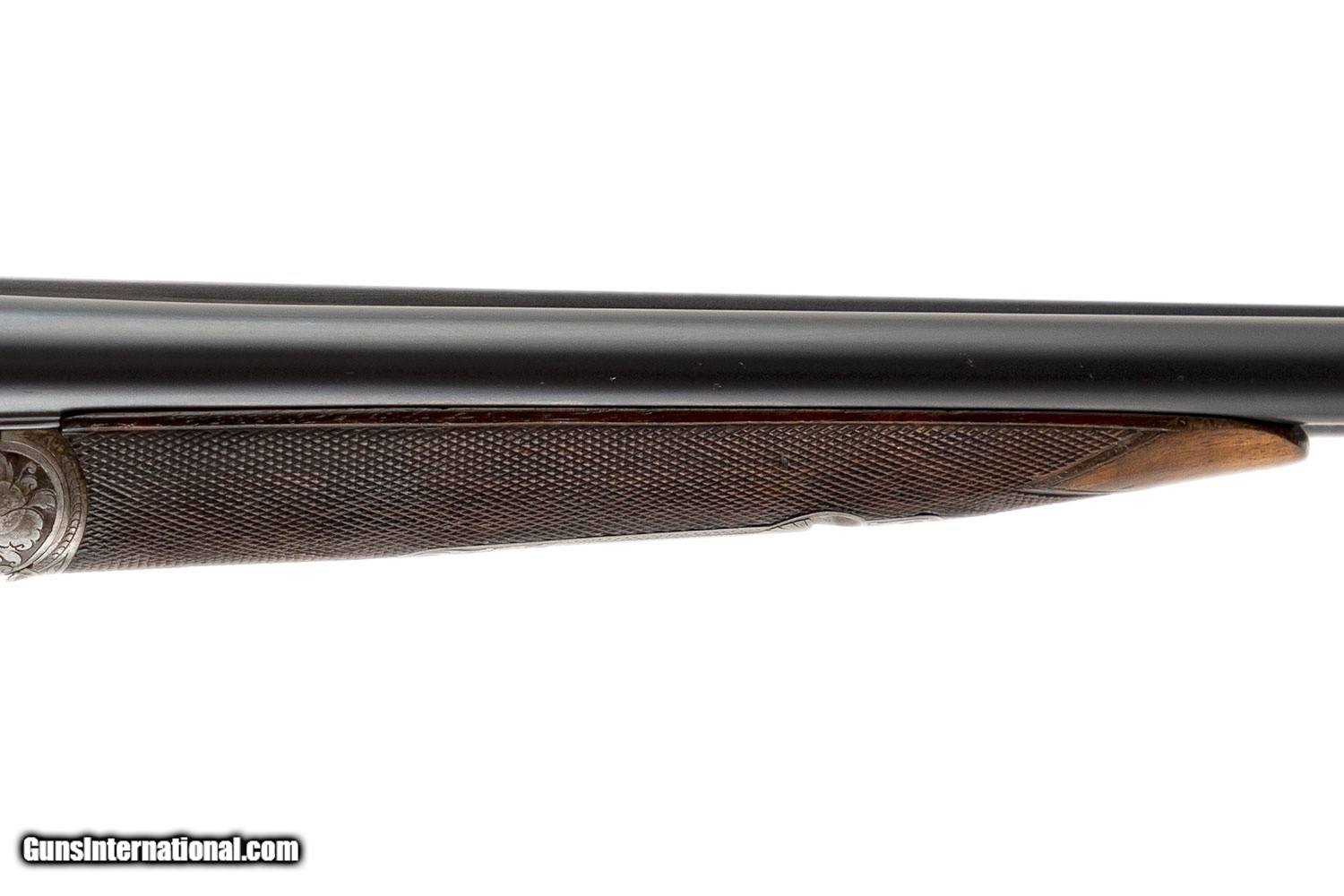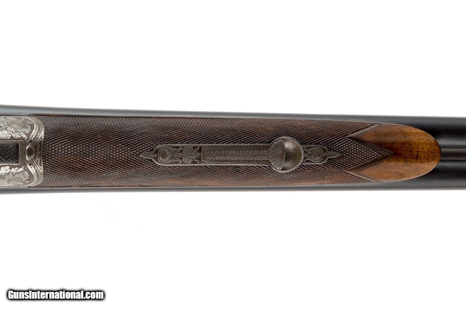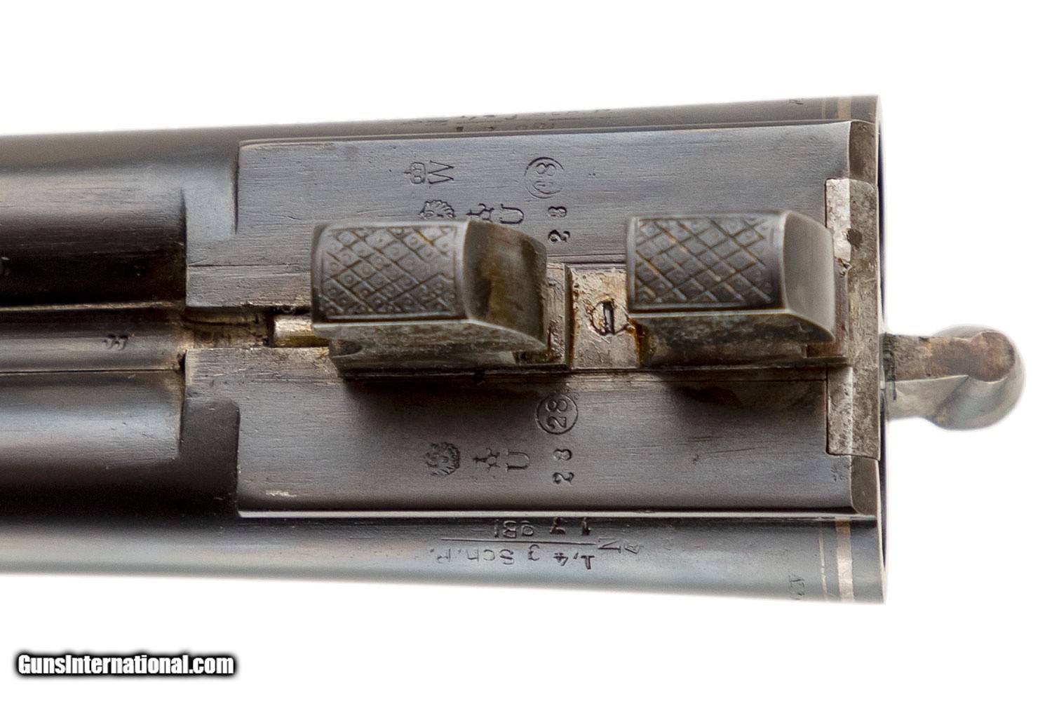 Description: SN# 191XX 26 7/8" SOLID RIB BARRELS (.018 AND .025 CONSTRICTIONS) 2 1/2" CHAMBERS RIGHT BARREL GERMAN PROOFED 28 GA FOR BLACK POWDER WALLS: .023 RT, .024 LT BORES: .555 BOTH BARRELS DOUBLE TRIGGERS EXTRACTORS SPLINTER FOREARM PISTOL GRIP SILVERS STYLE RECOIL PAD CHEEK PIECE SLING SWIVELS GREAT CONDITION WITH SOME LIGHT HANDLING IN WOOD BORES ARE BRIGHT AND SHINY RIGHT BARREL SHOWS SIGN OF "REPAIRED" DENT ABOUT 10" FROM MUZZLE LEFT HAMMER HAS BEEN REPAIRED 5LBS 0 OZ 2 3/8" DAH 1 1/4" DAC 13" LOP SOLD |