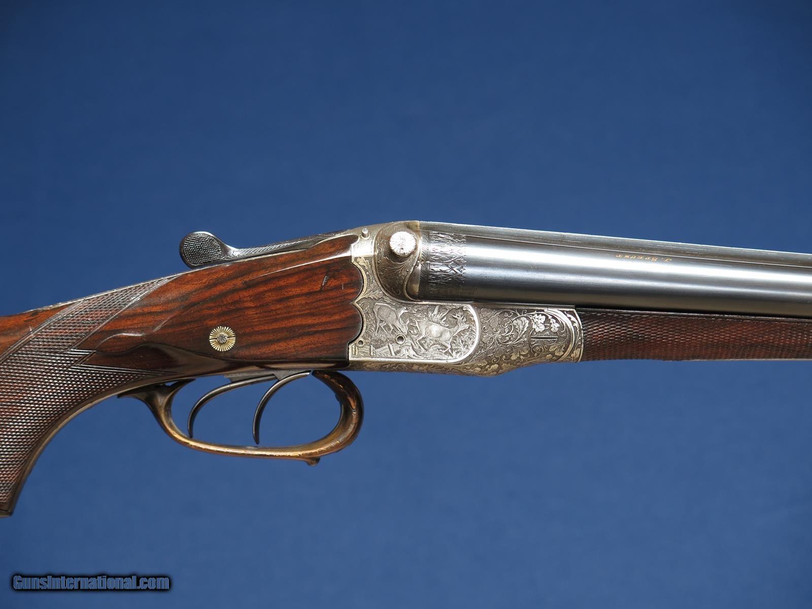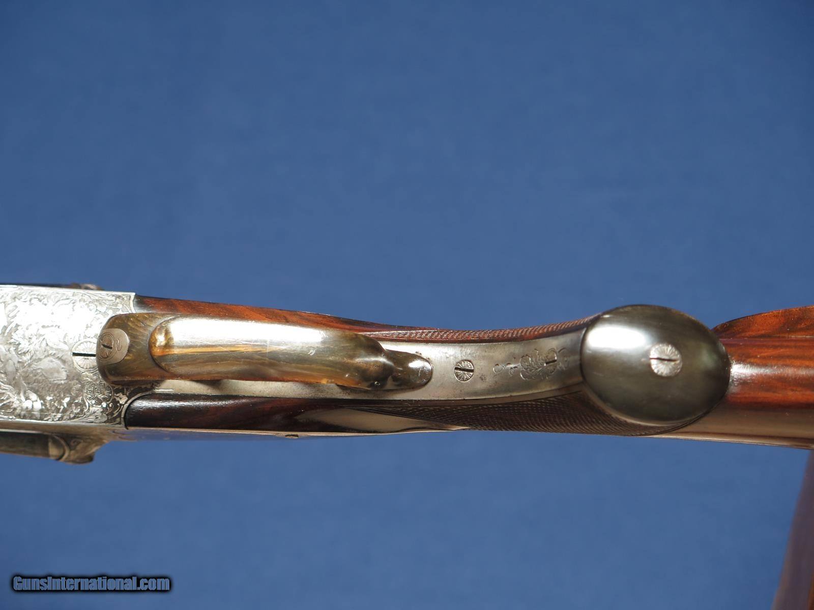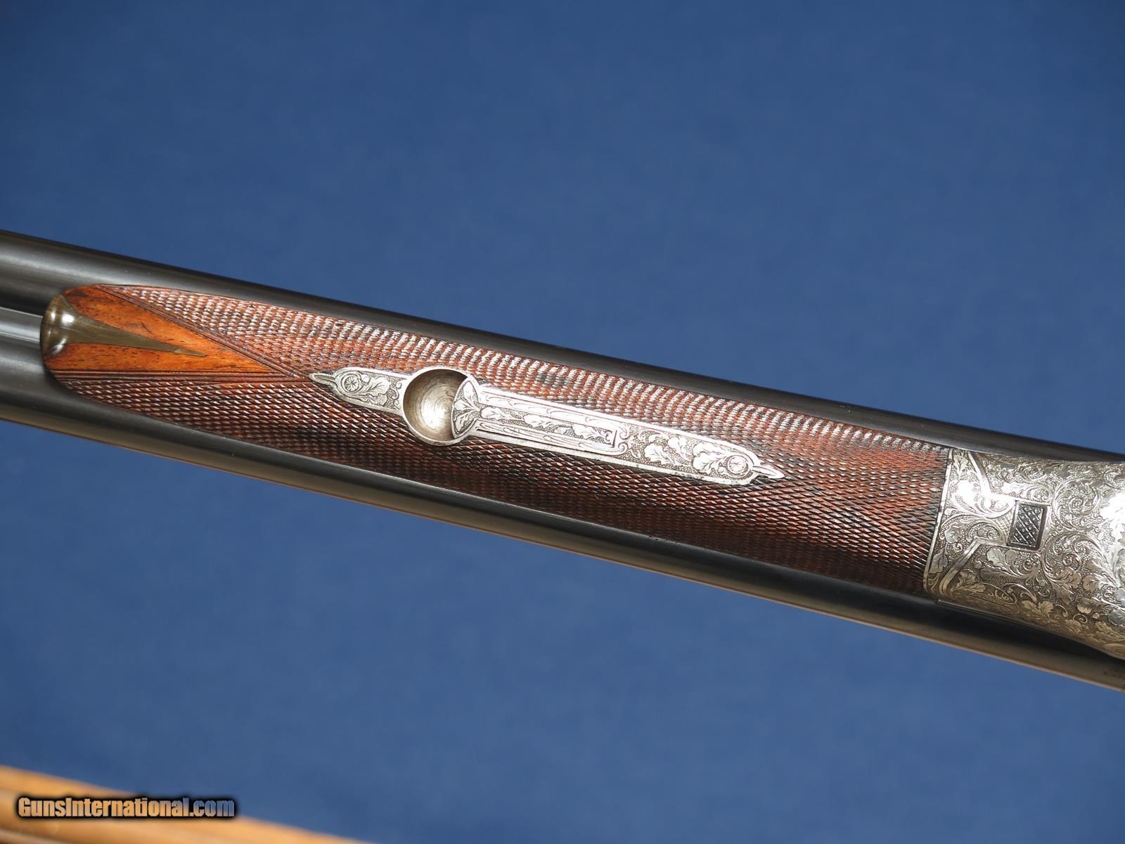 Description: J. Specht, A Posen Excelsior Witten high quality engraved scalloped boxlock German 16ga. Game scene engraved. Greener crossbolt. 29 inch full and full. .028 & .030. Double triggers. Hinged front. Automatic ejectors. Horn trigger guard and grip cap. 14 inch LOP pad. Excellent condition and bores. SOLD |