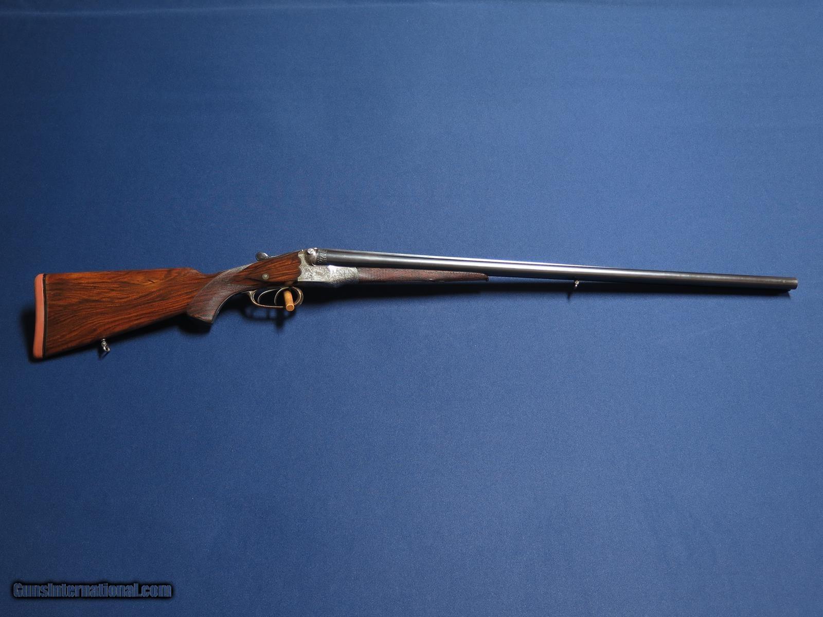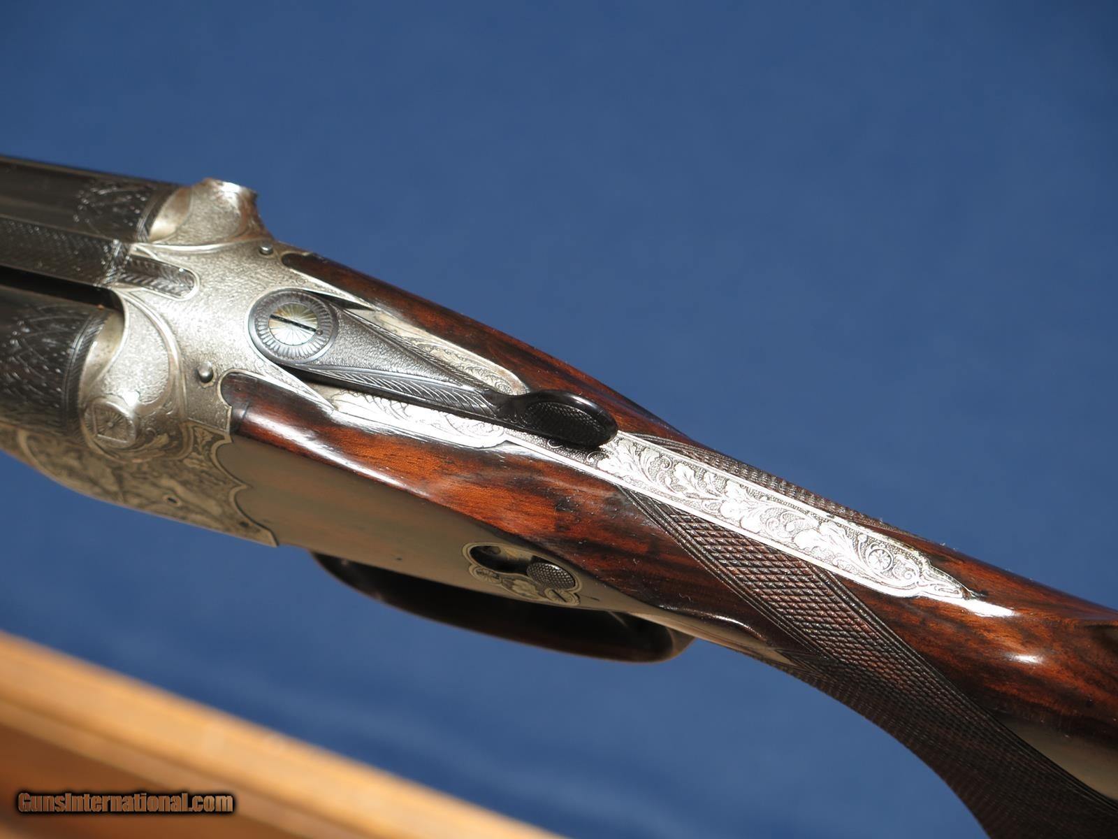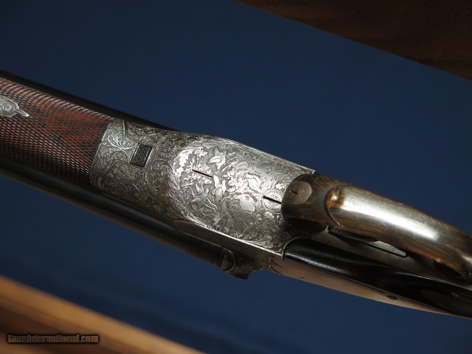 Description: J. Specht, A Posen Excelsior Witten high quality engraved scalloped boxlock German 16ga. Game scene engraved. Greener crossbolt. 29 inch full and full. .028 & .030. Double triggers. Hinged front. Automatic ejectors. Horn trigger guard and grip cap. 14 inch LOP pad. Excellent condition and bores. SOLD |