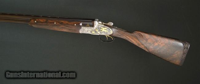 Jurgen Hensel Oberdorf engraved O/U 12ga 28 ½” Imp Mod/ Full. Double trigger set front 3piece forend. Full side lock hand detachable exhibition grade checkered and carved butt. Highly figured Turkish walnut magnificent chiseled engraving. With gold line work with raised gold dogs, pheasant, foxes, and ducks. A beautiful gun.