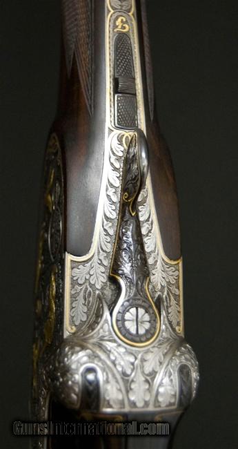 Description: Jurgen Hensel Oberdorf engraved O/U 12ga 28 ½” Imp Mod/ Full. Double trigger set front 3piece forend. Full side lock hand detachable exhibition grade checkered and carved butt. Highly figured Turkish walnut magnificent chiseled engraving. With gold line work with raised gold dogs, pheasant, foxes, and ducks. A beautiful gun. Inv. #20553