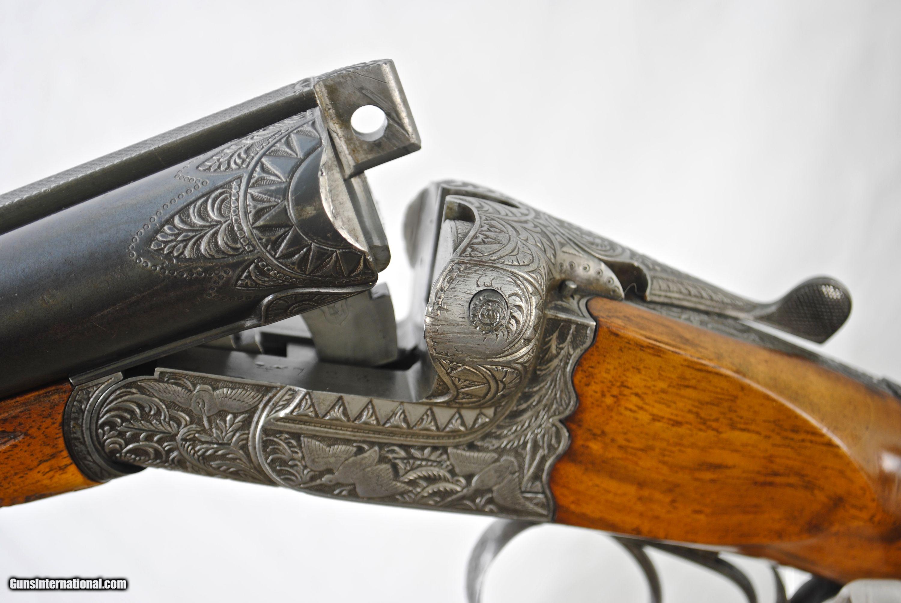 Description: Here is a Robert Schuler Game Scene Engraved Shotgun in 12 gauge. Deep relief in an Art Deco Style. Made in Germany between the Wars this gun has all the options - Ejectors, Cocking indicators, Greener style third fastener, side clips, scalloped and bolstered receiver, arcaded fences, and diamond style pistol grip. Tight on face. No loose ribs or cracks in the wood. Well figured wood. Mirror bores. Nitro proofed steel barrels. Front and center bead. Bores measure .719 with light full chokes in both barrels. Chambers are 2 3/4". Weight of gun is 7 LBS 11 1/2 OZ. Shipping is $40. Stock dimensions follow. LOP - 14" Drop at Comb - 1 5/8" Drop at Heel - 2 5/8" For inquiries please call Guy - 407-721-3748 SOLD Curio/Relic: Yes |
