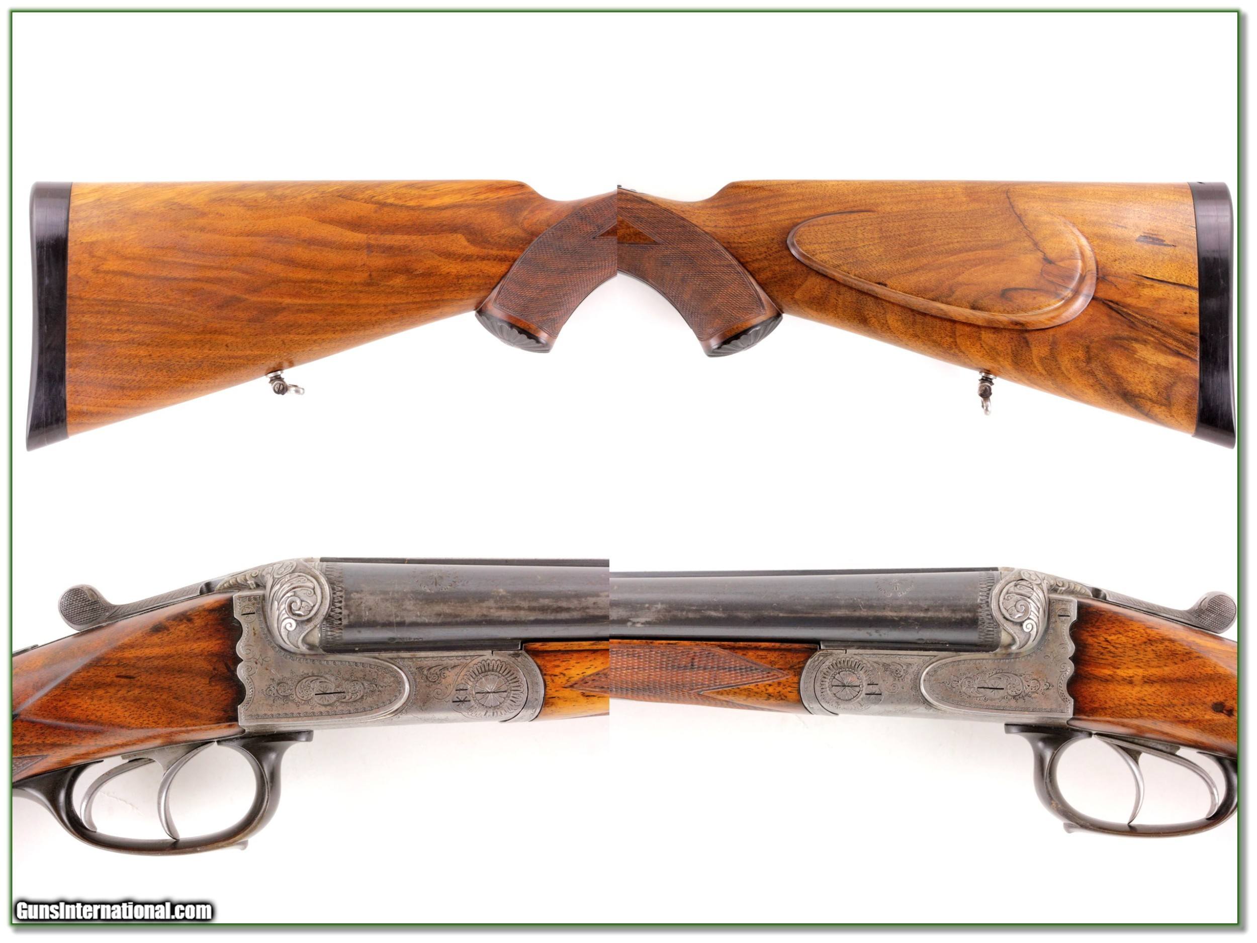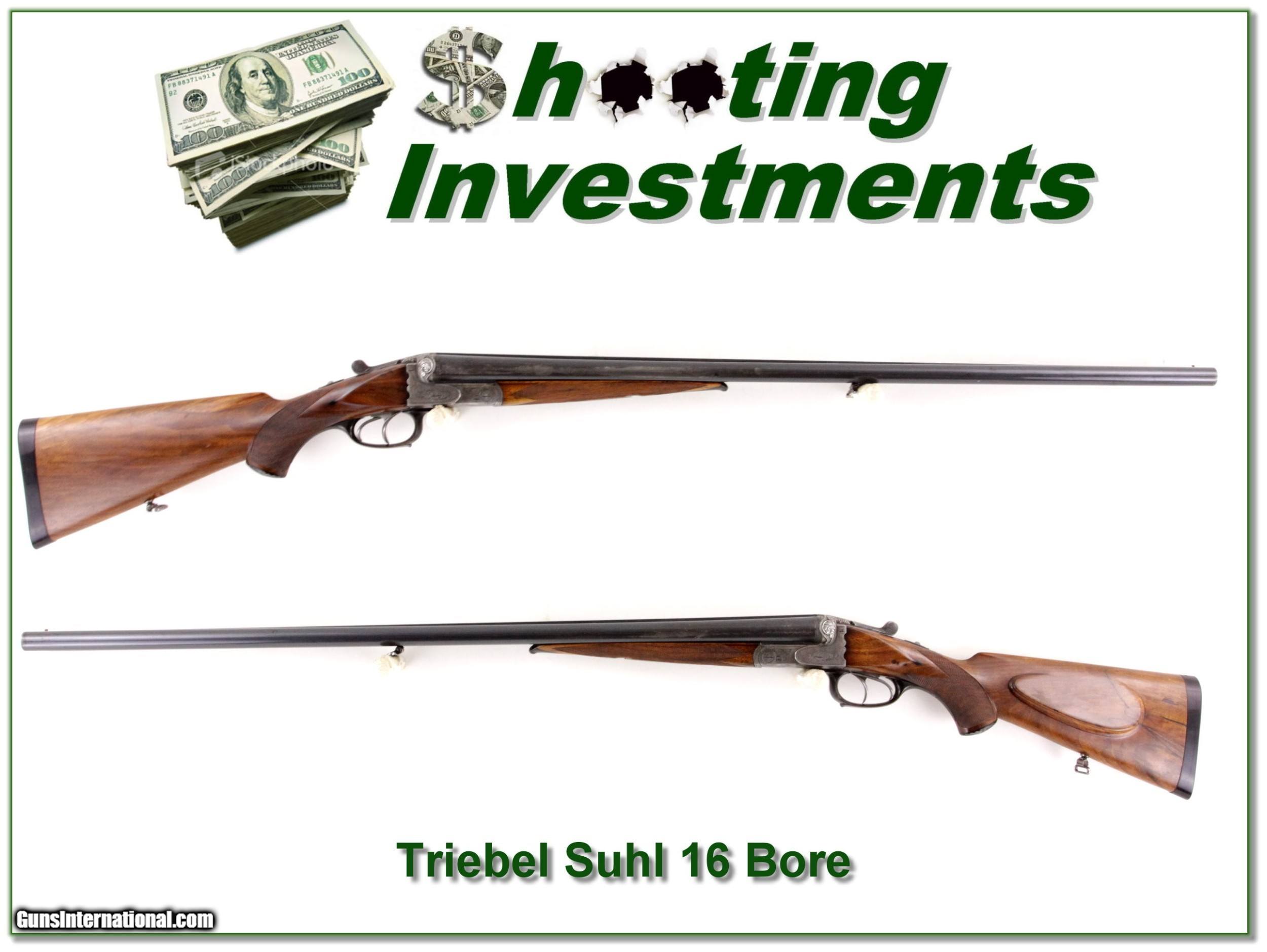 Description: Collectors, this is a Triebel Suhl 16 Bore. It was made in 1921 by Triebel Gun Makers located in Suhl Germany. They built guns one at a time with no two being exactly the same. This one is in excellent condition. The trigger guard and forearm tip are original horn. The but was placed with matching horn by Doug Turnbull. It is all-original other than the replacement butt with beautiful engraving and wood. It has 30in barrels choked Full and Modified. It is a rare SxS and will make a fine addition to your collection or impressive piece in the field. I am selling this one on consignment and as such lay-a-way can’t be used. It does of course have the standard 3-day inspection. Shipping with insurance is $59. Please email me with any questions or larger pictures. (Consign your quality firearms with Shooting Investments for only 12%! Let me know if you have any you would like to sell!) 20-0028 Payment: Payment is by Money Order, Cashiers Check or Personal Check. I can now also accept MasterCard and Visa with a 3% convenience fee. PayPal can be used for some items but never firearms. Please let us know if you would like to pay via PayPal. Shipping: The shipping charge will be listed in each description. It is $39 for most long guns and $29 for most handguns. Some heavy guns or those insured for over $2000 will be higher. Shipments to Alaska and Hawaii are higher because air shipment is required. Most firearms are shipped on Tuesday and Thursday and usually in 5 days of receipt of payment. We package all shipments carefully and insure them. For long guns you can purchase a new Plano case for $19. They now cost us $22 when buying 100 at a time. Optics are shipped Priority Mail and most other non-firearm shipments are shipped First Class. Returns: Our return policy is simple. If for any reason you are not pleased with your purchase, you may return your item for a full refund of purchase price. Ammunition cannot be returned. It is important to us that you are happy. Guns cannot be fired or dissembled before returning them and they must be returned in the same condition as received. Notification of a return must occur with-in 3 days of receipt at your dealer. Shipping, convenience and dealer fees are not refundable and are the responsibility of the buyer. Lay-a-way: If needed, we offer a 60 day lay-a-way option on most firearms. It is 1/3 now, 1/3 in 30 days and 1/3 in 60 days. Lay-a-way firearm sales are final and if not completed the first payment cannot be returned. Consigning your firearms with Shooting Investments: We will help you get top dollar for your firearms. While most local guns shops charge 20% or more, our fee is only 12% with a minimum of $75. At your local gun shop it might take months to sell. Selling on-line provides instant access to thousands of interested buyers. You won’t find any other on-line dealer willing to sell your firearms for only 12% or listing every gun on 3 separate s. Selling through an House typically costs the seller 15% and the buyer an addition 15% (so 30%) and you have to wait several months to sell and longer to receive funds. If properly priced, we will sell your firearms in a few weeks. Send us an email or give us a call and we’ll explain how easy it is for you to get top dollar. Trading: Trading for use is really just buying your gun to re-sell. If you have a gun you want to trade, please email a picture and we will let you know what we can give or it. You will always get more if we sell it for you on consignment. Help for California Buyers: We are happy to ship to California. It is the buyer’s responsibility to make sure any item you buy is legal in your state. We are also happy to help with your purchase of a firearm from someone other than us. If you see a gun you would like to buy but the seller can’t or won’t ship to California they can ship to use and we’ll then ship it to your California dealer. The cost for this service is only $30 + shipping. Let us know if we can help! SOLD |