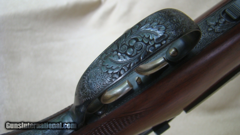 Description: Fabulous little .22 long rifle on commercial Mauser bolt action repeater. Barrel with tangent sight, miniature Mauser clip fed action, grooved top receiver with hand detachable mounts and Hensoldt scope marked "Joh. Springer Erben". The rifle features a shotgun safety on the rear tang, double set triggers within a shotgun trigger guard. The bottom metal engraved in fine scroll and high relief of oak leaf and acorn motif. Superbly crafted by one of Europe's most prestigious gunmakers. The stock of highly figured old world walnut, elegant oval cheekpiece, horn grip cap and forend tip completes the package. As new condition, certainly one of a kind! SOLD |
