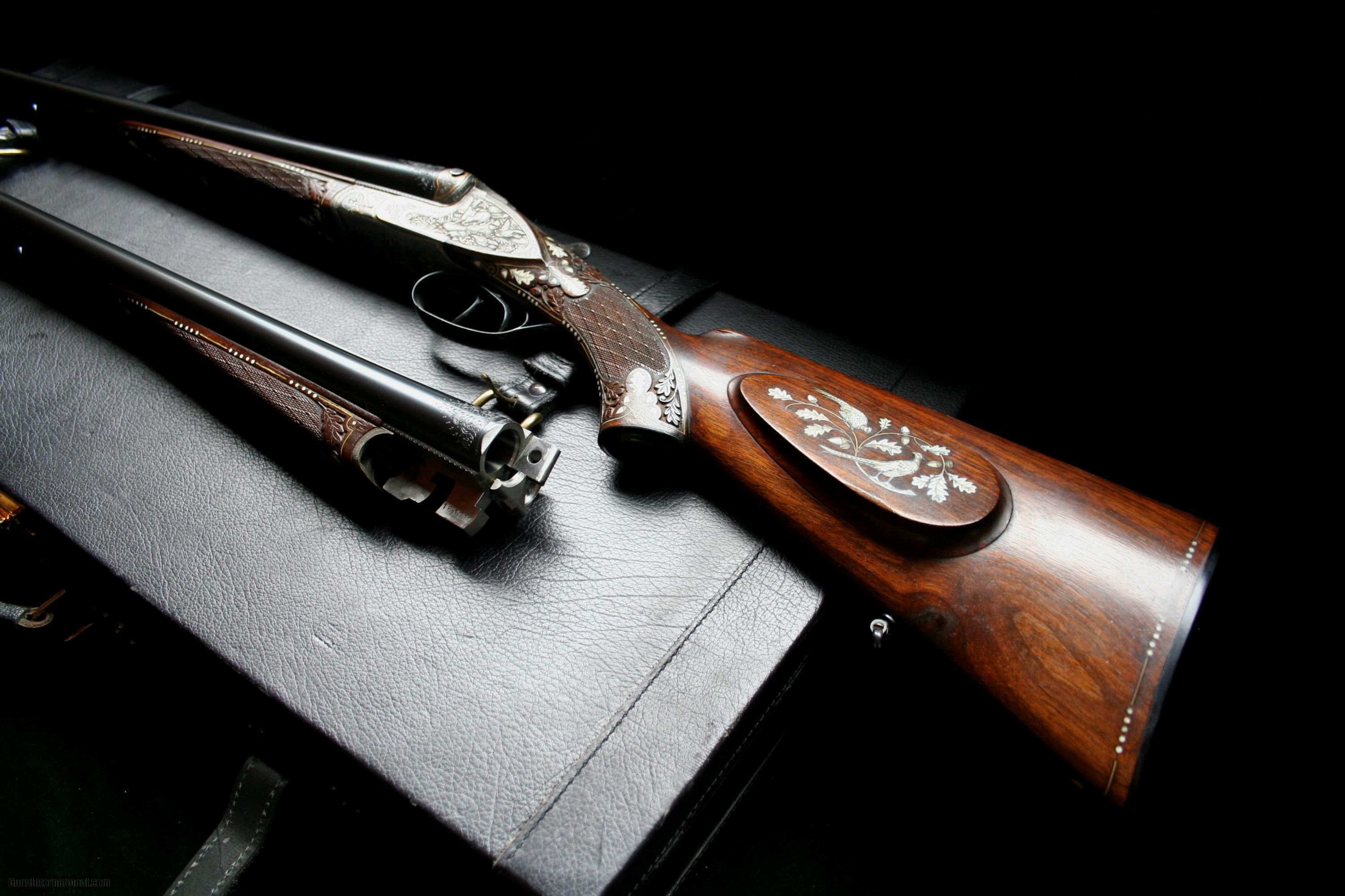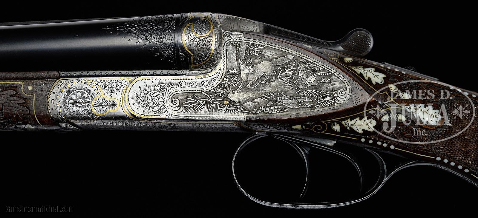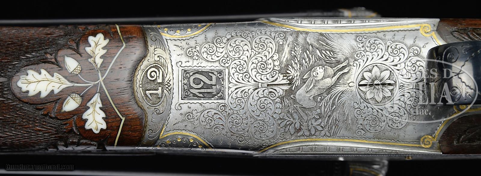 Description: SIMPSON SIDEPLATED BOXLOCK GAME GUN TWO GAUGE SET (12/16) WITH ATTRACTIVE INLAY AND FITTED LEATHER CASE Two sets of 28-1/2 " Shoe lump bbls in 12 and 16 Gauge are marked "SIMPSON, SUHL" on slightly raised, matted, game ribs. Tops of bbls are marked "SPEZIAL-GEWEHRLAUFZTAHL" There are 1-1/2" triangles of scroll engraving at breech ends. Bbl flats are stamped with German nitro proofs, with proof date of 2/58. Bottoms of front lumps are engraved with "12" and "16" as approate to each bbl. Coin finished boxlock action is fitted with very elaborately engraved sideplates, and feature an automatic safety, crossbolt third fastner, side clips, and dbl triggers. Action is finely engraved with over 90% coverage well cut scroll within gold inlaid wire borders. This scroll surrounds a running hare on trigger plate. Sideplates are fully engraved with game scenes; a fox vexing two lazy ducks, beginning to take flight, is on left, and a setter is pointing a phesant while another flushes is on right. Very nice, lightly streaked dark European walnut capped pistol grip buttstock measures 14-1/2" over rubber buttplate with Simpson logo. Stock features a right hand shallow line cheekpiece and skip-line checkering. Checkering at grip and forend has relief carved oak leaves at its ends, which is further embelllished with enlays of oak leaves and acorns with line and dot borders. More of the enlay is at heel, and around buttplate, and extends to face of cheekpiece, where scrolled enlaid, leaved oak branches are being perched upon by a pair of finely done pheasant. Matching splinter ejector forends have damascened internals and Deeley releases. Bottoms of forends are each engraved as to the gauge as well are on the irons, and feature more of the oak leaf and acorn enlay. Black/Grey leather case. 12 Ga. Bbls. Bore dia. left .725/right .725 Bore restrictions left .042 (extra full) right .033 (full) Wall thickness; left .032/ Right .036. Drop at heel; 2-11/16" Comb;1-5/8" Wt. 6lbs.15oz. LOP 14-1/2" 16 Ga. bbls. Bore dia. left .673/right .673 Bore restrictions left .035 (full) right .025 (IMod) Wall thickness; left .036/Right .039 Drop at heel; 2-5/8" Comb;1-5/8" Wt. 7lbs.3oz. LOP 14-1/2" As much a work of fine art as fine huning gun. SOLD Curio/Relic: Yes Manufacturer: SIMPSON Model: Dbl. Side by side Two sets Bbls. 12/16 Gauge Serial Number: SN #161710 Caliber Info: 12 Ga. - 16 Ga. |