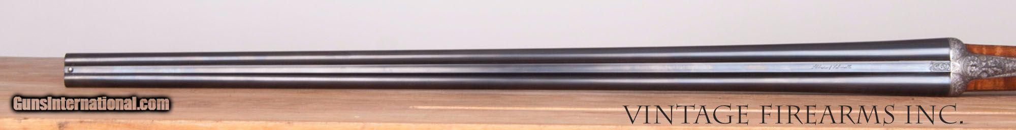 Description: Abbiatico & Salvinelli Best Sidelock .410 Gauge SxS Shotgun ***REDUCED PRICE*** BEST SIDELOCK EJECTOR .410 GAME GUN BONSI ENGRAVED General Specs: A & S, Year 2005, .410 Gauge, 5lbs 14oz, Side by Side Serial Number: 447 Most knowledgeable fine shotgun experts acknowledge Abbiatico & Salvinelli (A & S) guns as some of the finest 7 pin sidelock shotguns ever made, with chopper lump barrels, meticulous polishing and fitting internally, perfect wood to metal fit and 32 lpi checkering, and of course that engraving! A & S are often credited with establishing the Italian engravers and the art of bulino style engraving as the pinnacle of the engraver's world. This gun, sn447 built in 2005, was engraved by Bonsi and the bulino scene likely by the second signer, Shidini, certainly some of the best engraving you will ever see...period! There is no wear on this gun, with 100% blue and factory finish overall, weighing just 5 3/4lbs. and balanced gracefully between the hands, single non-selective trigger, perfect mechanicals, perfect screws, and nearly new in all ways with its own case. The gun is priced to sell, and in .410 bore with fantastic 100% coverage engraving, it is a very solid investment quality gun that will be a pleasure to shoot at game or targets. Featuring the finest 26 3/8" chopper lump barrels choked LM/F (.007/.015 constrictions), concave rib, 3" chambers, striking fully marbled European walnut with drop points, checkered butt, 15 1/8" LOP to the rear position trigger, blank gold shield and long, graceful forend, checkered to perfection. The engraving is 100% full coverage tiny English scroll overlaid with dramatic flower and foliate acanthus scroll and a finely detailed bulino scene featuring quail in flight. What a fantastic, functional, work of art. Certainly ranking with some of the finest sidelock shotguns the world has ever seen, and putting Spanish guns to shame, you can invest in this gun at about 1/2 the price of a new one with same features. Thanks for looking! Barrels Barrel Length: 26 3/8" Chokes: .007/.015 LM/F Bores: mirrors Bore Diameter: .412/.412 Wall Thickness: n/a % Blue: 100% Chambers: 3" Ribs: tight Sights: single Action Action: tight, slight left of center Ejectors or Extractors: ejectors, strong, timed Case Color: coin finish 100% Screws: perfect Engraving: D. Bonzi; M. Shidini; 100% cover Trigger Type: single non selective trigger, crisp Trigger Guard Color: coin, full cover engraved Stock Type: english stock/splingter forend/ high figure turkish LOP: 15" to rear trigger LOP To End Of Wood: same DAH: 2 1/8" DAC: 1 3/8" Cast: 3/16" off Checkering Condition: 32LPI perfect Butt Treatment: checkered butt There are more photos upon request. We offer a 30 day mechanical warranty on this fine shotgun. Call us for full details. PLEASE SEE MY OTHER FINE VINTAGE FIREARMS. Just open one of my ads and click on the line that says “see all items from this seller” and a very nice list of fine sporting and collectible arms will appear. I have many more fine sxs shotguns not yet listed. Thanks for looking! We employ a full time gunsmith on premises and can perform alterations to suit your needs within a few weeks of purchase. Payment Methods: Money Order, Certified Check, Personal Check, Wire Transfer Inspection Period / Return Policy: Three Days from the date the item was received. Sales Tax: 6% Michigan Only Shipping & Insurance: Ground $140.00 We ship internationally! Item Condition: Used Requires FFL?: Yes If you have any questions about this item or payment, please email or call us directly, at #616-292-6240. Thanks! Jay Shachter, Vintage Firearms Inc SOLD |