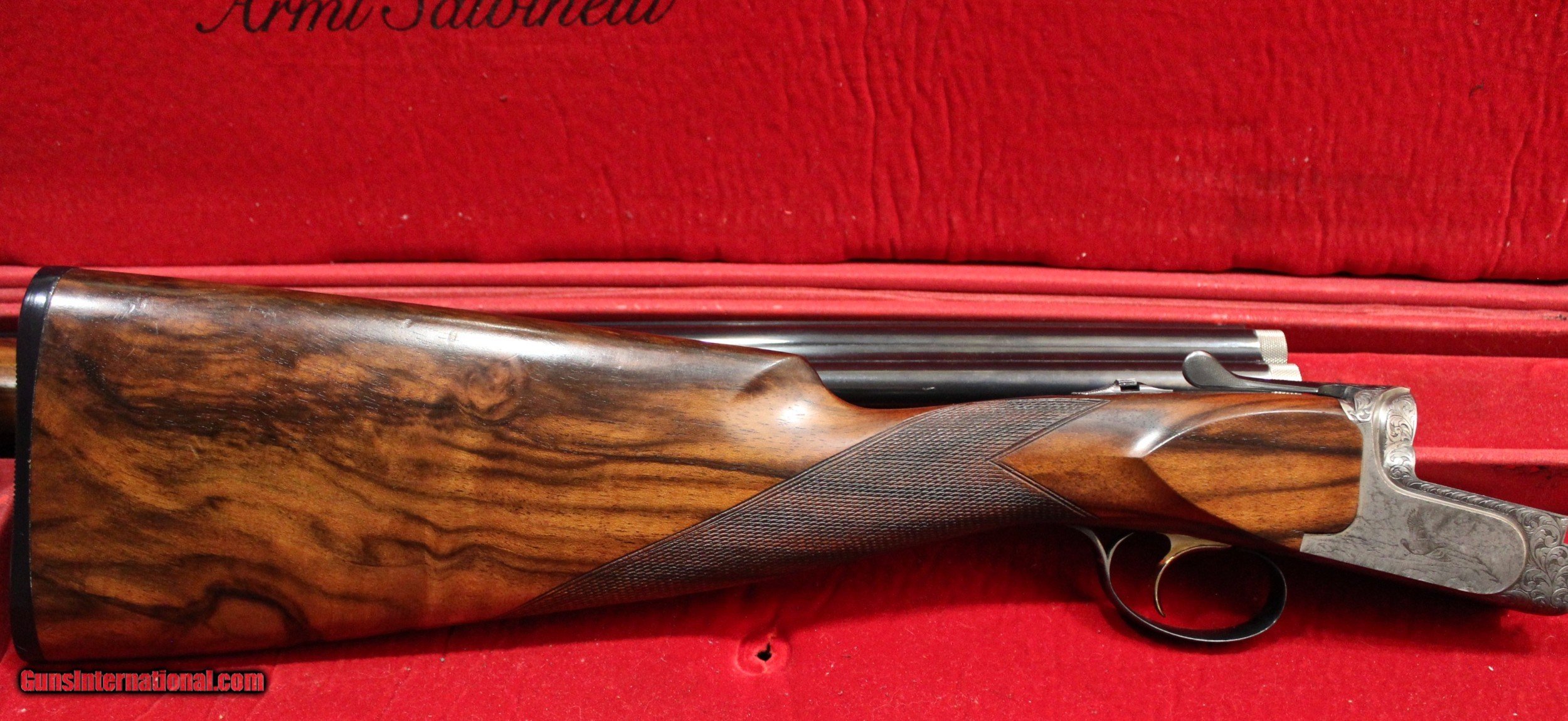 Description: Armi Salvinelli Armi Salvinelli 12 bore O/U in original case . Gun is in excellent condition overall. Very nice handling gun with and hint of swan neck to the stock. Gun comes with a total fo 9 Teague chokes tubes. Single selective trigger. Original butt plate. Near Exhibition Grade wood. Super nice gun. Perfect Sporting Clays Gun. SPECS: Weight: 7 lbs. 2.1 oz. Stock Dimensions: 1 3/8 x 2 3/16 x 14 5/8 with 1/8 cast at comb and 3/8 cast at the toe. Chokes; Every imaginable combination. Chambers: 2 3/4". Barrels: 30 inch Auto Ejectors. Selective Single Trigger. Price: $4500.00 plus shipping and ins. SOLD Shotgun Gauge: 12 Gauge |