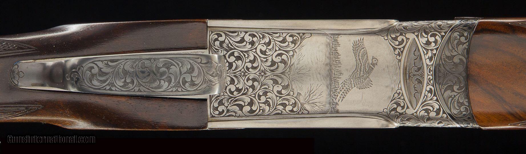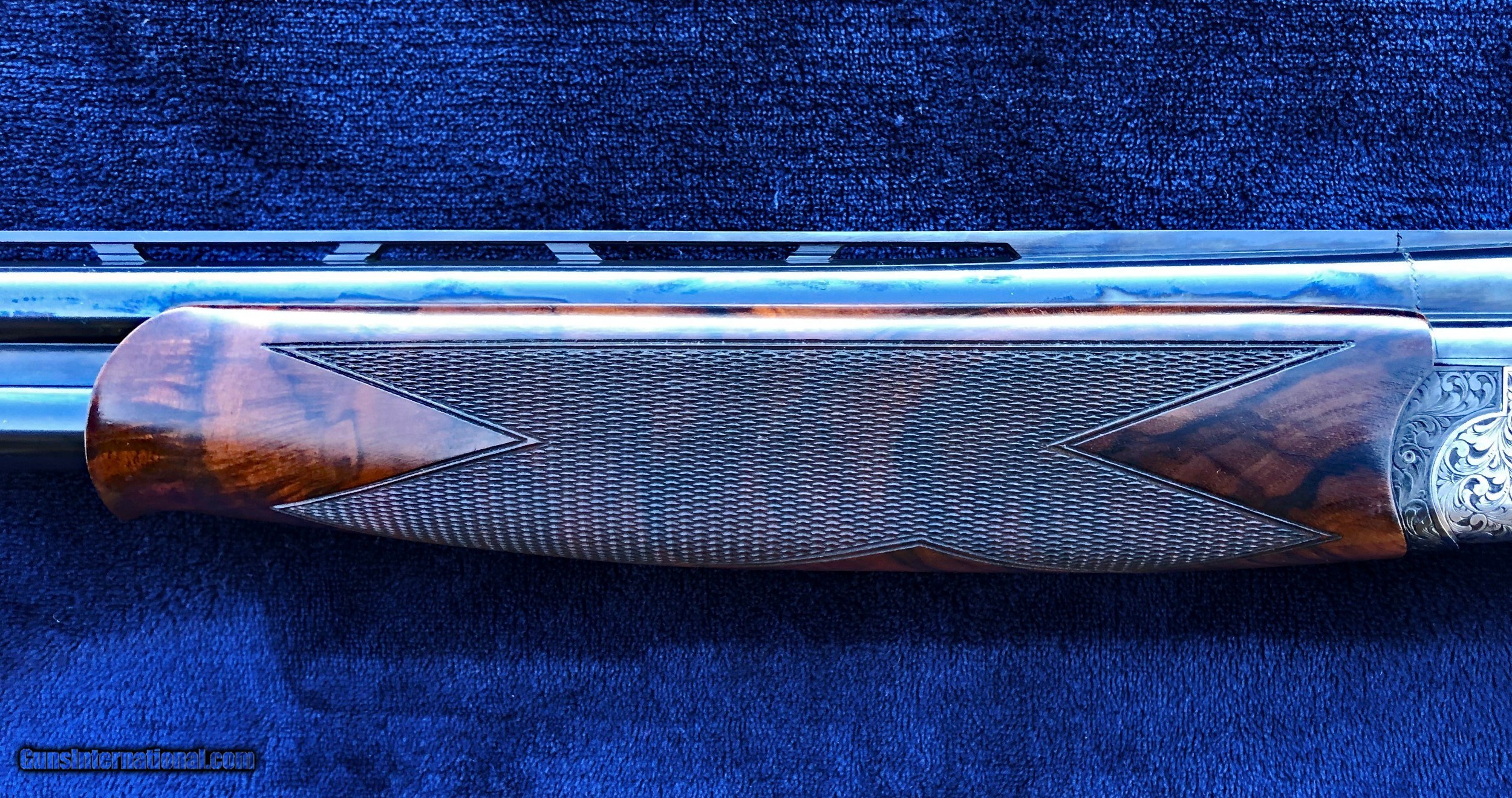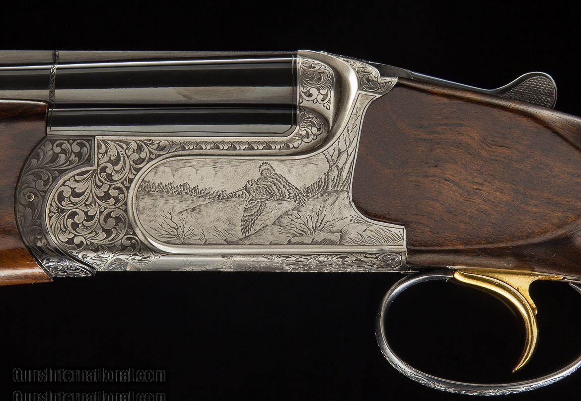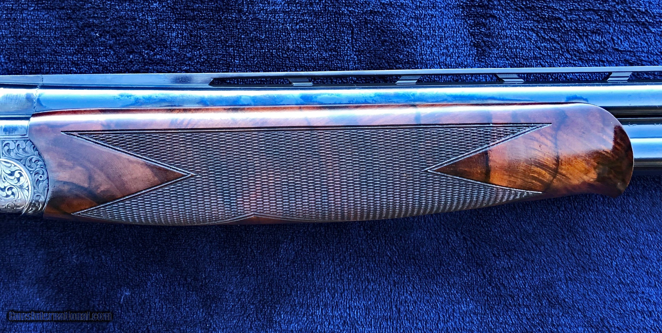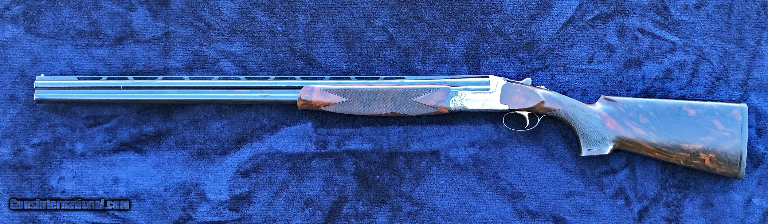 Armi Salvinelli is located at Zanardelli 210, Marcheno (Val Trompia, Brescia) Italy: Serial Number Y942, 12 GA, EXL Sporting Model over and under, finished in 2003 with 30” Vent Rib Monobloc Ejector barrels, .729” (18.5mm) bores, 3” chambers, with wide file-cut cross-hatched ventilated top rib, automatic ejectors, and single selective trigger. The EXL is an engraving upgrade with game bird scenes and includes Grade 5 Turkish walnut and an ABS case.