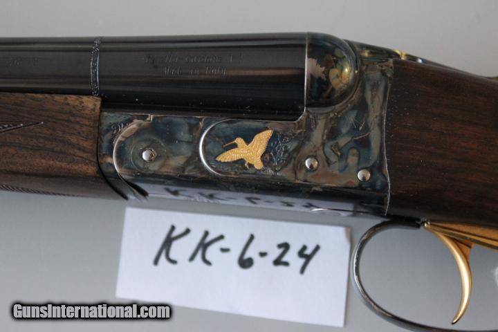 Description: Beretta 471 Silver Hawk. 20 ga. 28” ic/mod This nice Beretta side by side has a beautiful case colored receiver with elegant gold game bird inlays. A traditional upland gun with double triggers, straight stock and a splinter forearm. The wood leans on the darker side and is exceptionally nice as it has lots of figure. The gun looks near new and maybe factory test fired only? Complete will all the paper work and a Beretta hard case. Layaways ok. $3350. Quality Arms, Houston, TX. Call Direct: 281-870-8377 ( 1 3/8 x 2 ¼ x14 5/8 * 6 lbs) KK-6-24 SOLD |