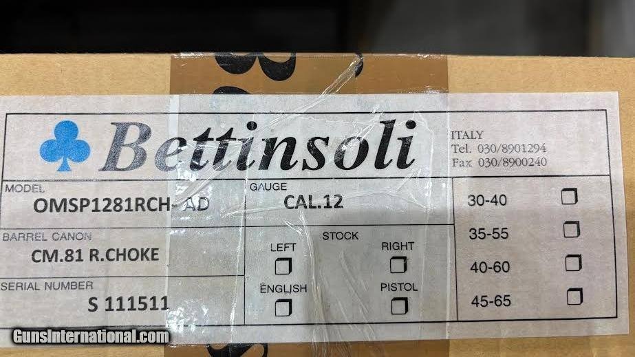 Description: Bettinsoli Omega Sporting Over/Under – 12 Gauge – 32″ Barrels – Italian Made Manufacturer: Bettinsoli Model: Omega Sporting Gauge: 12 Gauge Barrel Length: 32 inches Chambers: 3″ Chokes: Interchangeable Action: Over/Under Stock: Walnut, right-hand configuration Country of Manufacture: Italy Serial Number: S111511 Description Offered for sale is a Bettinsoli Omega Sporting over/under shotgun in 12 gauge with 32″ barrels, built in Italy. Bettinsoli is well known for producing solid, well-balanced sporting shotguns that offer excellent value for clays shooters looking for an Italian-made O/U without premium pricing. This Omega Sporting features long 32″ barrels for smooth swing dynamics, a ventilated rib, interchangeable chokes, and a nicely figured walnut stock. T A great choice for sporting clays, trap, or 5-stand, especially for shooters who prefer a longer barrel set for follow-through and target acquisition. Condition