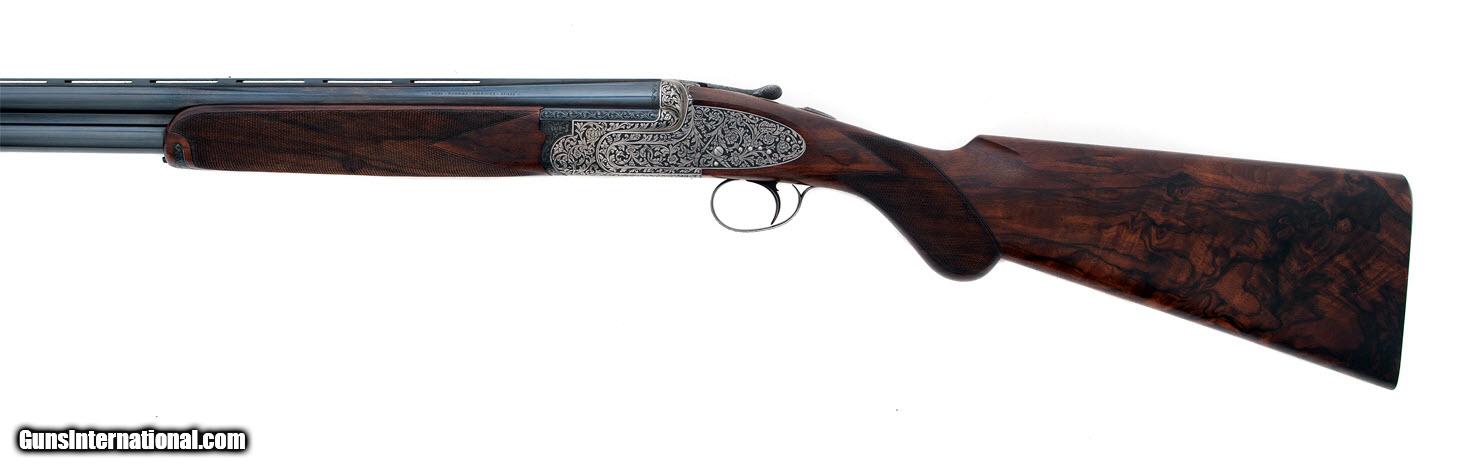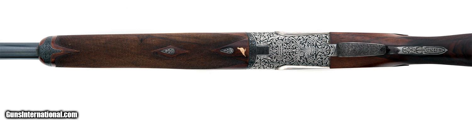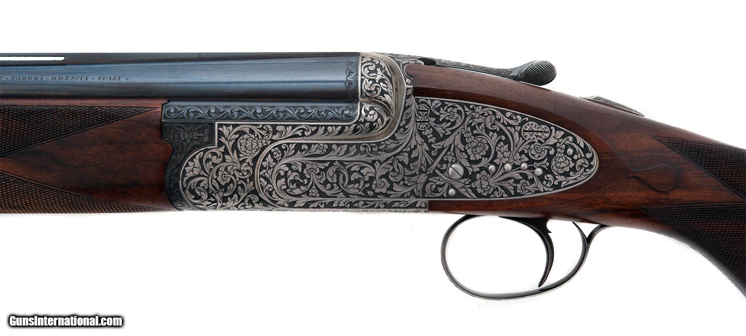 Description: Fabbri - Best - 12 ga - Item Number: FABE448 Shotgun type: O&U Action: Sidelock Ejectors: Yes Trigger: Single Grip: Rounded Pistol Grip Forend: Checkered Lop: 15 1/4 " Pad thickness: " Type of butt: Checkered Wood Drop comb: 1 1/4 " Drop heel: 2 1/8 " Cast amount: 1/8 " Cast: Off Weight: 8 lbs, oz Manufactured in: Italy Manufacture Year: Finish: Coin & Black Overall condition: Very Good Stock condition: Very Good Metal condition: Very Good Stock: Original finish Metal: Original finish Type of Case: none Extra barrels: 0 Barrel info: Gauge: 12 ga Chamber: 2 3/4 " Length: 28 " Chokes: F/IM Rib type: Ventilated Comments : Action is engraved with near full coverage exceptionally well rendered large sprays of flowers, foliage, and ribbons, all in an engraved background."FABBRI BRESCIA ITALY" is in folded ribbon on bottom of action. This very fine engraving is signed “F. Iora” on trigger plate. (Ferruccio Iora. SG-26 SOLD |