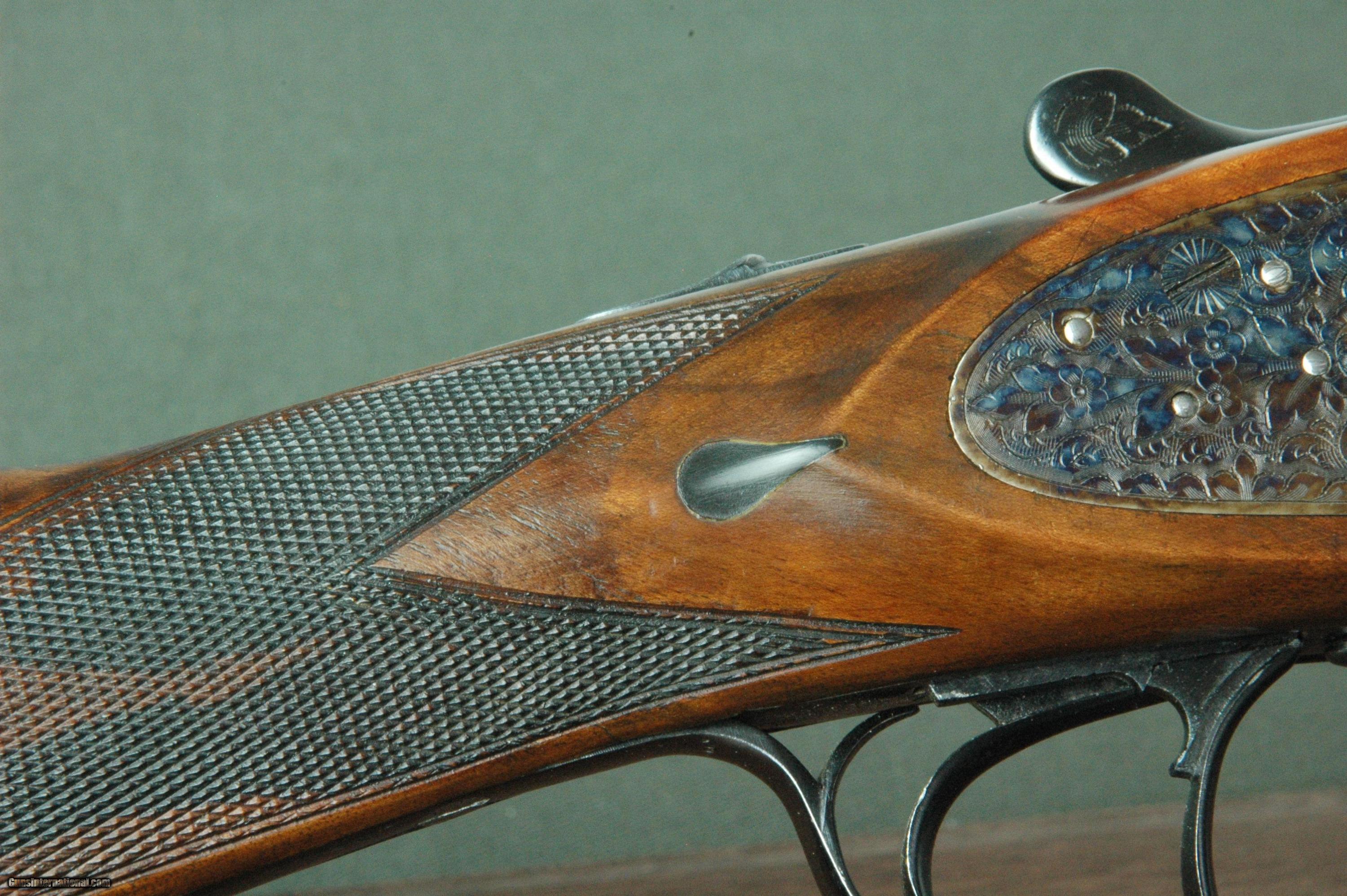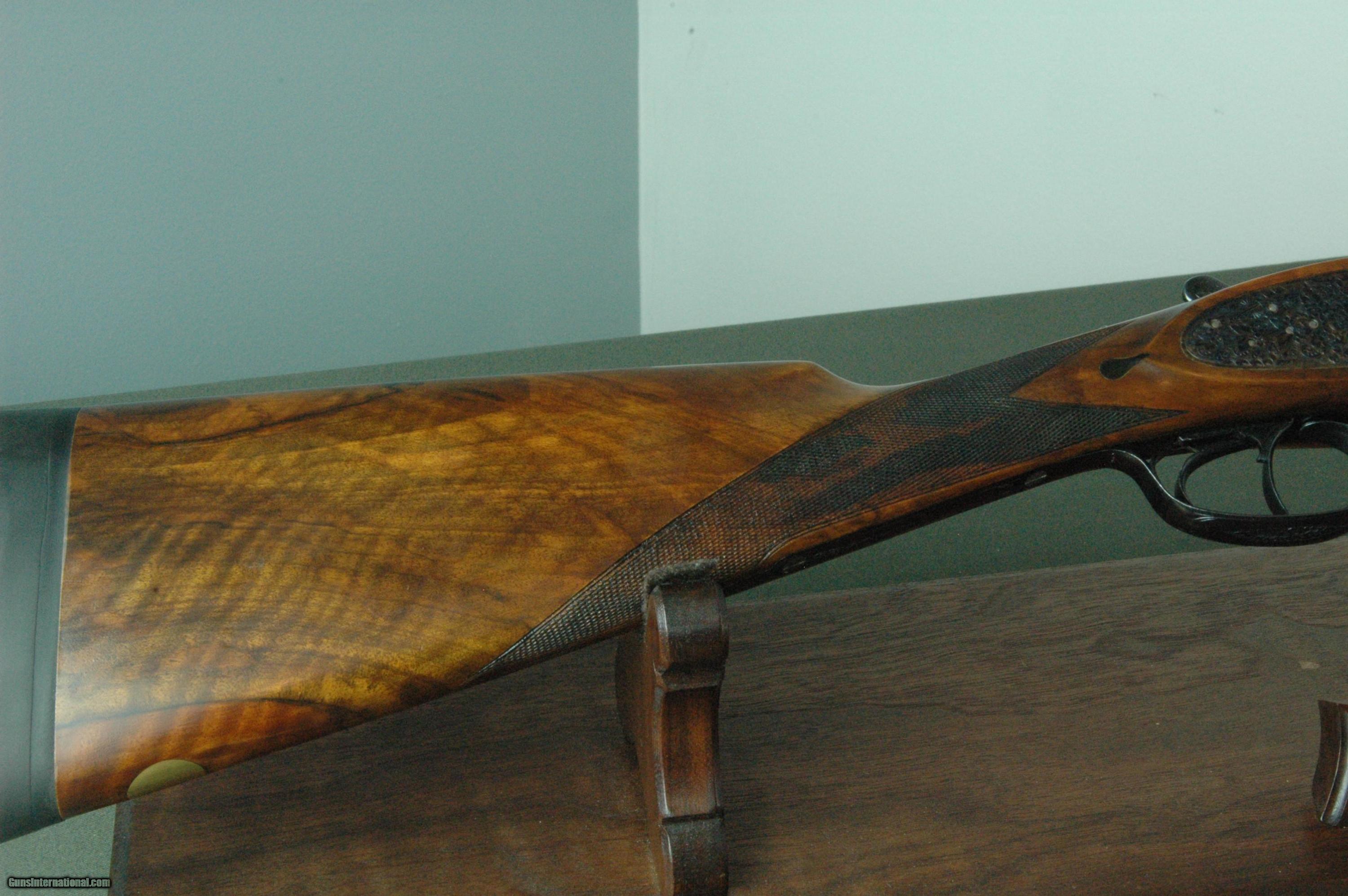 Description: *** SOLD PENDING FUNDS *** A high quality sidelock made in 1972 from this little known Italian maker. I do not believe that L. Santina Bernadelli has ever been imported into the US but that is a real shame given the quality of his work. This profusely engraved 20 gauge bird gun has rich case coloring, nicely figured and finished stock, disc set strikers, double articulated triggers, and Boehler nickel steel barrels. All hallmarks of a higher grade gun. Engraved by S. Rizzini. *** The 26” Boehler barrels are chambered for 2-3/4” cartridges and choked Improved Cylinder and Modified. They are topped by a solid, raised crosshatched rib and have automatic ejectors. The right barrel is bored 0.624 and has a constriction of 0.005 for Skeet choke. The left barrel is also bored 0.624 and has a constriction of 0.010 for Improved Cylinder choke. A pefect choke combination for upland work on grouse, woodcock, and quail. *** It is stocked in nicely figured walnut and has a very nice high gloss finish. The straight grip and semi-beavertail stock is in very good condition with crisp checkering. There are a few handling marks on the wood. Stock dimensions are 14-1/4” including a 1-1/4” leather pad by 1-1/4” by 2-1/16”. Weight is 6lb 7oz. *** Buyer is responsible for all shipping, insurance and related charges. I give a three-day non-firing inspection and will only accept returns if gun is not as described. What a great little smallbore bird gun. Carries easy and swings well. SOLD |