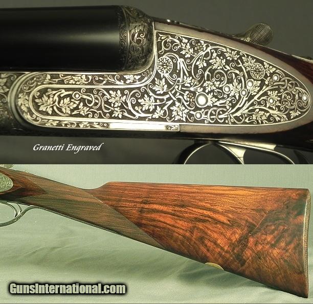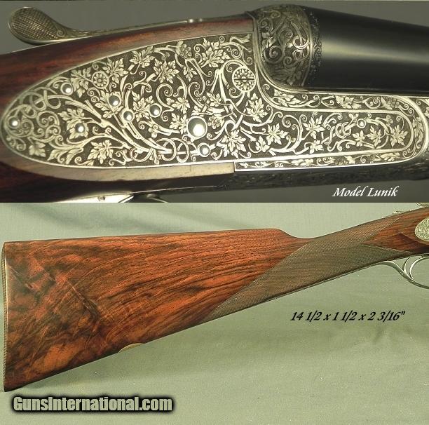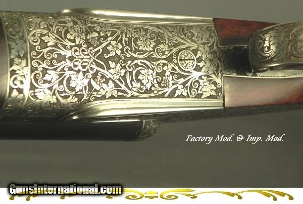 Description: #8173, Fratelli Piotti, Gardone Val Trompia, Brescia Italy, Best-Quality Model Lunik Bar Action Sidelock Ejector 20 Bore Made in 1985 that remains like new, 26” Chopper Lump barrels at 15.9mm = .628 .013 & .019 (Mod. & Imp. Mod.), 2 3/4", KG 1,040 weight barrels, The action body made out of a solid block of Boehler steel, The locks completely made in house by the family lock maker Mr. Fabio Piotti, Matted flat top rib, Double triggers with the front articulated, Rolled trigger guard edge for the right hand, Splinter forend, Straight hand stock at 14 1/2 x 1 1/2 x 2 3/16” over a full face checkered butt, Neutral stock without cast, Very nice game gun weight at 5 lbs. 10 oz., 99% coverage of superb Lunik Style engraving by Granetti on a coin finished frame. It has nicely carved fences and a carved frame. It has very nice wood with excellent color & contrast of brown & black. This piece has 2 retainer screws which secure key screws on the trigger guard tang and forend iron. The piece is cased in the maker's leather trunk with a trade label. This very nice 20 Bore Game Gun remains totally original and in excellent plus condition. The metal remains in 98% factory original condition and the wood at 98%. The checkering remains at 100%. This is a Classic Piotti game gun with the proper size action body and the neat weight of 5 Lbs. 10 Oz. for 20 Bore gunning by one of the leading gunmaking firms in the world. SOLD |