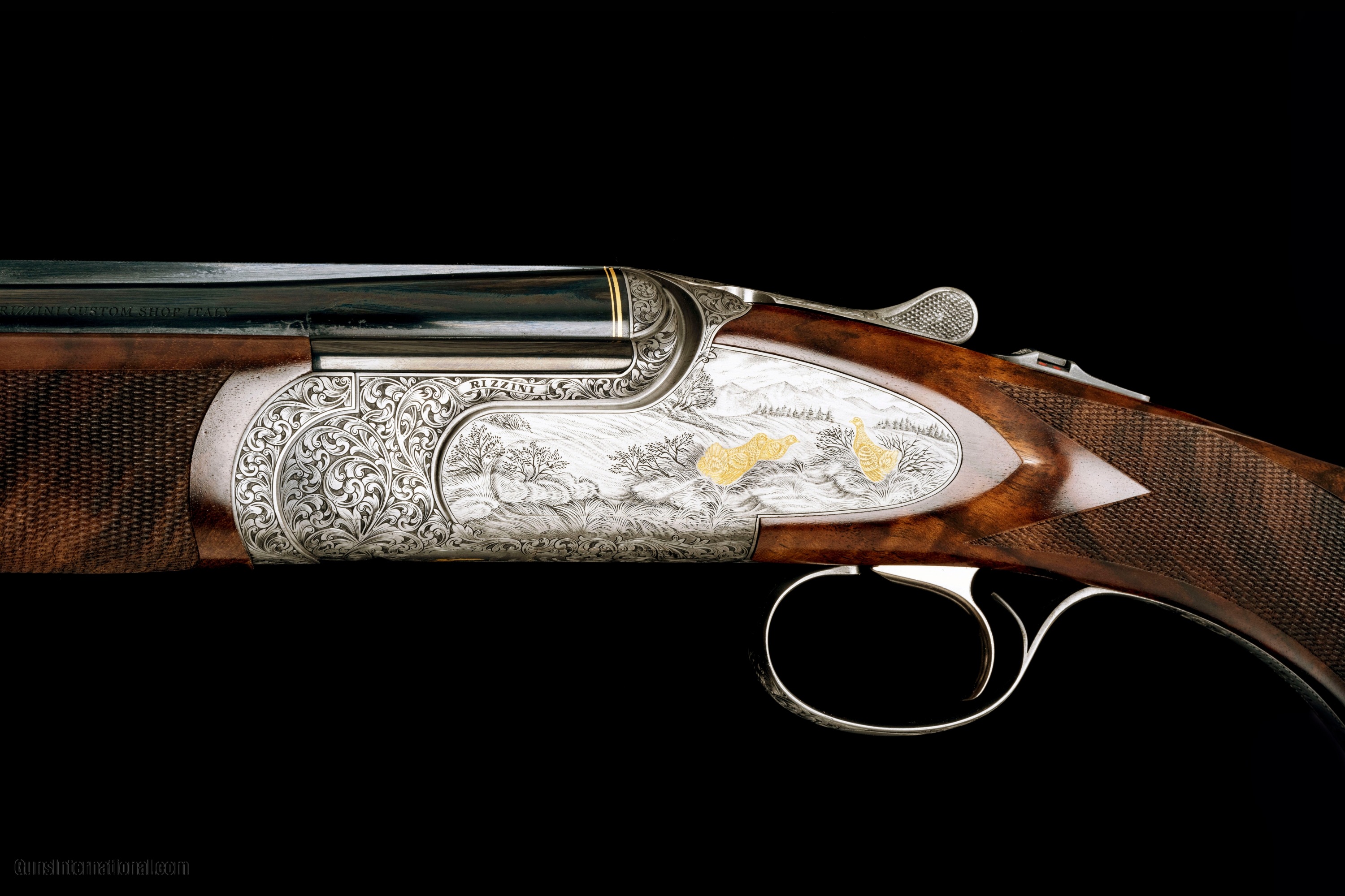 Description: This Rizzini Round Body Custom in a 20ga with 29" barrels with a solid hand cross filed rib and a brass end bead. The reciever is custom engraved by G. Arici in a coin finish with gold inlaid game birds in a fine arabesque scroll. It features a manual safety with a single selective trigger. Exhibition grade stock and forearm with a checkered wood butt. SOLD Manufacturer: Rizzini Model: Regal Custom Caliber Info: 20 Gauge Barrel Type: Over / Under Gauge Info: 20 Gauge Weight: 6.12 |