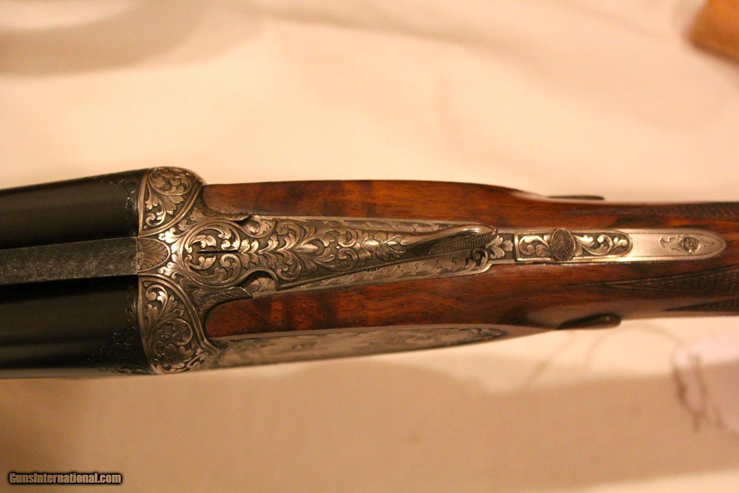 Description: A beautiful gun the engraving the wood the dimensions are great a light 5lbs 7 oz 28ga with 28in barrels has DT with a LOP 15 3/8 from the front trigger a straight english stock with a small beavertail forearm Nice deep engraving with Bolino quail on the sidelocks You wont see another one of these and a great price Cased SOLD |
