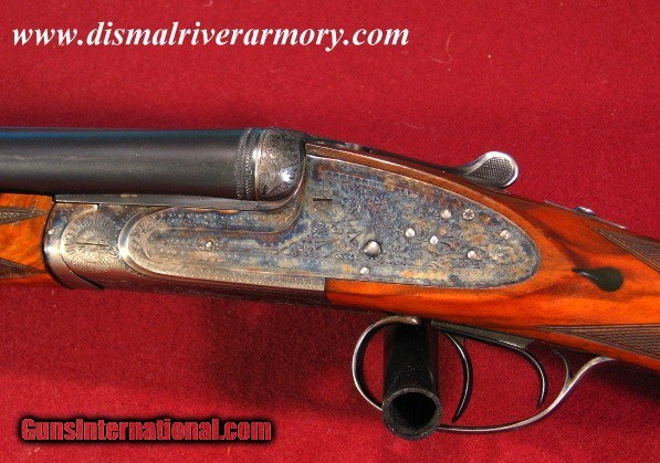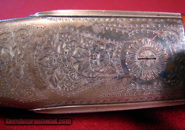 Description: L. Santina Bernardelli, Frascio, Italy 20 Gauge sidelock built in 1972 with 26 " IC / M Boehler Steel ejector barrels with a raised solid rib with white mid and front beads. Excellent bores measuring .632 on the right and .633 on the left. Chokes measure .015 right and .024 left. Chambers are 3" and so proved. Bar action sidelock with bushed strikers retains 95% original case colors and has 85% coverage floral and scroll engraving. Trigger guard with 96% original blue. Stocked in a nice piece of European Walnut with pleasing fiddleback figure. 28 LPI checkering and inlayed ebony drop points. Vacant stock oval at the toe. Original stock finish remains at 97% LOP is 14 1/2" over a 5/8" factory pad. DAC - 1 1/2" DAH - 2 " Wt - 6lb 6oz Santina Bernardelli is one of the best of the various Bernardelli gunmakers although infrequently seen in the U.S. This is a delightful upland game gun with Italian quality at the price of a Spanish sidelock. Great value. SOLD |