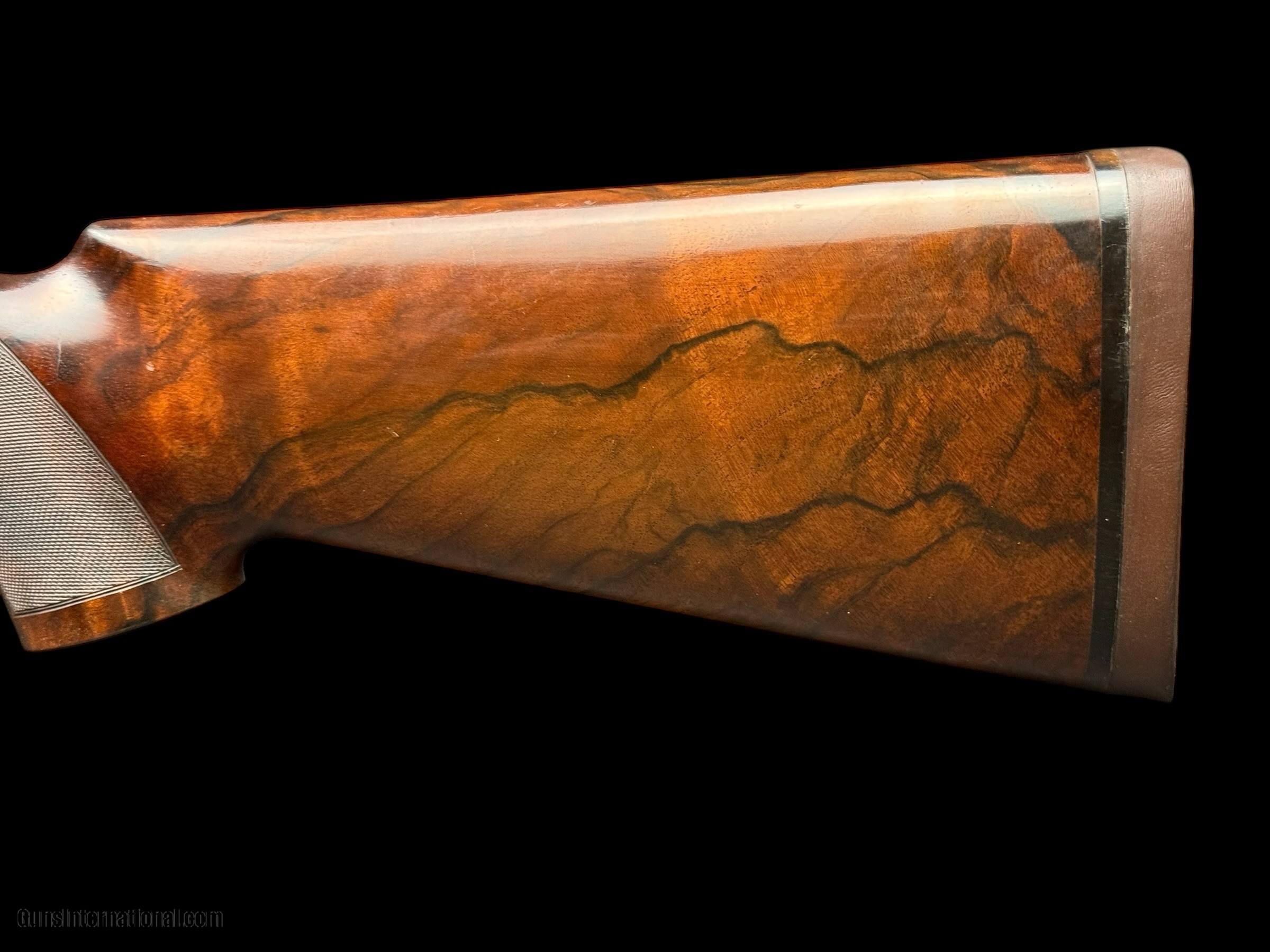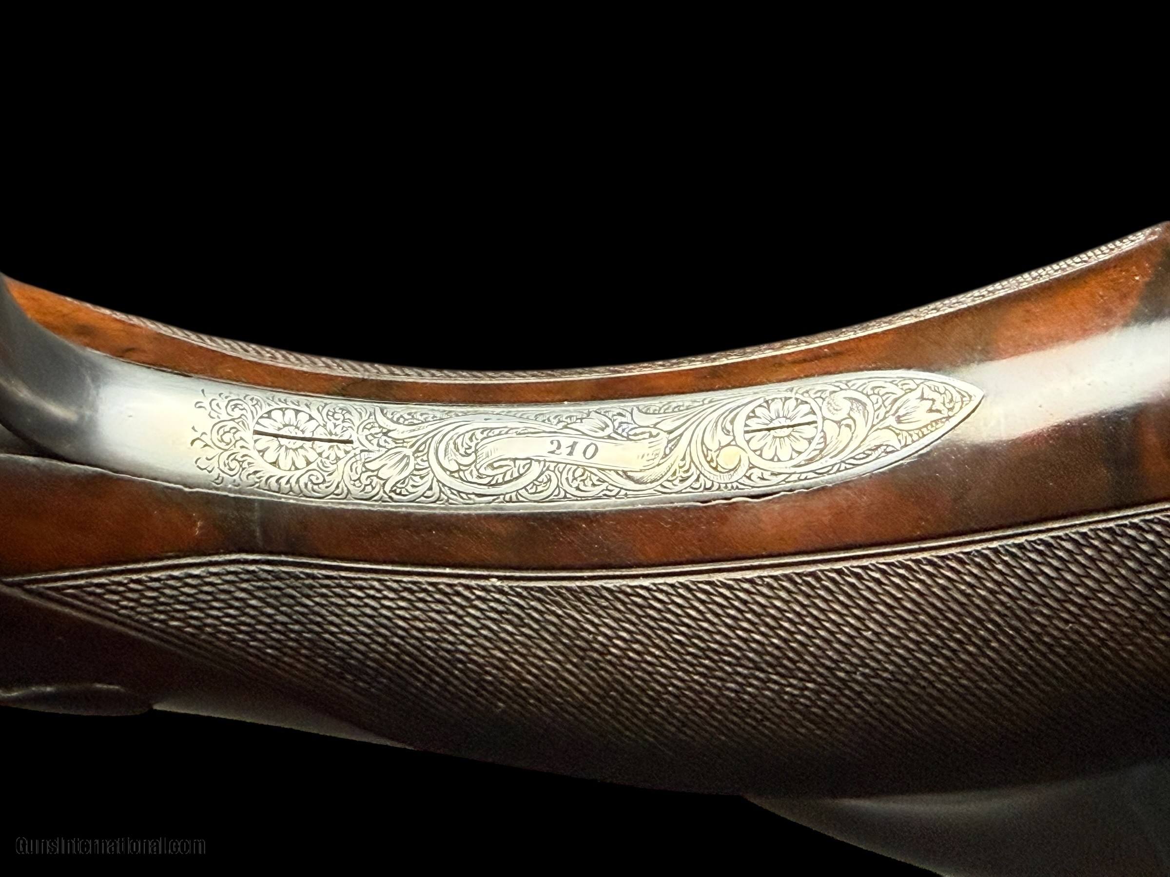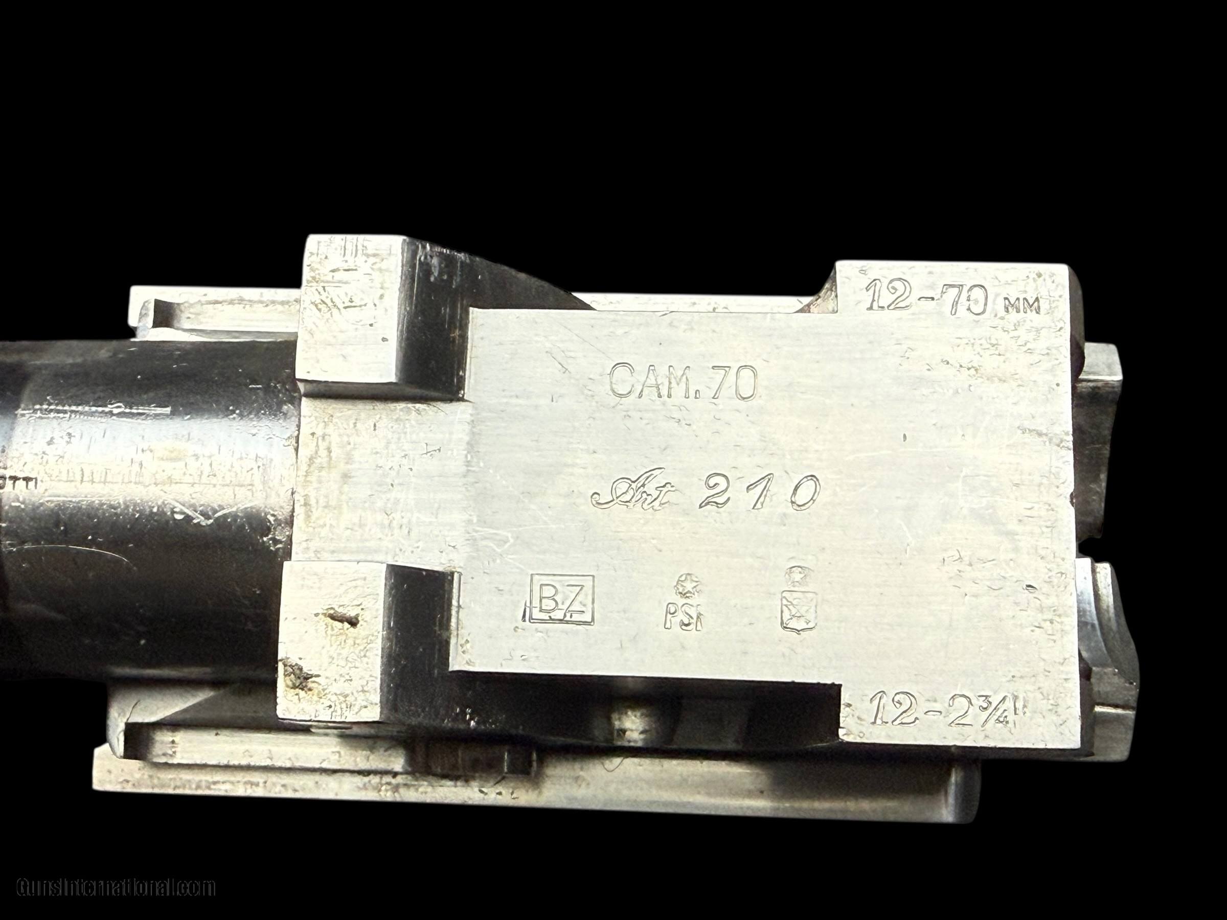 Description: ARMI ART (DENIS FONTANA) WITH CASE. Cal. 12 Ga. 2-3/4". S# 210. This little known high quality gunmaker started in business in 1996. Examination of this gun indicates his quality level approaches the very best being similar to Fratelli Rizzini and Ivo Fabbri. This fine gun has 28" demi-block barrels fitted with low flat matted ventilated rib. Left side of top barrel is engraved "ARMI ART GARDONE V.T. - ITALY". Barrel flats are stamped with 2005 Italian proofs for 2-3/4" chambers. Choke info and barrel weight are stamped on left sides of barrels. Coin finished Boss type O/U action features non-automatic safety ("SAFE" inlaid in gold), pinless locks and single non-selective trigger. Action is filed in Boss manner . S# and model ("DESIDERIO" in gold) are on watertable flats. Action and locks are engraved with very cleanly cut and attractive swirling scrolls of ribbon terminating in bouquets of flowers all within a background of small scroll. This very attractive decoration is enhanced by the portrait of a spaniel retrieving a dove on bottom of action. Engraver's signature on trigger plate reads "RiPa inc. (scroll) Piardi P." (Bullino). Beaded edge small bow trigger guard is engraved with matching scroll on bow and S# on tang. Attractively marbled and stump figured European walnut extreme pistol grip buttstock measures 14-3/4" over brown Kickeez pad. Stock features nicely shaped drop points and closely spaced point pattern checkering on grip with right hand palm swell. Semi-beaver tail one piece ejector forend has Anson type release. MEASUREMENTS: BBLS: Bore Diameter: O .728. U .727. Restriction: O .025 (mod). U .012 (light mod). Wall thickness: O .028. U .032. STOCK: DAH: 1-1/2". DAC: 1-3/8". CAST: about 1/2" off. LOP: 14-3/4". WEIGHT: 8 lb. 0 oz. UNATTACHED ACCESSORIES: Gun is housed in its original tan leather case with stitched leather corners; lined in wine colored cloth. Brown leather Armi Art label is in lid along with information label pertaining to this gun stating that it was made for Daniel Bernal Torres. Case contains bags for barrel and action and 2 keys. CONDITION: Exceptionally fine; shows evidence of being fired very little with faint halos on breech face. Barrels retain over 98% blue with some sharp edge wear. Coin finish of action remains bright and clean. There are a few minor marks and dings in original finish of stocks. Checkering is somewhat darkened and very lightly worn. Bores are bright and shiny with no visible imperfections. Mechanically fine. Case is also fine with some marks and scratches on exterior. Straps and handle are strong. Interior cloth show some compressions. FLAT $100 S/H/I FFL REQUIRED CARD FEE APPLIES ABOVE DESCRIPTION EDITED VERSION OF MAL MACGREGOR WRITING. Shotgun Gauge: 12 Gauge Manufacturer: ARMI ART - DENNIS FONTANA Model: BOSS STYLE O/U - DESIDERIO Serial Number: 210 Barrel Length: 28 Chambers: 2.75 OR 70MM Ejectors: YES Condition: EXC Metal Condition: EXC Wood Condition: EXC Bore Condition: EXC Action: SIDELOCK Triggers: SINGLE Price: $17,900.00 Contact Seller |