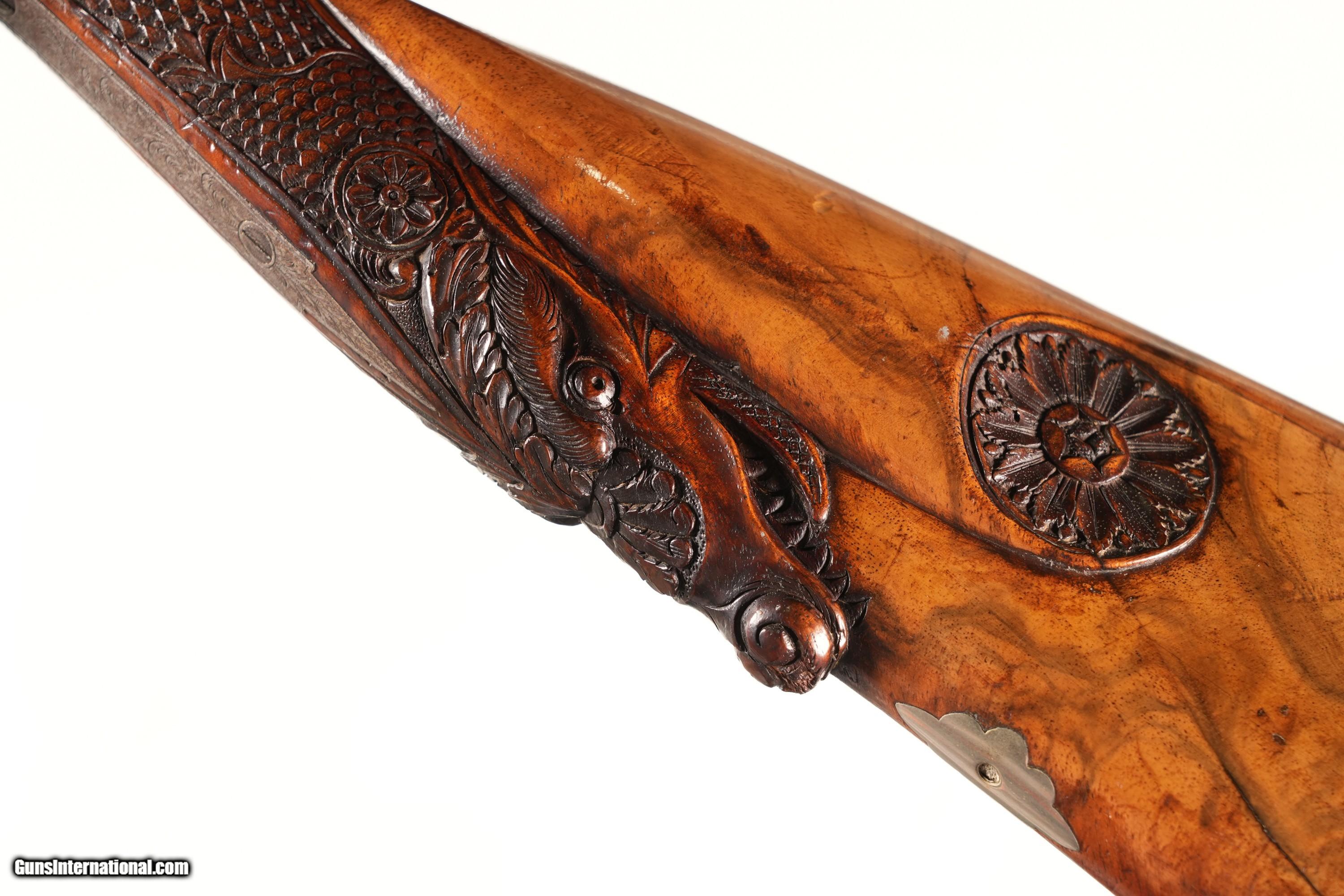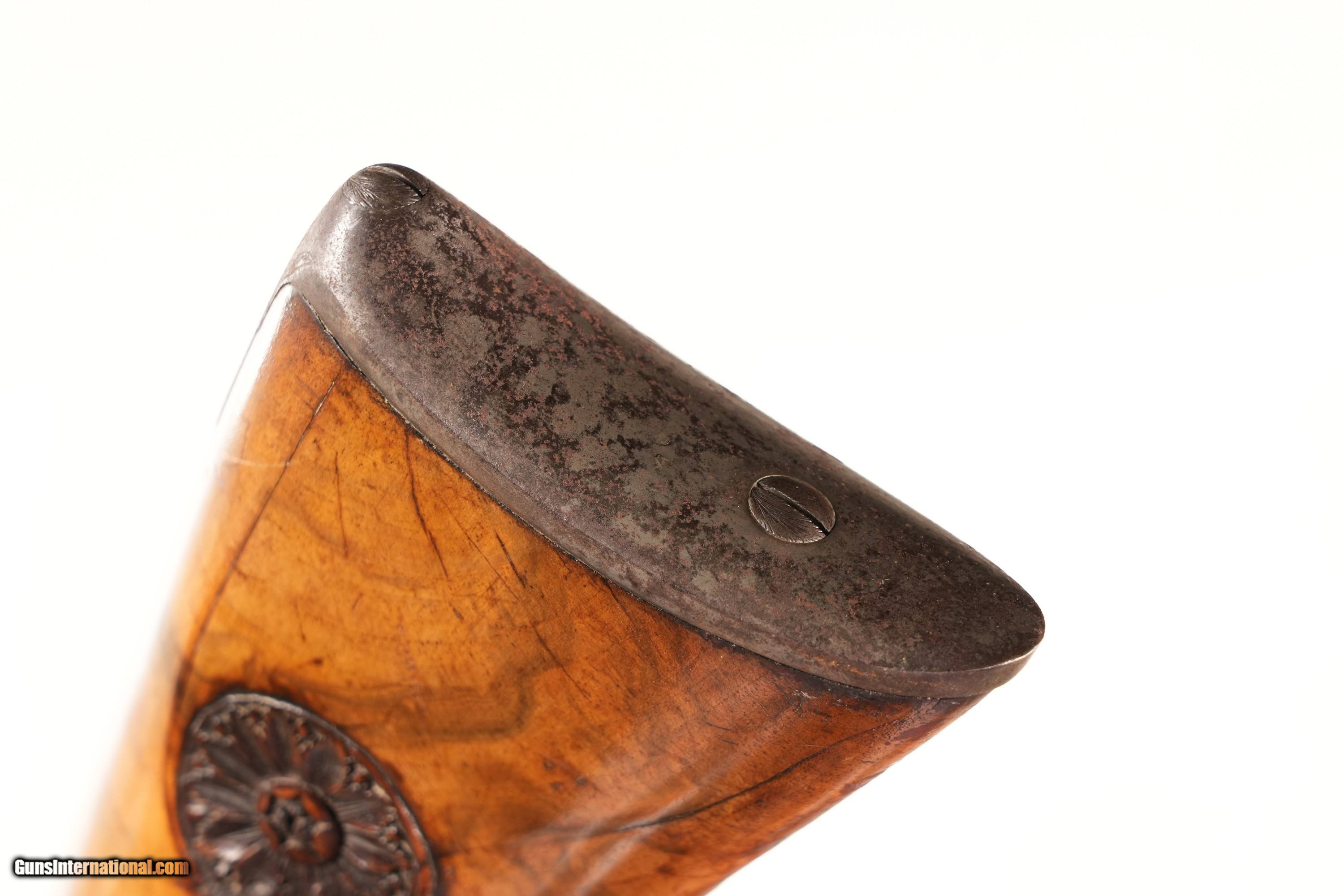 This example is in excellent overall condition, tastefully restored, with Damascus barrels displaying good pattern, suitable for display or careful use. The floral and border-engraved locks add visual allure, complemented by the carved dragon-motif walnut stock with minimal handling marks for an elegant hold. The percussion action operates mechanically excellent, with a tight lockup reflecting period craftsmanship. Don’t miss this Italian Target Percussion Shotgun—a very fine 16 Gauge side-by-side in excellent restored condition, perfect for collectors or period enthusiasts. Click “Buy It Now” or call 478-337-1000 to claim this historical treasure today! Purchase Details: