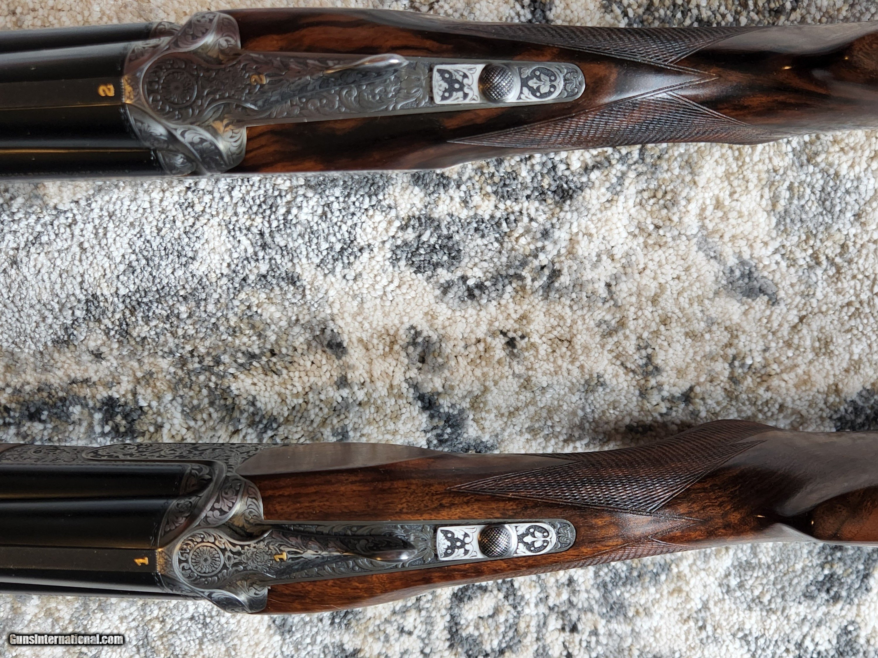 Description: Matched pair of Perazzi SCO 12 ga. Shotguns. Consecutive serial number guns feature scroll engravings by RIPA, Stocks by Paul Hilmer and Chokes by Teague. Excellent condition, as pictured. Delivered in makers case with ~ 30 Teague chokes marked and matched to these barrels. Best Offer. DAC 1.5" DAH 2" Cast off 5/16" LOP 14.5" Barrels are 28 1/4 SOLD Shotgun Gauge: 12 Gauge Manufacturer: Perazzi Model: SCO Barrel Length: 28 |