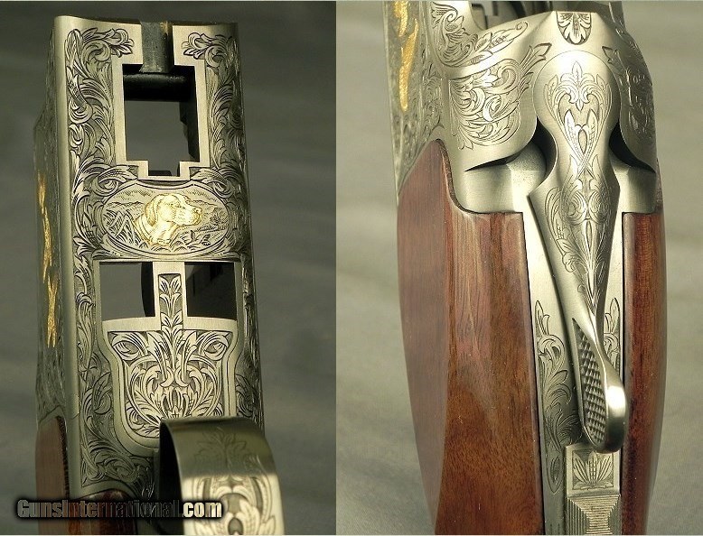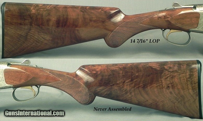 Description: #23158ZY131, Browning Citori 16 Bore Grade 7 Citori Lightning Model with 7 Gold Inlays, Remains New in the Box and Never Assembled, 28" Barrels with 3 each flush factory Invector chokes, 2 3/4", Greyed metal, Single selective trigger, Game forend, Round Knob pistol grip stock at 14 7/16" LOP over the Browning buttplate, Very nice wood with excellent color and contrast, 7 lbs. 3 oz., 97% coverage of nice floral engraving with 3 Gold Grouse, 3 Gold Bobwhite Quail and a Gold Pointer on the bottom. It Remains new in the factory box. These 16 Bores in Grade 7 are few and far between. SOLD |