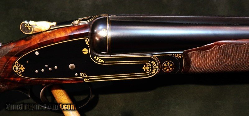 Description: AUGUST LEBEAU, SPECIAL ORDER GRAND LUX SIDELOCK 12GA PIGEON GUN, 3 BBL SET, S/S, FABULOUS ART DECO GOLD WIRE ENGRAVING BY ALAIN LOVENBERG, 3 BBL SET- DE WAHREYNE STEEL BBLS, ALL 28", 2 3/4, #1: SK/MOD, #2 LM/IM, #3 IM/FULL, HAND FILED RAISED GAME RIB, EJECTORS, SINGLE TRIGGER, EXHIBITION GRADE WALNUT, PISTOL GRIP, BEAVERTAIL FOREND, PRECISE DELUXE CHECKERING, LOP 14 3/4, 1 3/8, 2", 7LBS 12OZ, BEST FACTORY OAK & LEATHER CASE, IN EXCELLENT ORIGINAL CONDITION, TIGHT ACTION, MINT BORES ~!! SOLD Shotgun Gauge: 12 Gauge Manufacturer: AUGUST LEBEAU Model: SP ORDER GRAND LUX SIDELOCK PIGEON GUN Barrel Length: 28" BBLS Bore: 12GA Chambers: 2 3/4 Ejectors: YES Condition: EXCELLENT ORIGINAL CONDITION Metal Condition: EXCELLENT BLUE ! Wood Condition: EXCELLENT WOOD ! Bore Condition: MINT BORES ! Action: S/S Triggers: SINGLE TRIGGER Stock: BEAUTIFUL EXHIBITION GRADE WALNUT, PISTOL GRIP Fore End: BEAVERTAIL FOREND LOP: LOP 14 3/4, 1 3/8, 2 Rib: HAND FILED RAISED RIB Weight: 7LBS 12OZ Manufacture Date: 1983 MFG DATE Chokes: #1: SK/MOD #2: LM/IM #3: IM/FULL Engraving: FABULOUS ART DECO GOLD WIRE ENGRAVING BY ALAIN LOVENBERG Case: BEST FACTORY OAK & LEATHER CASE Item Location: SAFARI OUTFITTERS LTD. 2517 ROUTE 44 SALT POINT, NY 12578 |