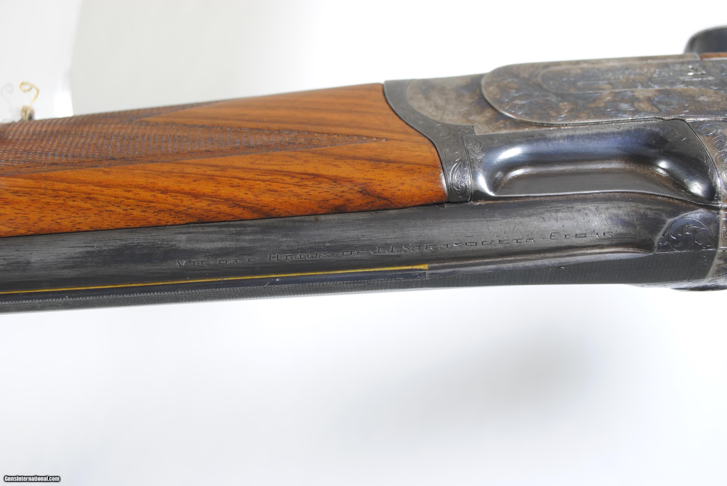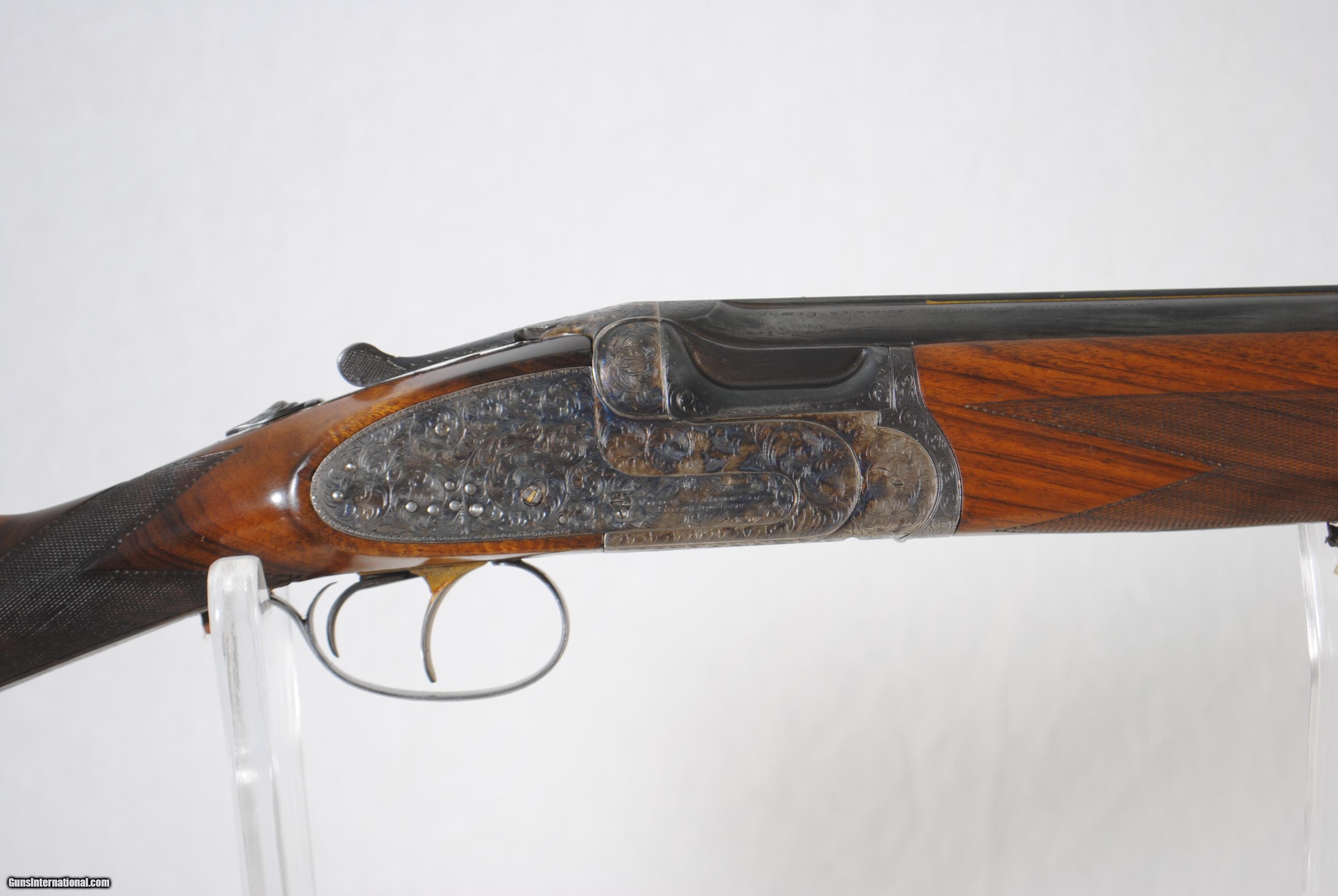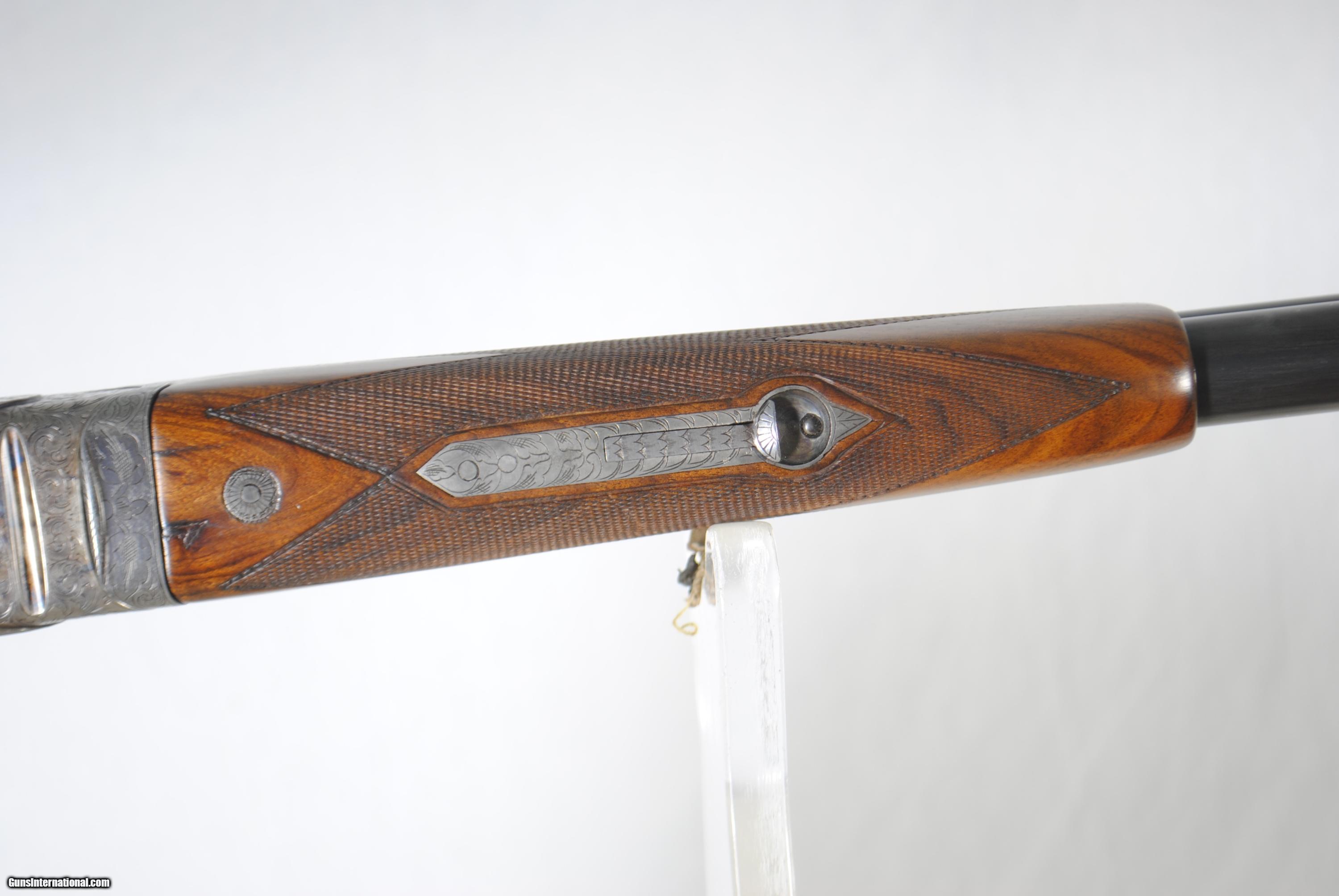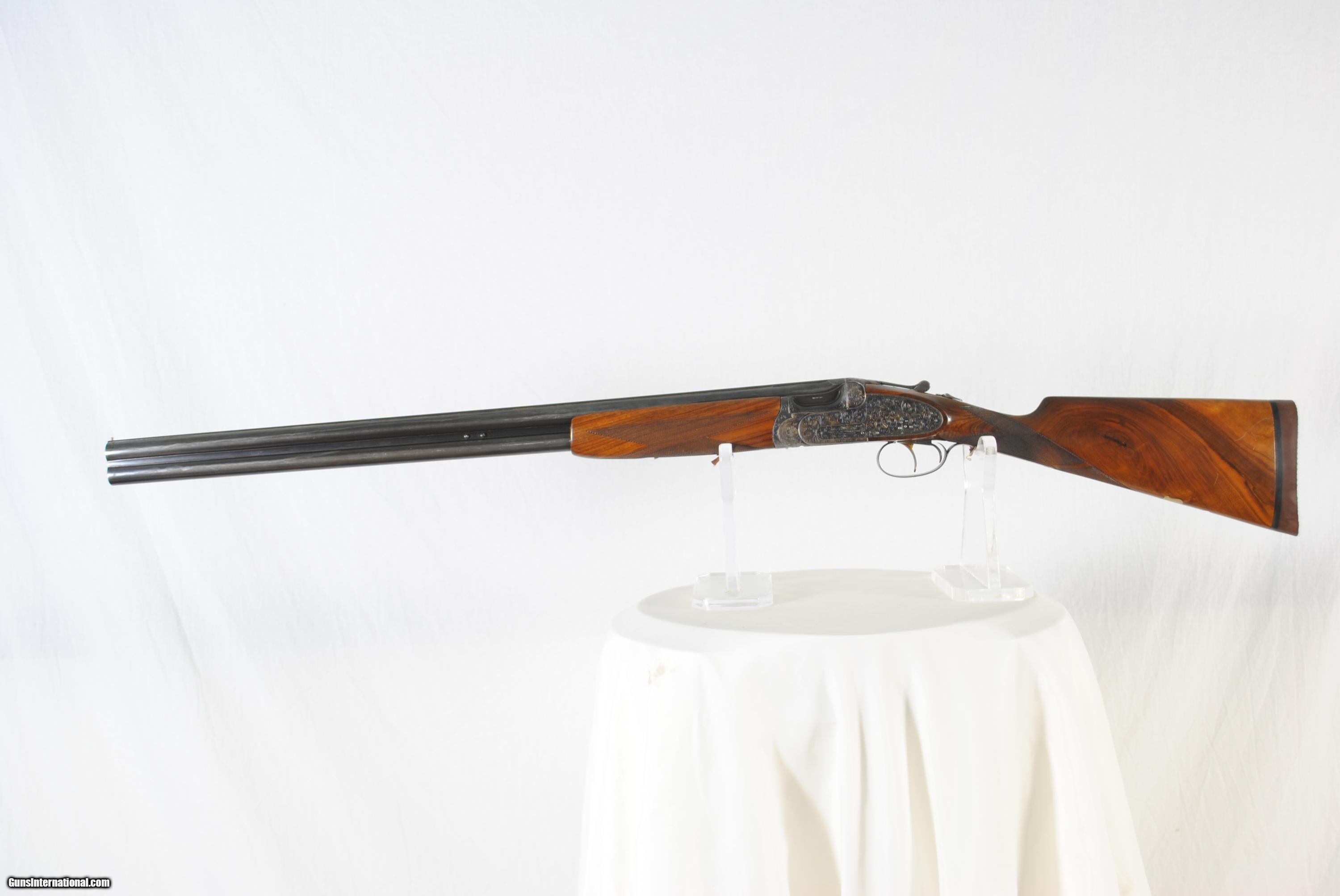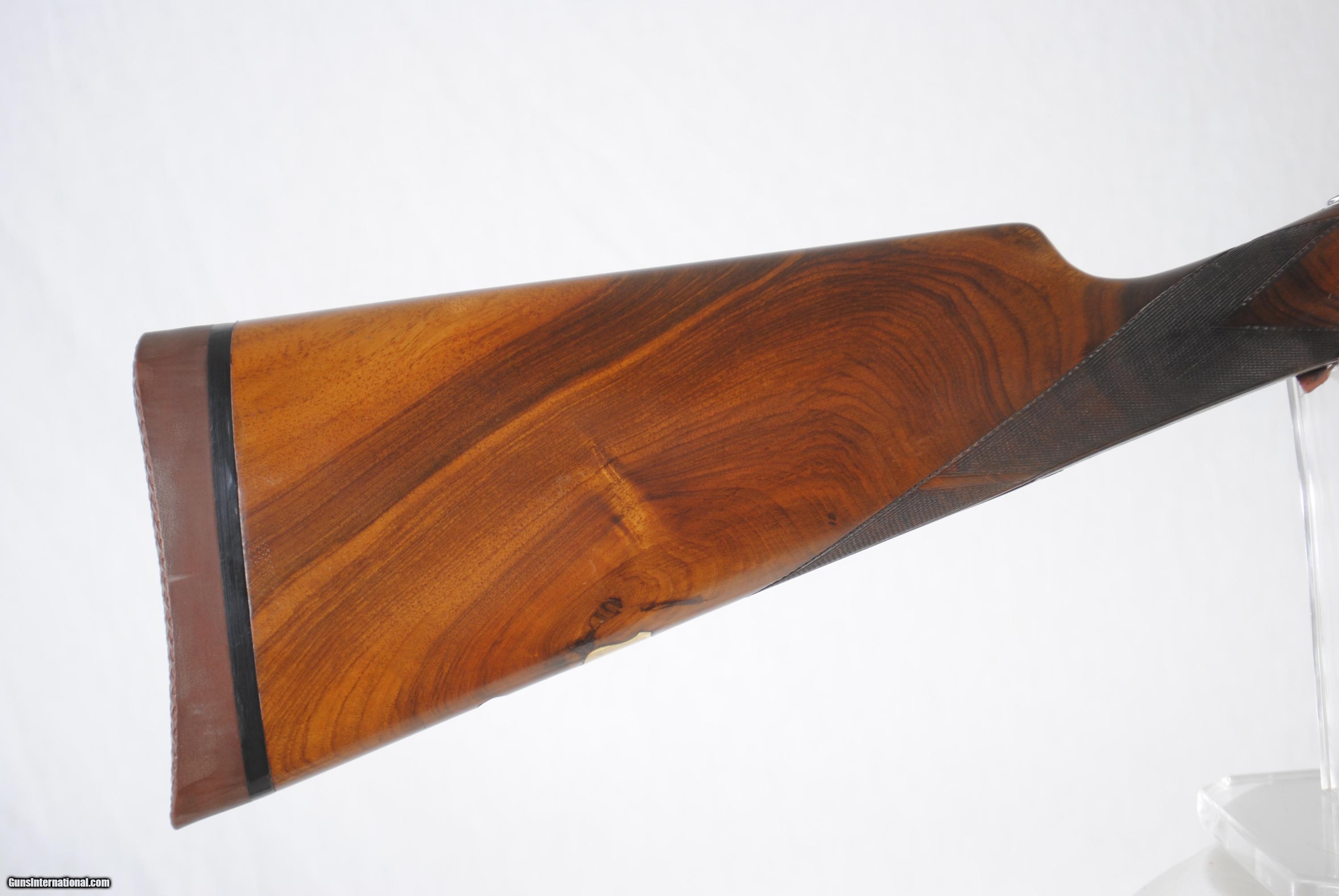 Description: JJ Saraquesta Model 133 Live Pigeon Gun in 12 gauge. Beretta Style SO copy with trunions and lumps at the top of the breech. I believe the gun was made in the 1950's. The 28" chopper lump barrels are all original. Bohler Steel. Top barrel stamped 17.5 for choke / 18.4 bore Metric conversion to 1000's = .688/.724 Bottom 17.7 / 18.4 = .696/724. Live bird chokes at Imp Mod and Full. Italian system ejectors - I have seen this system on Italian guns from that same time period. Ejectors well timed. Back action locks. Internal parts and some external parts are gold plated. No cracks to stock - small chip out at right lock plate. LOP - 14 3/8", Drop at comb is 1 3/8", Drop at Heel is 2 1/16". Sharp checkering with skip line boarder. Weight is approximately 7 LBS. A very cool gun. Double trigger straight grip OUs are hard to find. Very well balanced. For inquiries please call Guy - 407-721-3748 SOLD |