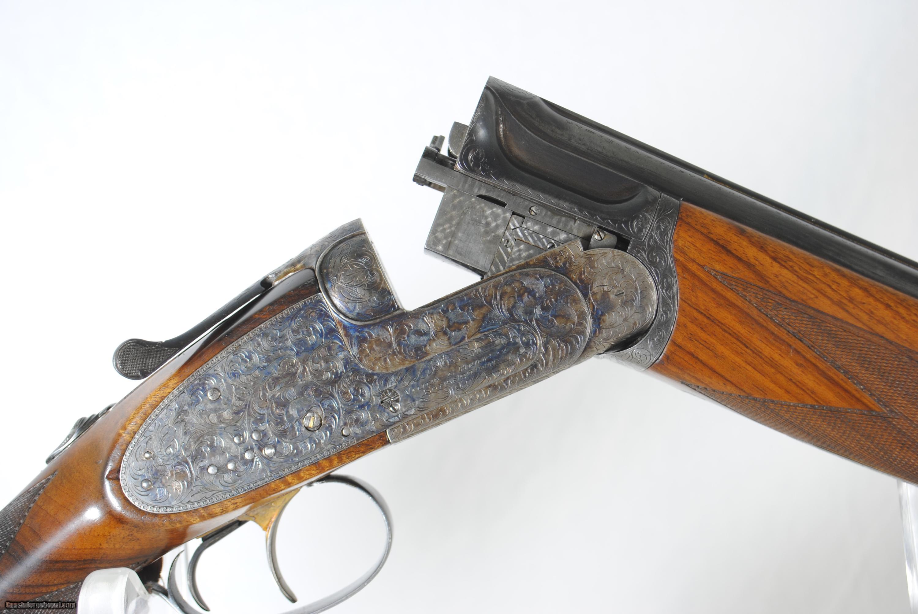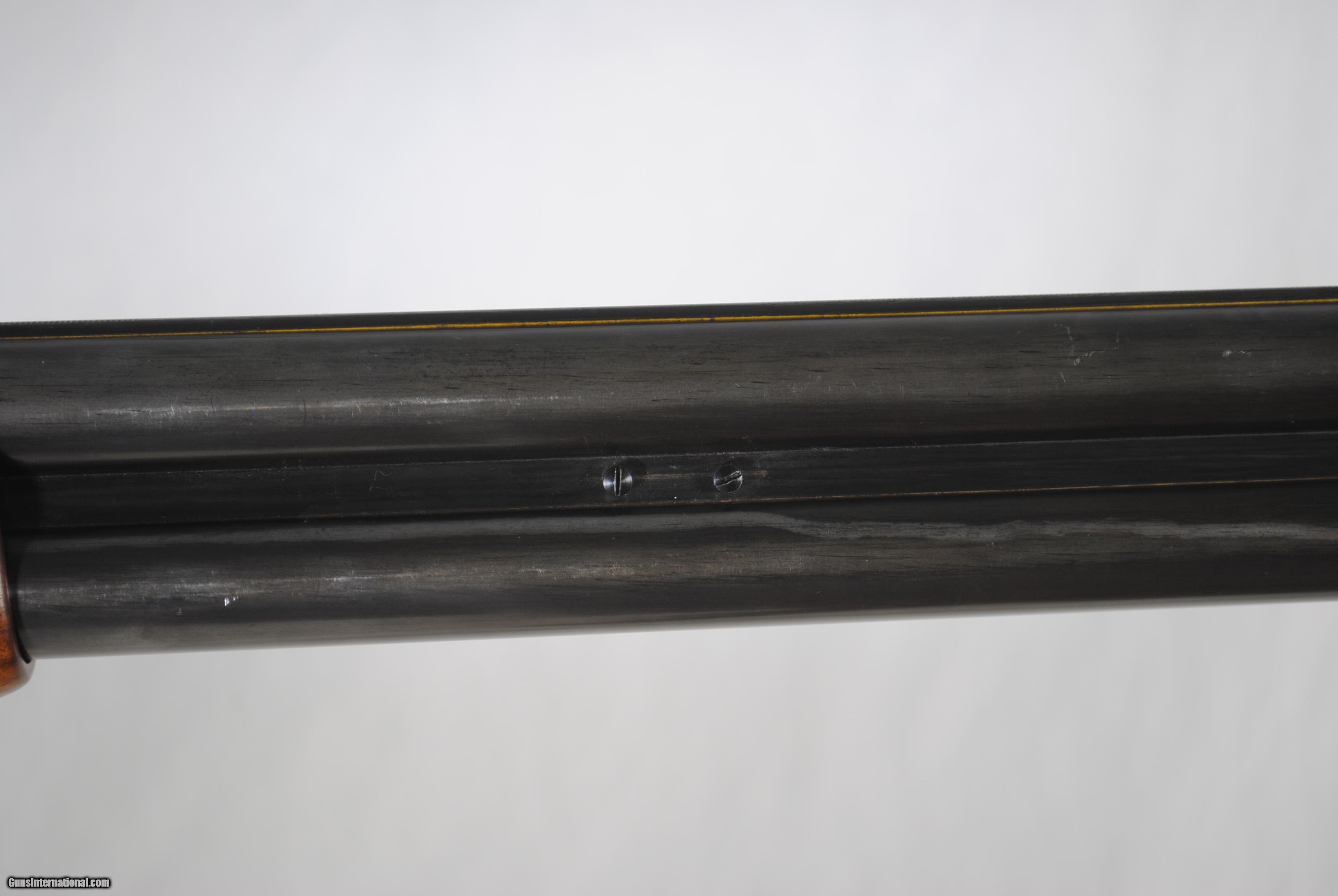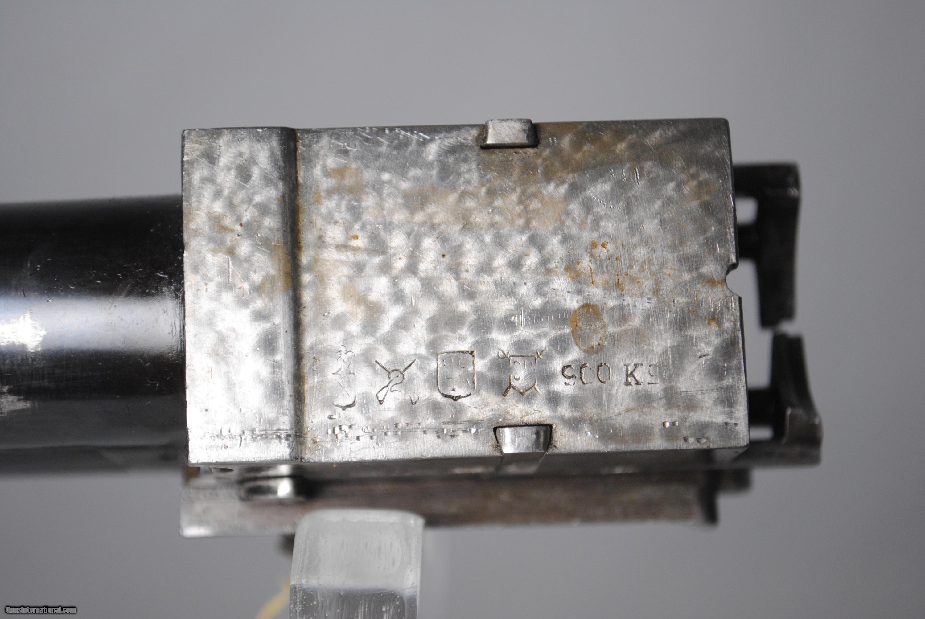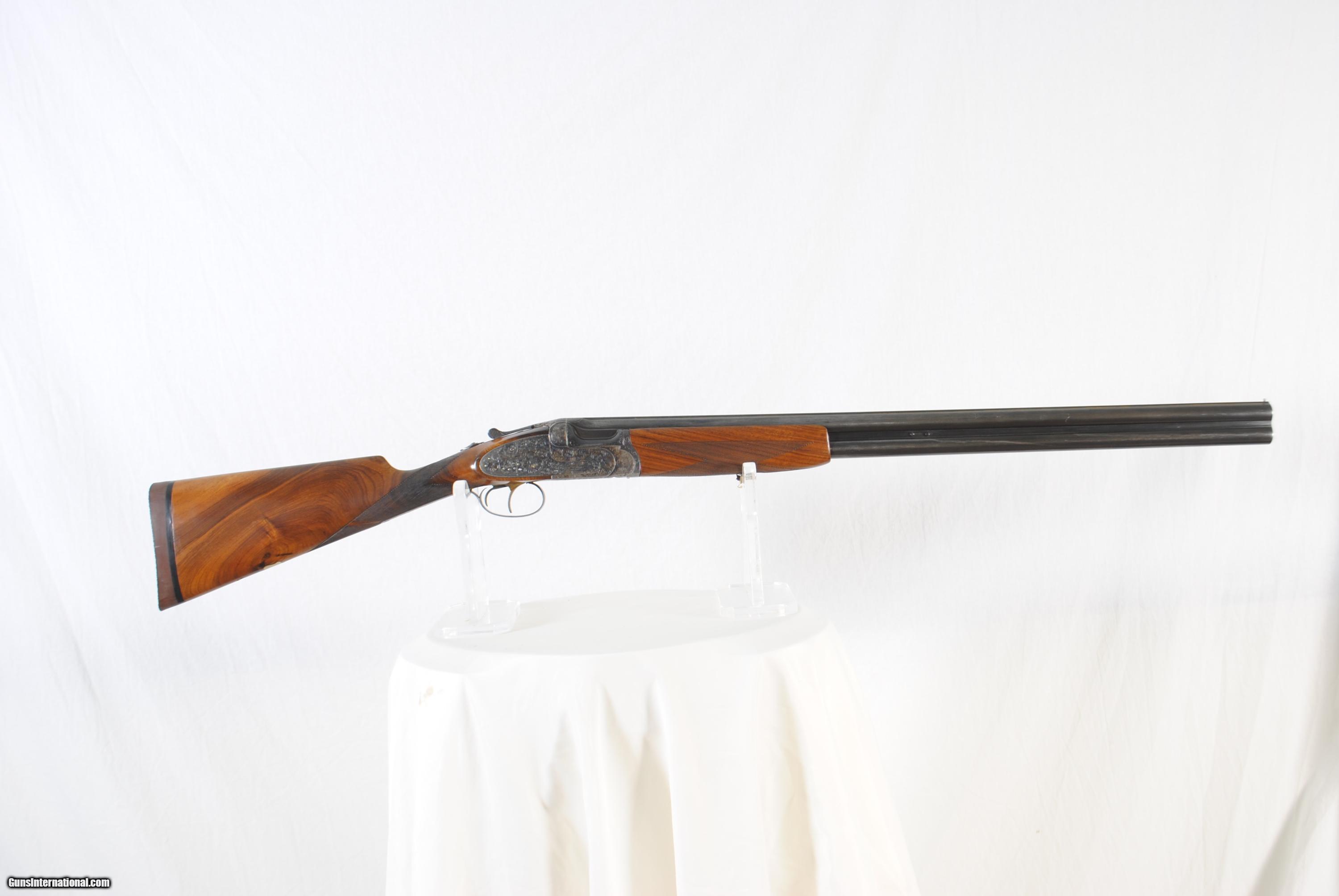 Description: JJ Saraquesta Model 133 Live Pigeon Gun in 12 gauge. Beretta Style SO copy with trunions and lumps at the top of the breech. I believe the gun was made in the 1950's. The 28" chopper lump barrels are all original. Bohler Steel. Top barrel stamped 17.5 for choke / 18.4 bore Metric conversion to 1000's = .688/.724 Bottom 17.7 / 18.4 = .696/724. Live bird chokes at Imp Mod and Full. Italian system ejectors - I have seen this system on Italian guns from that same time period. Ejectors well timed. Back action locks. Internal parts and some external parts are gold plated. No cracks to stock - small chip out at right lock plate. LOP - 14 3/8", Drop at comb is 1 3/8", Drop at Heel is 2 1/16". Sharp checkering with skip line boarder. Weight is approximately 7 LBS. A very cool gun. Double trigger straight grip OUs are hard to find. Very well balanced. For inquiries please call Guy - 407-721-3748 SOLD |