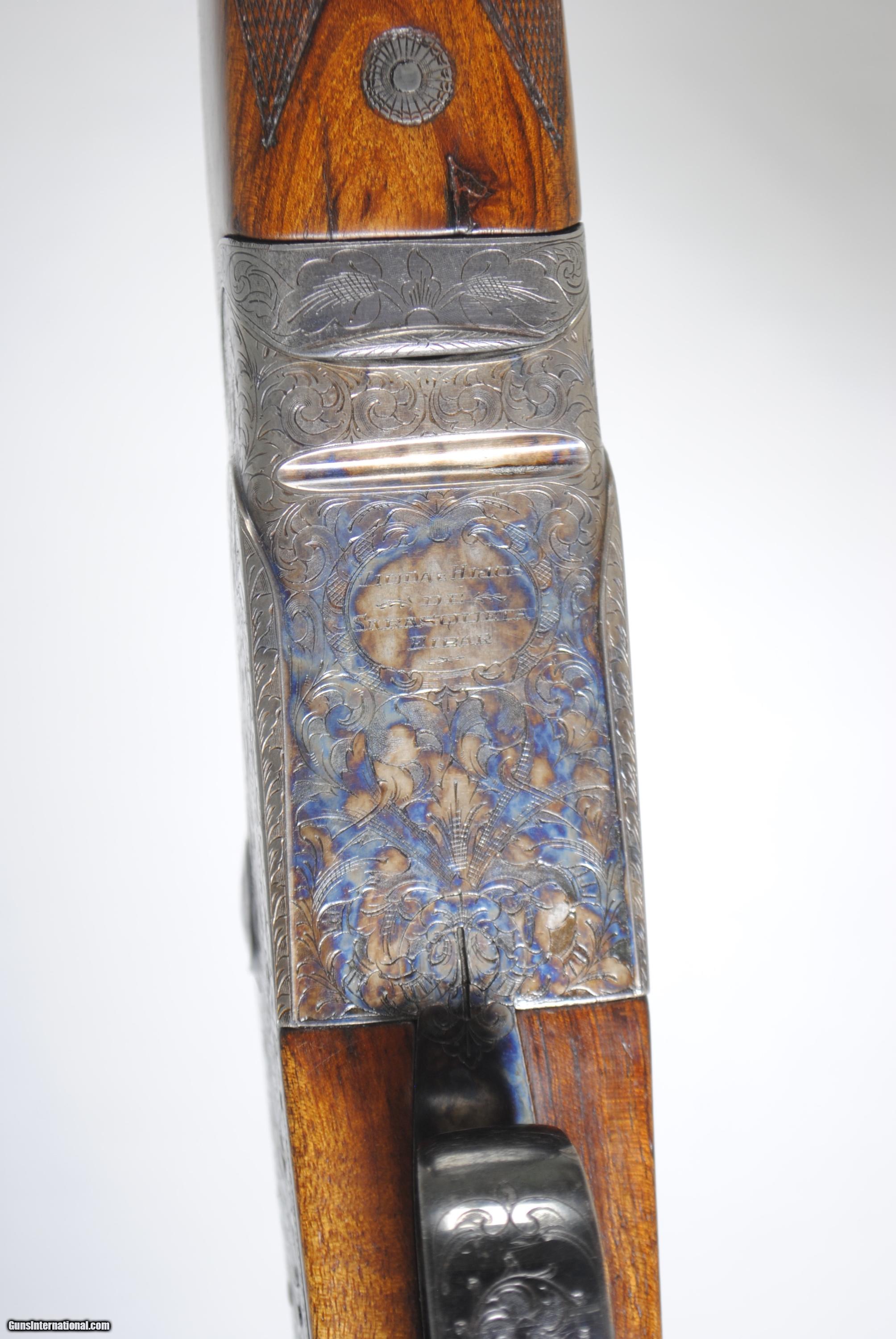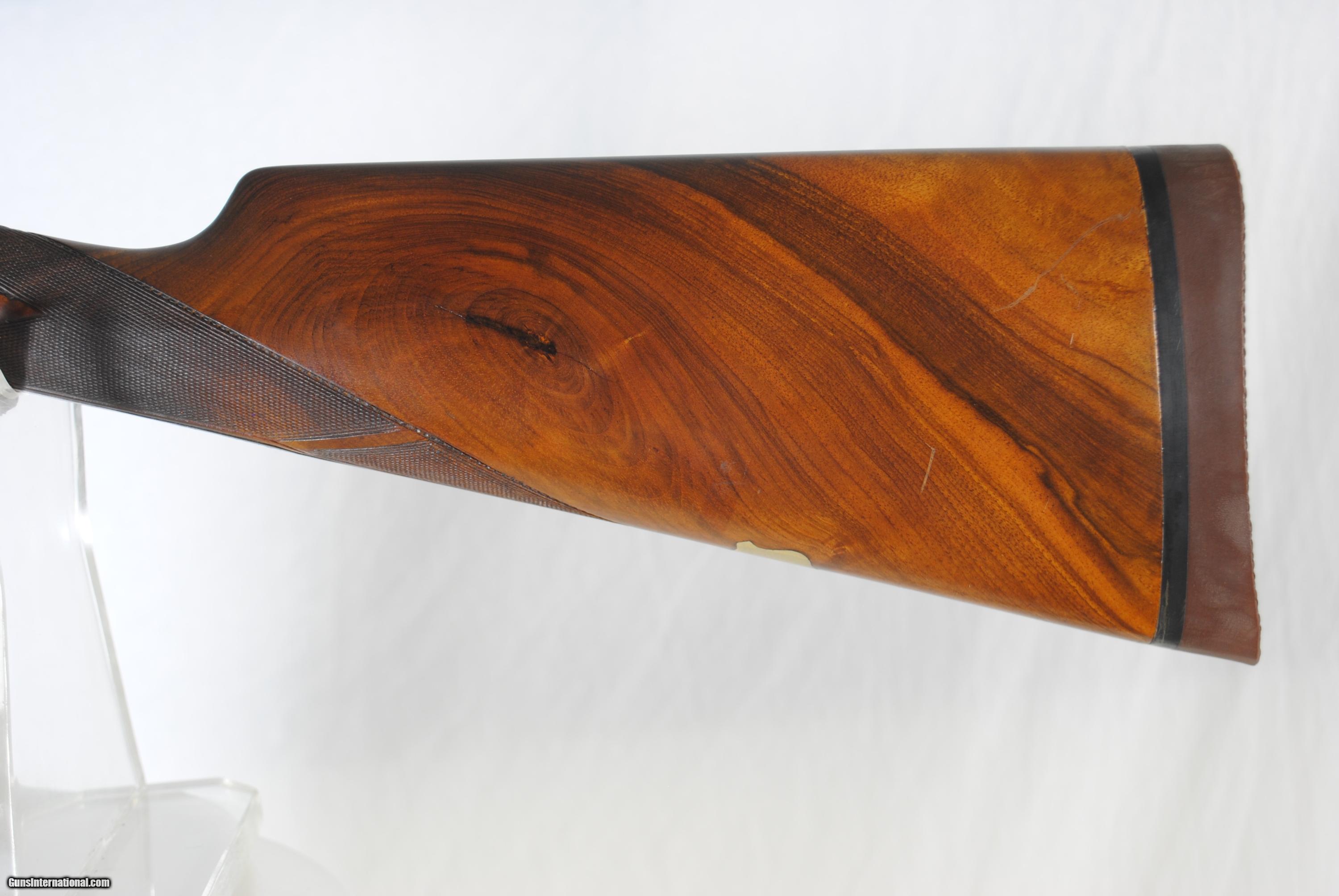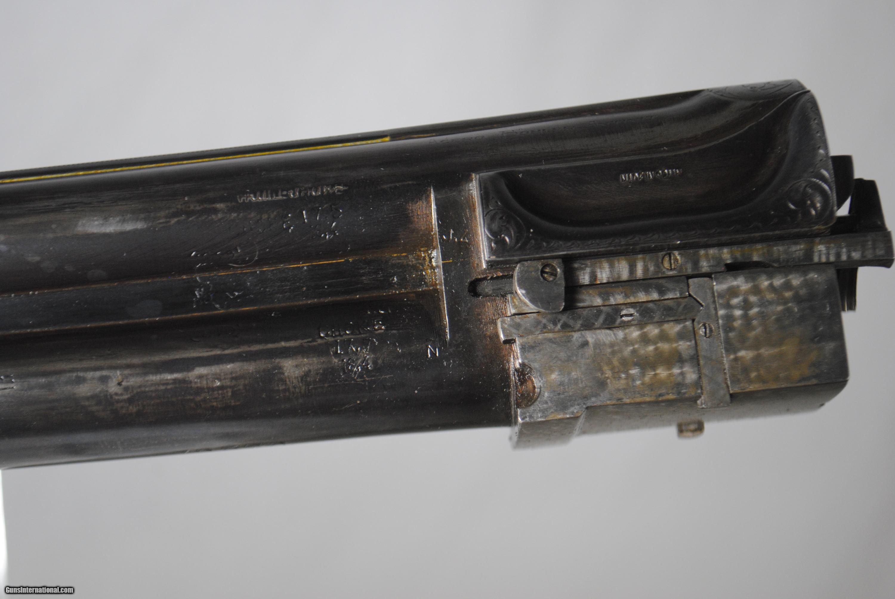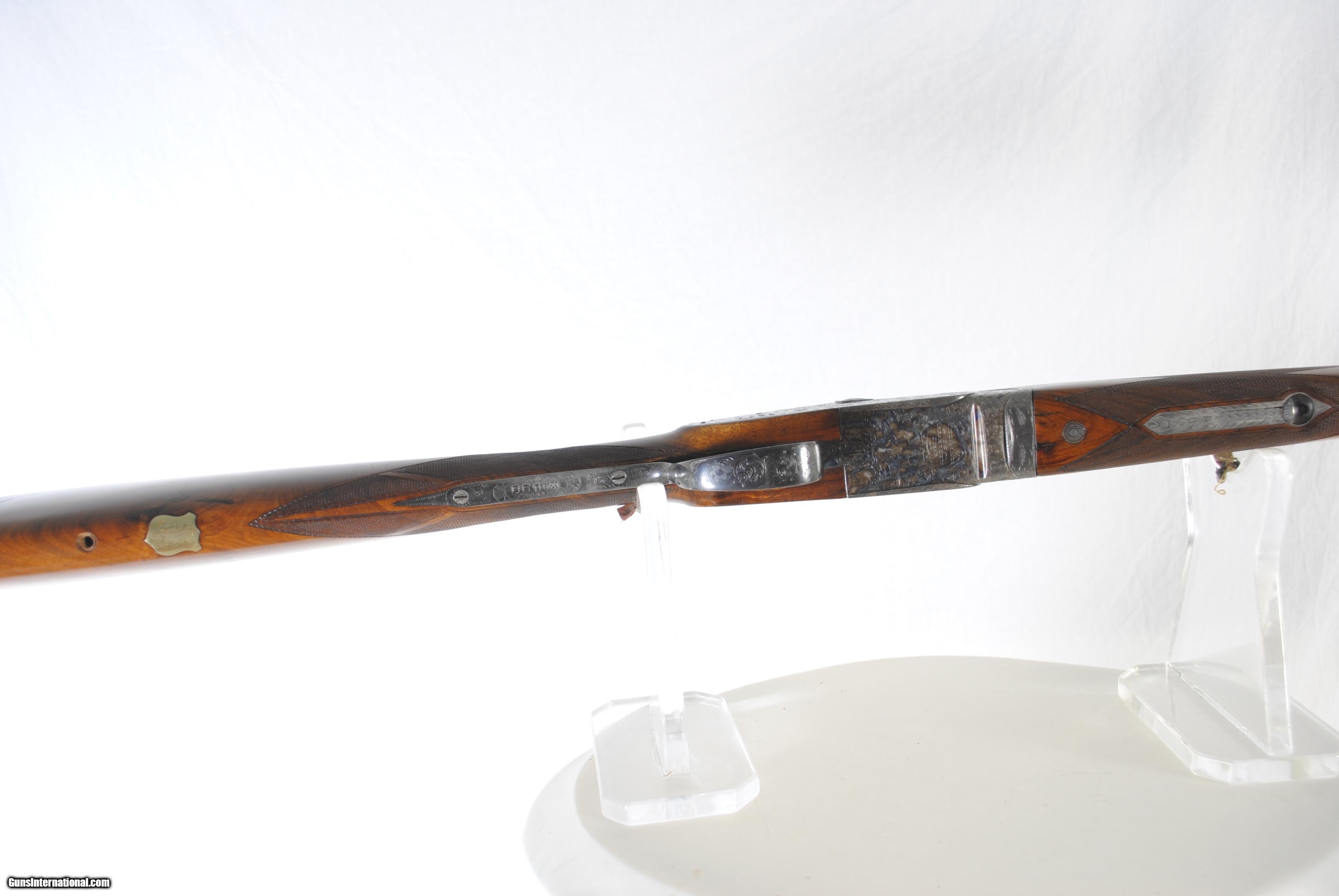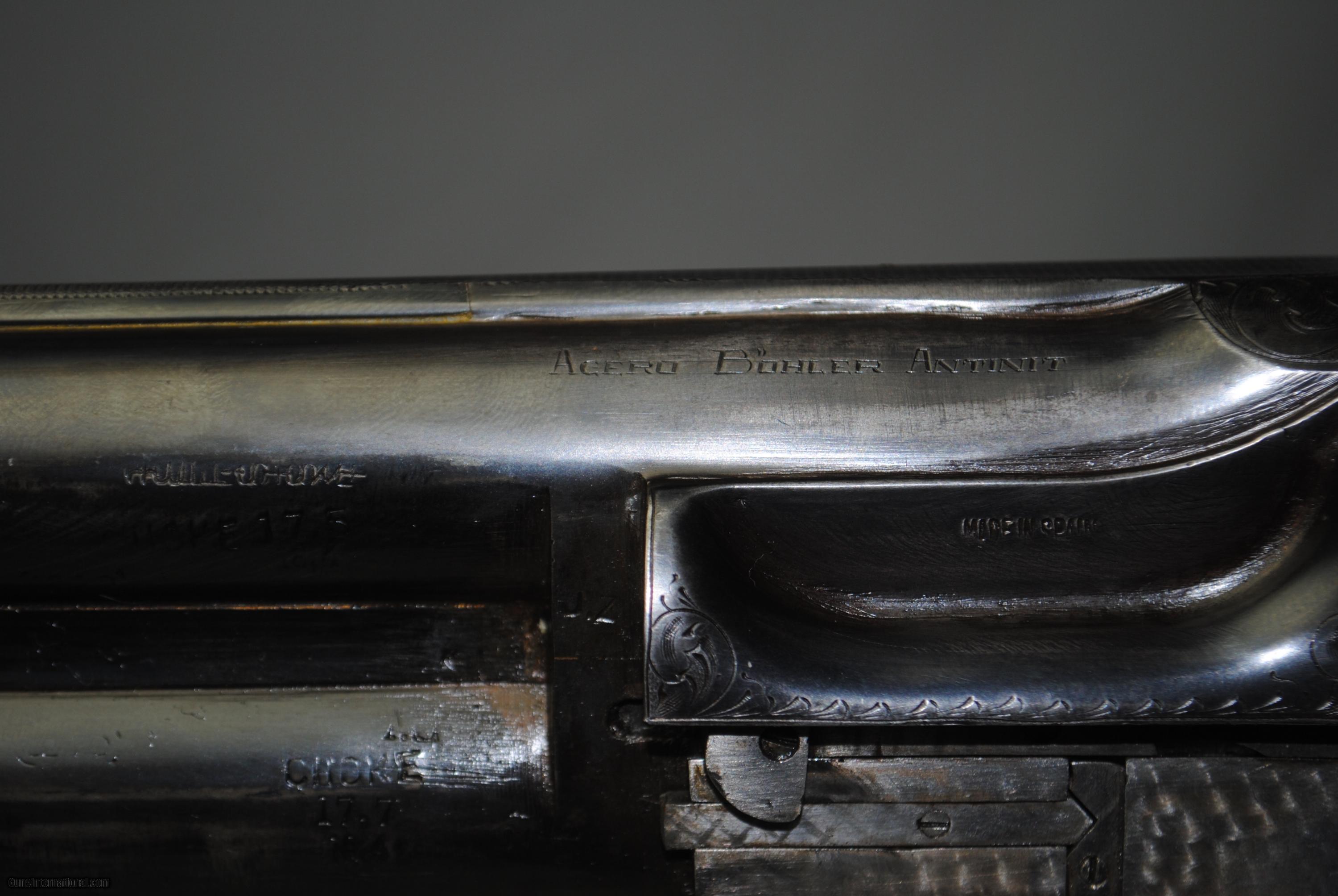 Description: JJ Saraquesta Model 133 Live Pigeon Gun in 12 gauge. Beretta Style SO copy with trunions and lumps at the top of the breech. I believe the gun was made in the 1950's. The 28" chopper lump barrels are all original. Bohler Steel. Top barrel stamped 17.5 for choke / 18.4 bore Metric conversion to 1000's = .688/.724 Bottom 17.7 / 18.4 = .696/724. Live bird chokes at Imp Mod and Full. Italian system ejectors - I have seen this system on Italian guns from that same time period. Ejectors well timed. Back action locks. Internal parts and some external parts are gold plated. No cracks to stock - small chip out at right lock plate. LOP - 14 3/8", Drop at comb is 1 3/8", Drop at Heel is 2 1/16". Sharp checkering with skip line boarder. Weight is approximately 7 LBS. A very cool gun. Double trigger straight grip OUs are hard to find. Very well balanced. For inquiries please call Guy - 407-721-3748 SOLD |