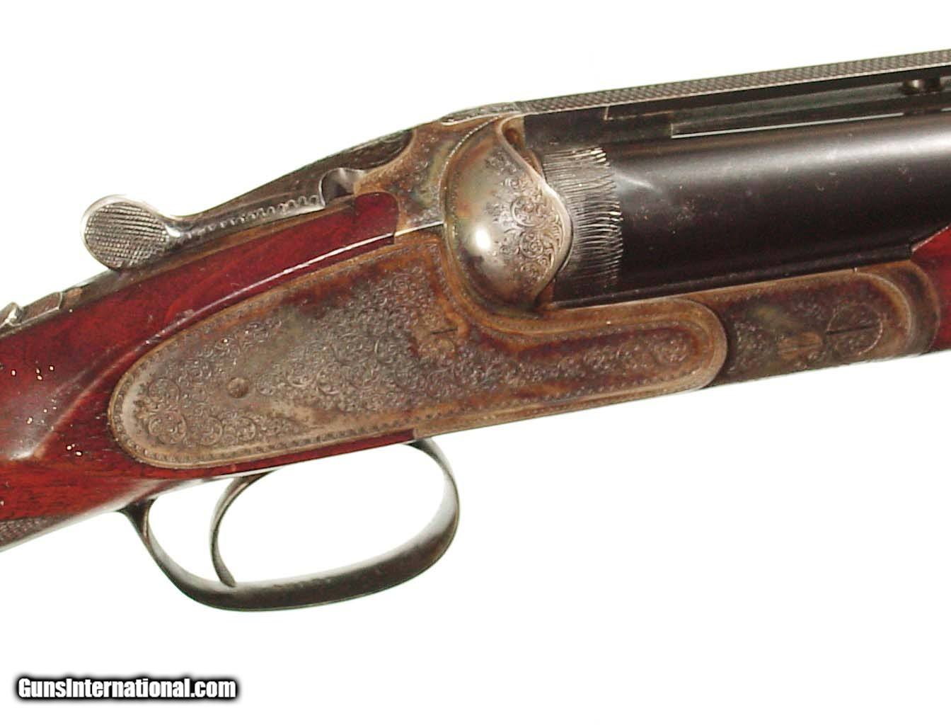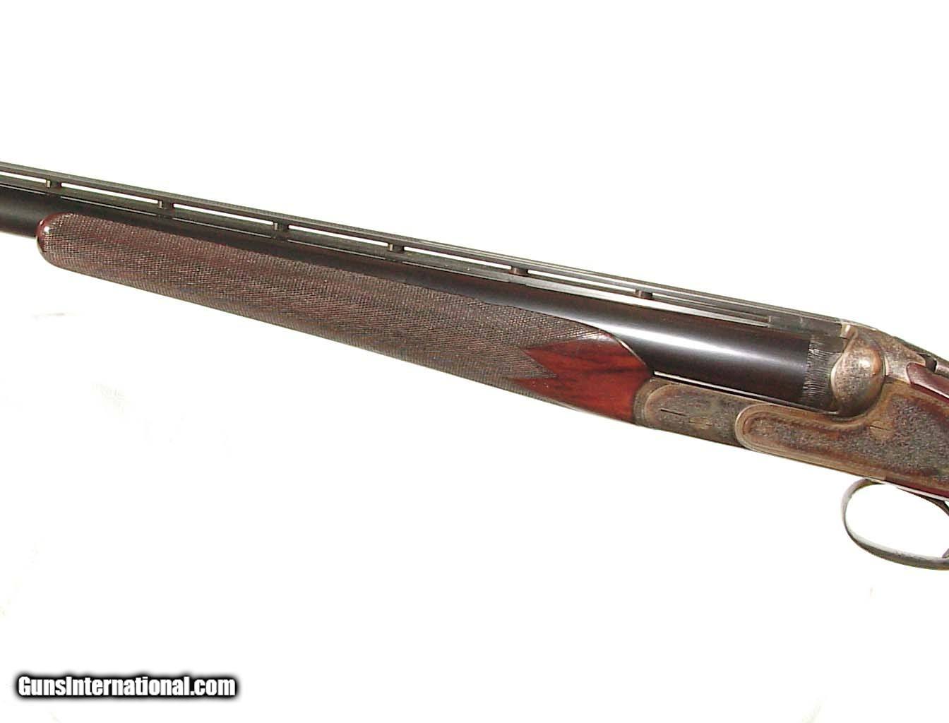 Description: 12 gauge, 32" vent rib barrels with auto ejectors and choked full & full. Top lever, side clips, single non selective trigger, and side plates. Checkered beavertail forend and pistol grip buttstock ending with a black pad. Beautifully casehardened receiver with engraved in fine English scroll that extends to the breech end of the barrels. The bottom of the receiver is marked in gold "HEROLD". Retaining nearly all of the original case colors, minty wood and perfect bores with massive wall thickness. LOP: 13 3/4" from a rear position trigger. COMB: 1 3/4" HEEL: 1 7/8". Weight: 8lbs 4oz. Mfg. date on the reciever June 1934 (734). SOLD Curio/Relic: Yes |