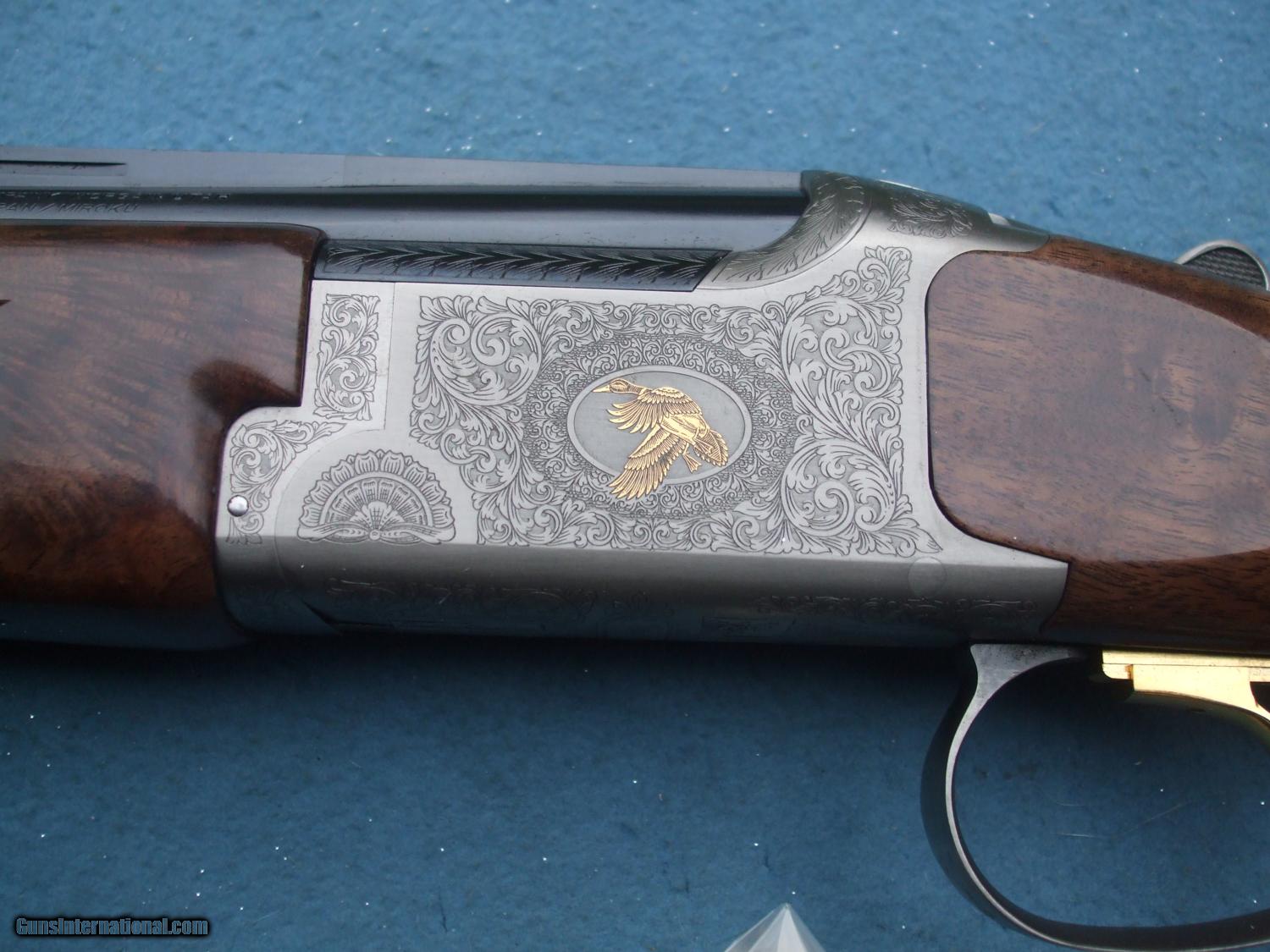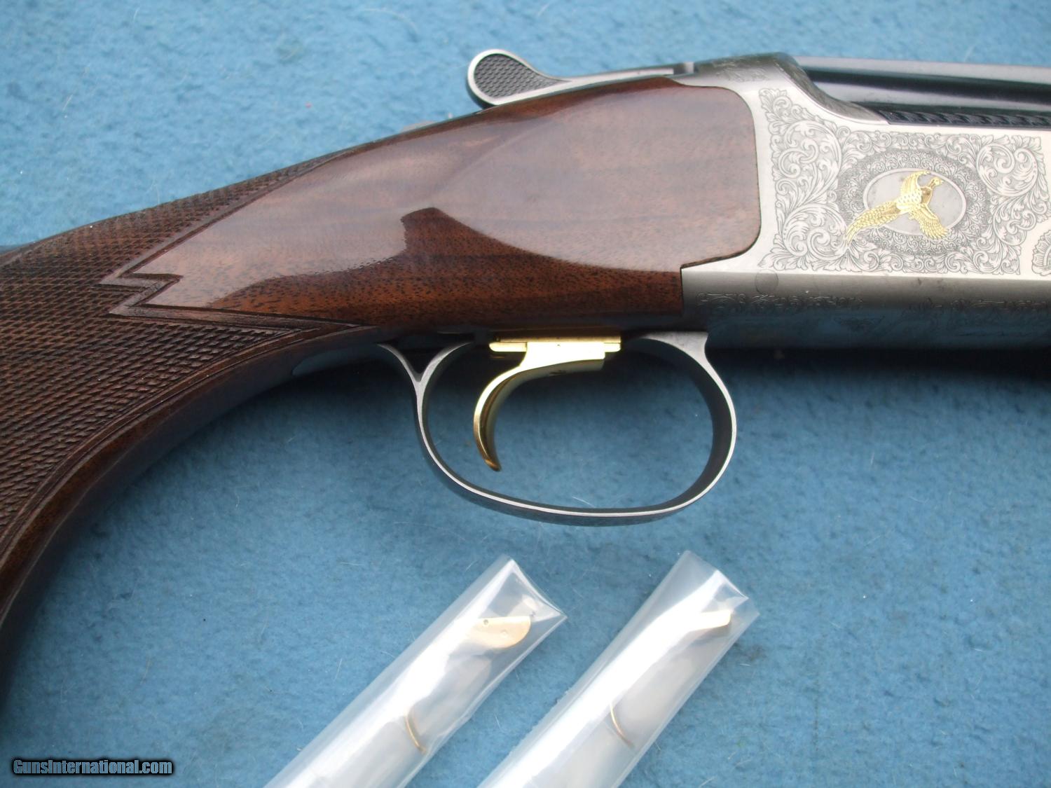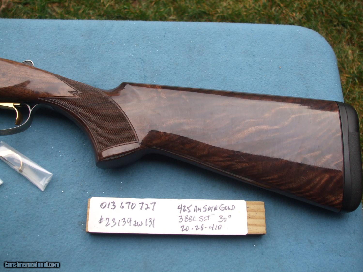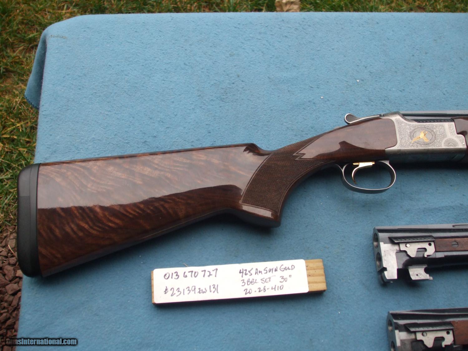 Description: Browning 425 Sporting American Sporter Gold custom order 3 barrel set 20-28-410. This is brand new gun part of large custom order for 2015. All barrels are 30" in length with flush factory screw in choke tubes. Fancy american walnut with gloss finish. 20 and 28 barrels have 425 10mm wide rib with white double beads. 410 barrel has 6mm rib with double white beads and 3" chamber for hunting loads. 20 gauge barrels are equipped with Browning invector plus chokes (4) 1- skeet 2-ic 1-mod. 410 and 28 barrels equipped with Browning invector chokes (4) 1-skeet 2-ic 1-mod with each barrel. Stock dimensions 1 1/2" drop at comb, 2 3/8" drop at heel and 14 3/4" LOP with Browning inflex technology pad. The American Sporter engraving pattern is an exclusive pattern with light scroll engraving featuring a pheasant on one side, duck on the other and quail on the bottom all in gold on this model. Full scroll coverage on the top of the receiver and forend iron. Browning 3 point adustable trigger system. The firearm is shipped with Browning canvas and leather 3 barrel case. Only 21 sets have ever been produced spread over 4 models. Truly unique opportunity to purchase a functional firearm that with the limited numbers produced will be great collectors item. SOLD Manufacturer: Browning Model: 425 American Sporter Gold Serial Number: 23139zw131 Chambers: 2 3/4" 410-3 Ejectors: yes Condition: new Metal Condition: new Wood Condition: new Bore Condition: new Barrels: 30 Barrel Type: o/u Action: citori Triggers: inertia Gauge Info: 20-28-410 Stock: high grade walnut Stock Comb: 1 1/2 Stock Heel: 2 3/8 Stock Cast: right hand Fore End: schnabel Butt Pad: inflex sporting LOP: 14 3/4 Rib: 10mm/6mm Finish: high gloss Weight: 7-7lbs 2oz Sights: double white Manufacture Date: 2015 Chokes: inv and inv+ Engraving: American sporter Case: yes |