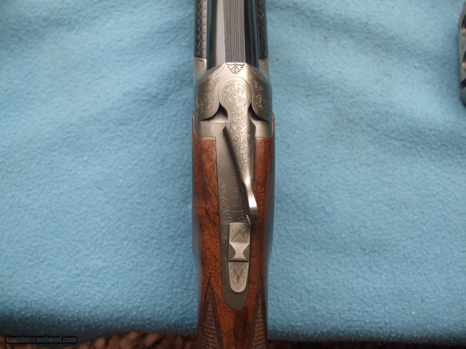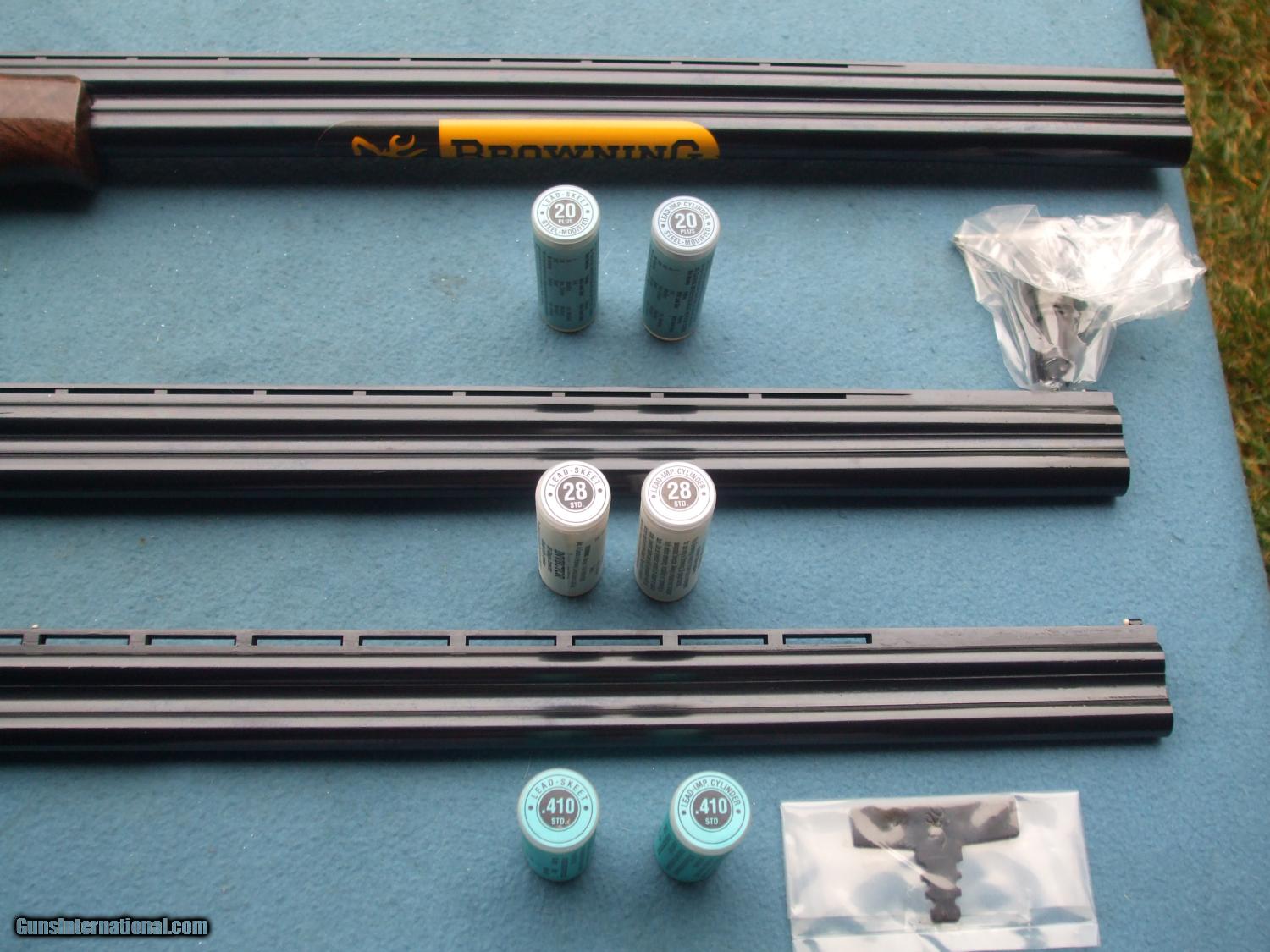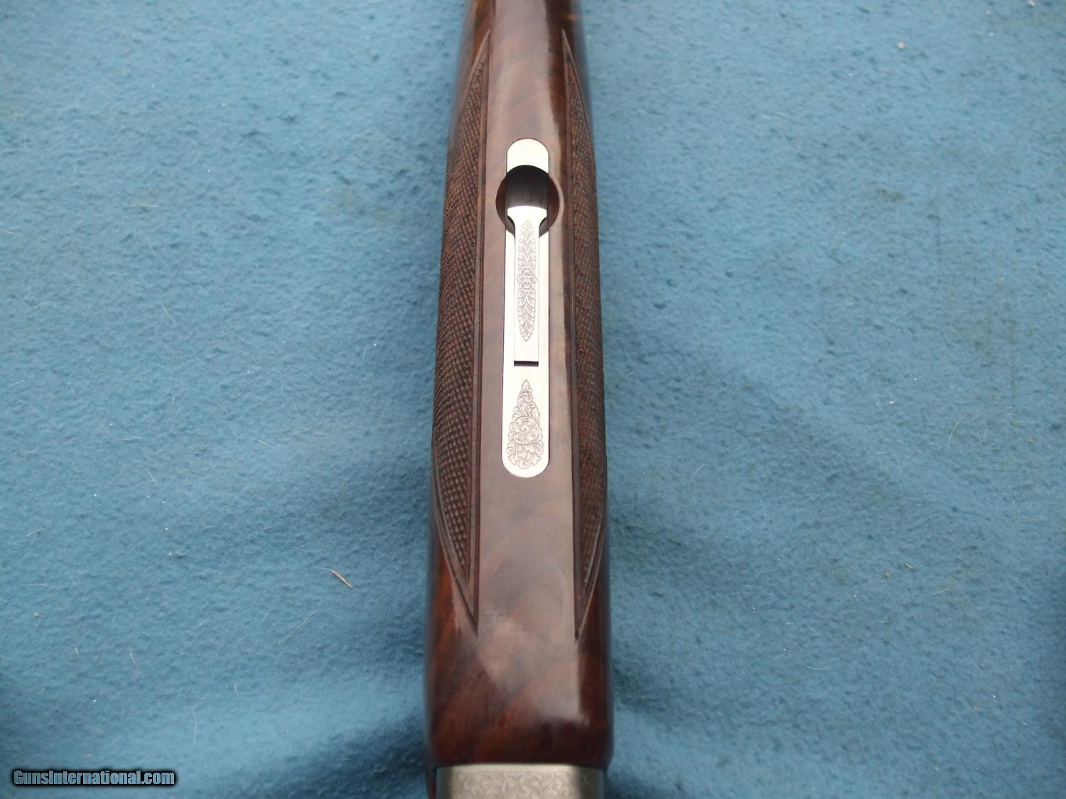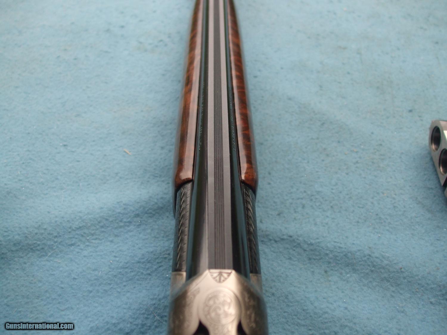Description: Browning 425 Sporting American Sporter Gold custom order 3 barrel set 20-28-410. This is brand new gun part of large custom order for 2015. All barrels are 30" in length with flush factory screw in choke tubes. Fancy american walnut with gloss finish. 20 and 28 barrels have 425 10mm wide rib with white double beads. 410 barrel has 6mm rib with double white beads and 3" chamber for hunting loads. 20 gauge barrels are equipped with Browning invector plus chokes (4) 1- skeet 2-ic 1-mod. 410 and 28 barrels equipped with Browning invector chokes (4) 1-skeet 2-ic 1-mod with each barrel. Stock dimensions 1 1/2" drop at comb, 2 3/8" drop at heel and 14 3/4" LOP with Browning inflex technology pad. The American Sporter engraving pattern is an exclusive pattern with light scroll engraving featuring a pheasant on one side, duck on the other and quail on the bottom all in gold on this model. Full scroll coverage on the top of the receiver and forend iron. Browning 3 point adustable trigger system. The firearm is shipped with Browning canvas and leather 3 barrel case. Only 21 sets have ever been produced spread over 4 models. Truly unique opportunity to purchase a functional firearm that with the limited numbers produced will be great collectors item. SOLD Manufacturer: Browning Model: 425 American Sporter Gold Serial Number: 23139zw131 Chambers: 2 3/4" 410-3 Ejectors: yes Condition: new Metal Condition: new Wood Condition: new Bore Condition: new Barrels: 30 Barrel Type: o/u Action: citori Triggers: inertia Gauge Info: 20-28-410 Stock: high grade walnut Stock Comb: 1 1/2 Stock Heel: 2 3/8 Stock Cast: right hand Fore End: schnabel Butt Pad: inflex sporting LOP: 14 3/4 Rib: 10mm/6mm Finish: high gloss Weight: 7-7lbs 2oz Sights: double white Manufacture Date: 2015 Chokes: inv and inv+ Engraving: American sporter Case: yes |