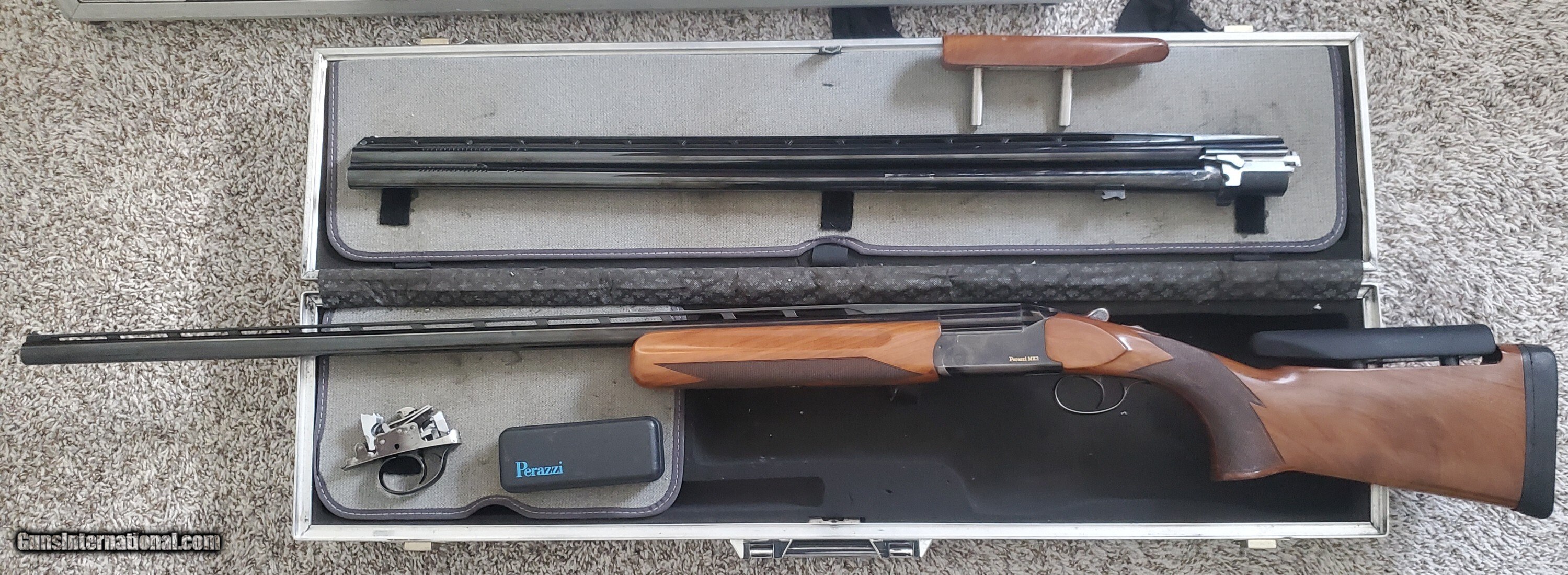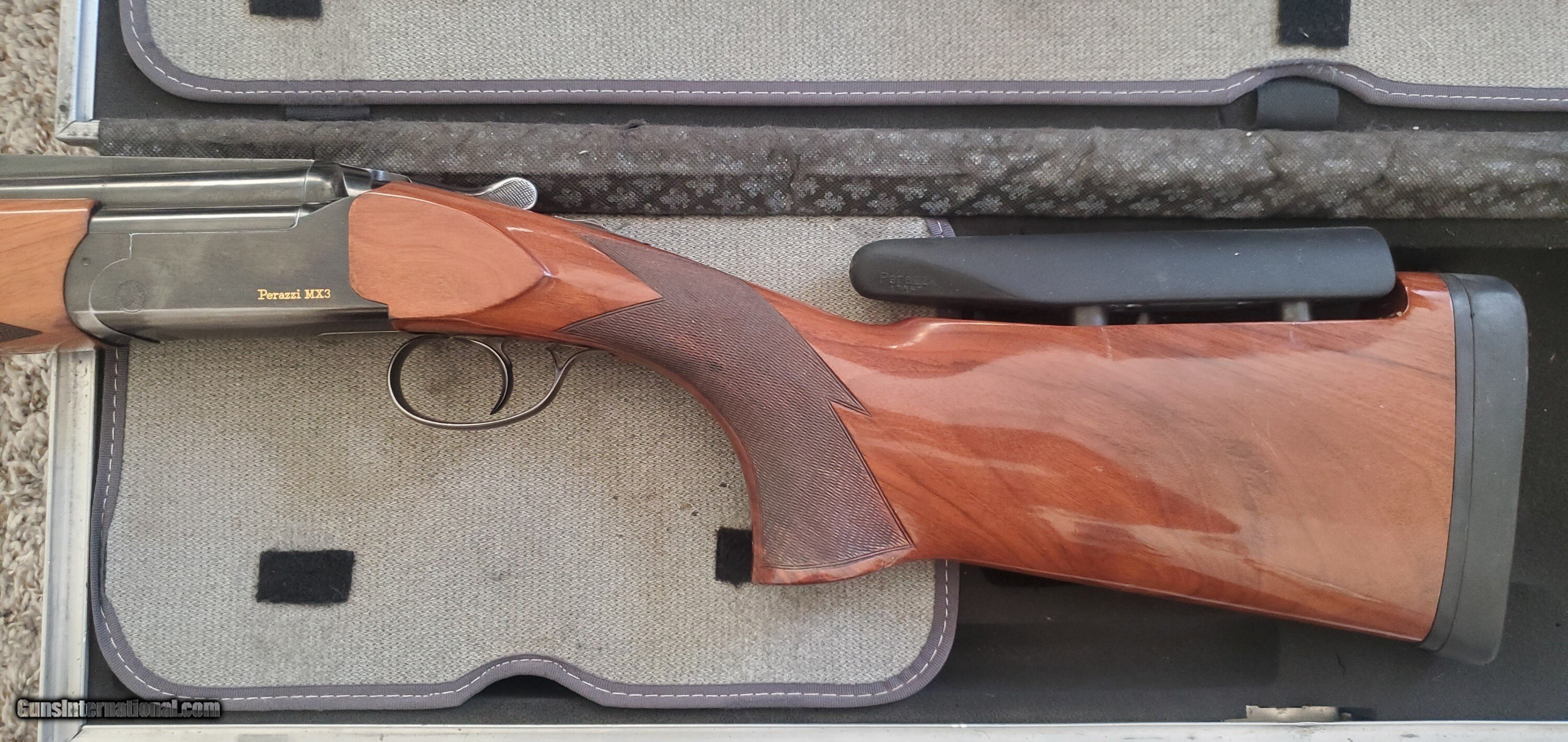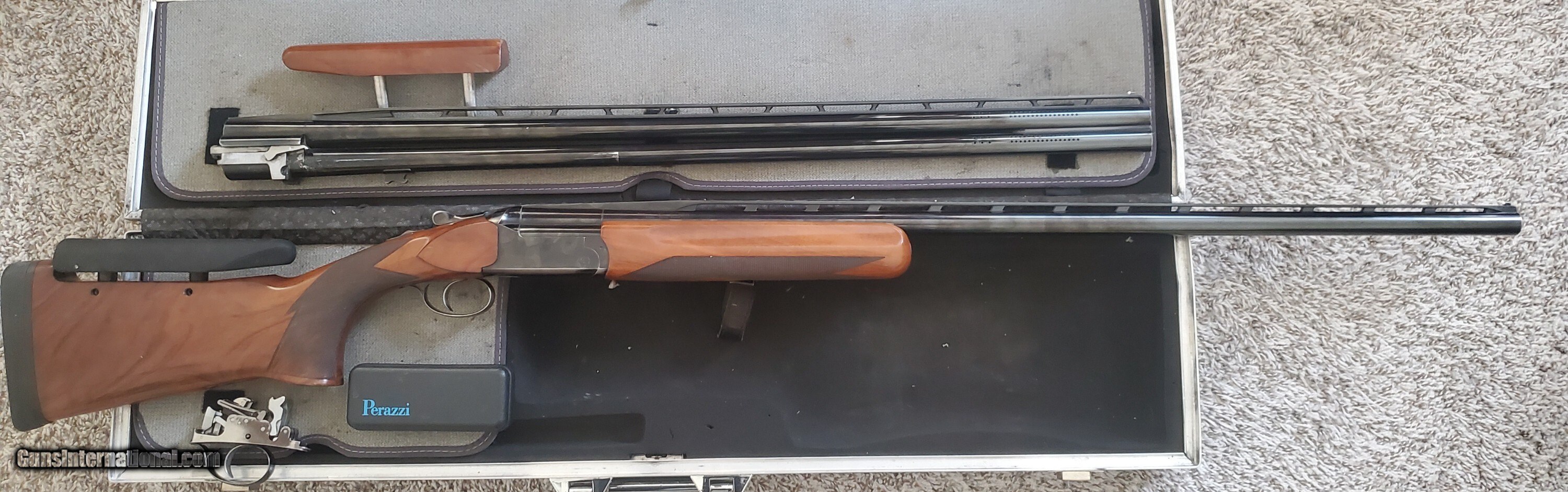 Description: Selling a nice Perazzi MX3 with 34" top single barrel fixed full choke and 32" o/u fixed IM over full choke. Over under barrels are ported. All numbers match except the wood. Stock has a factory Perazzi 4 way adjustable comb and 14 1/4" LOP w/ 1" pad. Neutral cast and no palm swell. Has original wood comb and a factory Perazzi (black) soft comb. The wood comb has extended posts. Bluing wear under the receiver on the edge and bottom of trigger guard shows some wear. Pull/pull trigger top first and also comes with a double release (non matching) top barrel first. Top lever is far to the right and locks up tight indicating a recent locking block installation. Comes with a spare parts kit but is missing the springs for the firing pins. Ships in an aluminum combo case. Shotgun Gauge: 12 Gauge Manufacturer: Perazzi Model: MX3 Price: $6,000.00 Shipping: $75.00 Contact Seller |