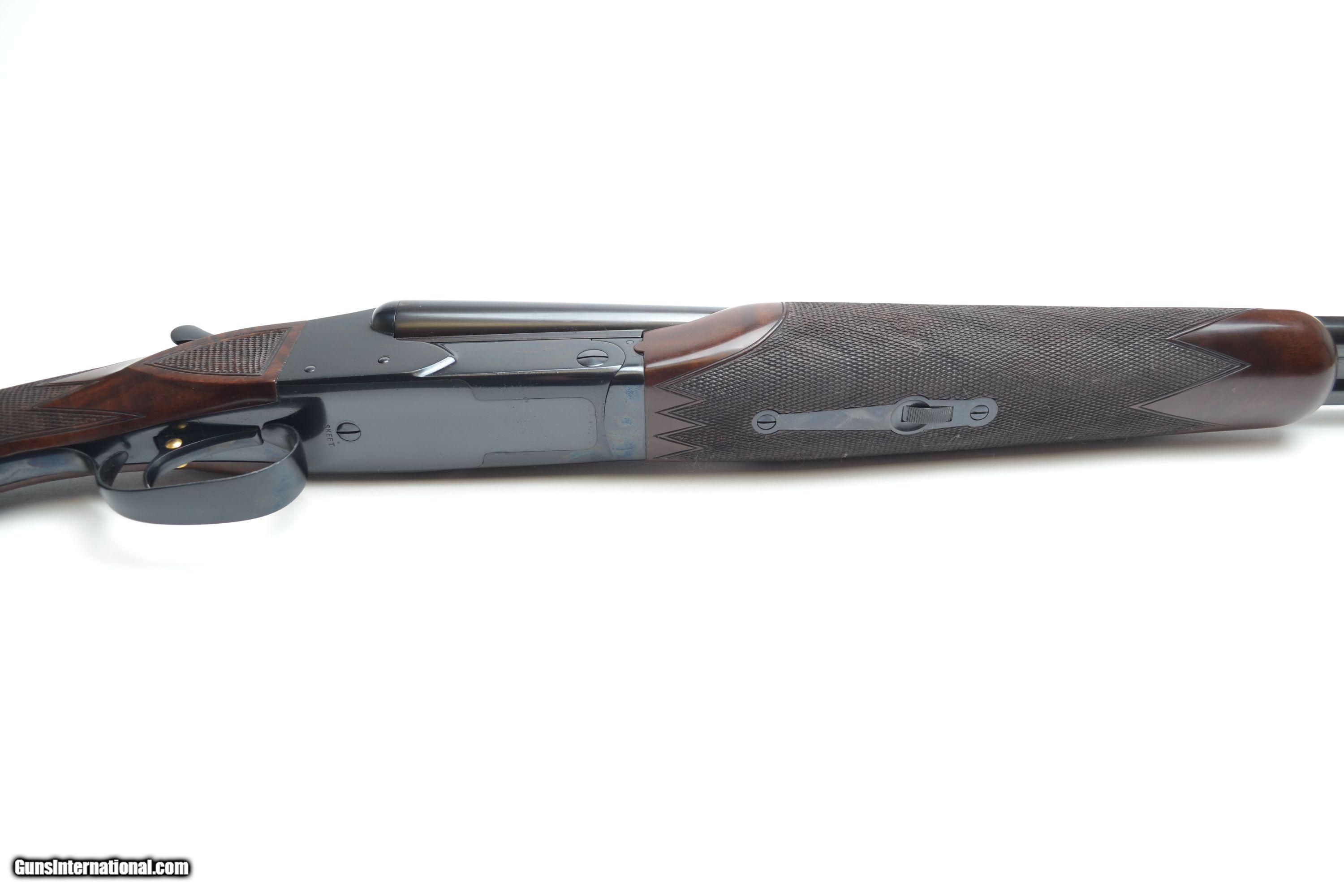 Description: Winchester - Model 21, Two Barrel Set, 20/28ga. Two vent ribs 26” barrels. 20ga 26” barrels choked F/M, 28ga. 26” barrels choked WS1/WS2. Two deluxe checkered beavertail forends. Capped pistol grip checkered butt, checkered side panels BOTH BARRELS FACTORY VENT RIB. The 28ga barrels are the most desirable lightweight version. This gun features highly figured black American feather crotch wood, single selective trigger, auto ejector, Skeet grade gun in new condition. Inventory # 30855 LOP - 14 ¼” Weight w/ 28ga. Bbls – 6 lb. 14 oz. Price - $14,995.00 SOLD |
