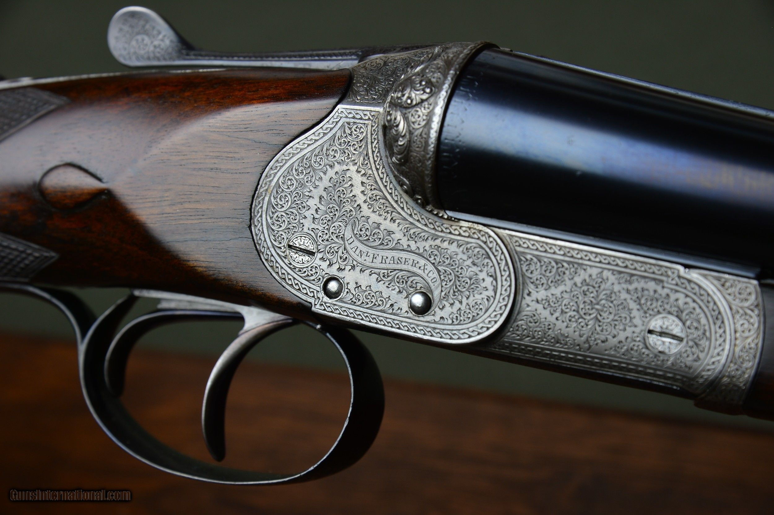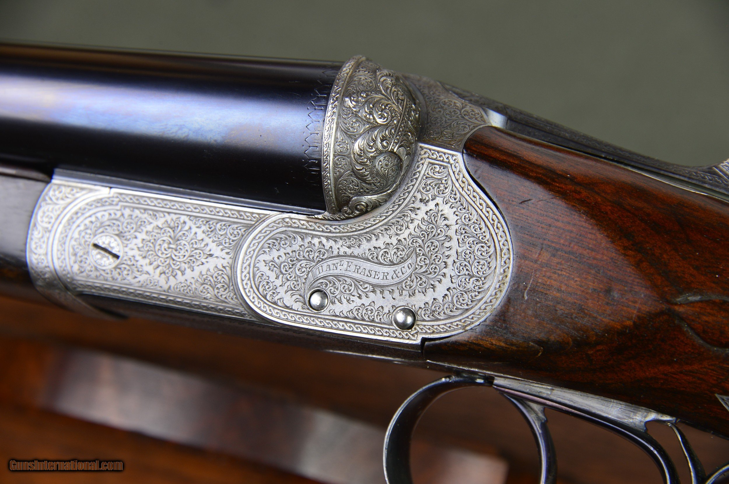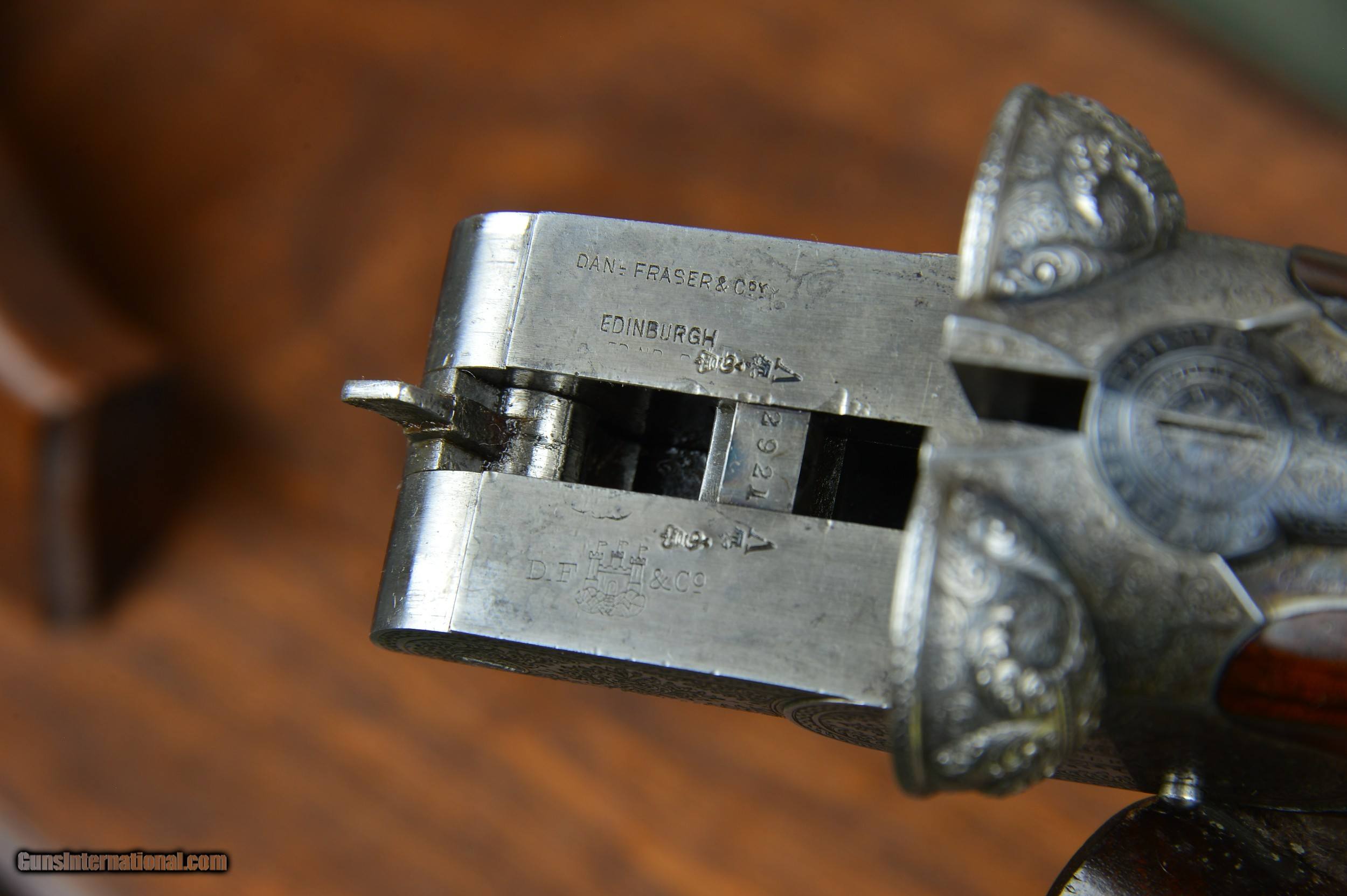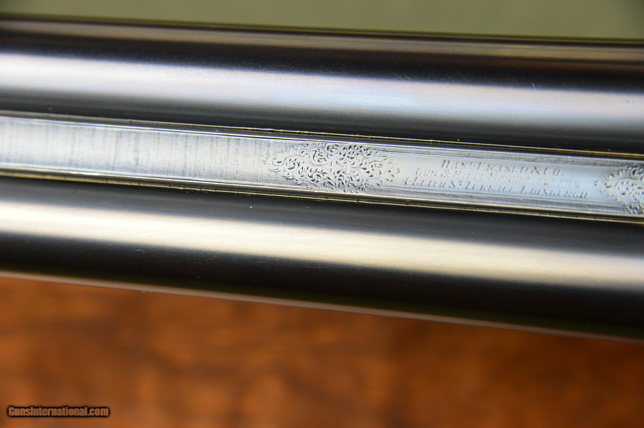 Description: *** SOLD *** Daniel Fraser & Son of Edinburgh are best known for their much sought-after rifles. However, few are aware that Fraser made a small number of unique and beautifully engraved boxlock shotguns of their own design. And here is a prime example. One of the most striking features of these special guns is their profuse and exquisite engraving. Full coverage of the action body and fantastically carved fences set this gun apart from any other. No. 2921 was manufactured in Scotland circa 1903 and has intercepting sears, gold washed internals, double triggers, auto ejectors, manual safety, and disc set strikers. It weighs 6lb 14oz. *** The original 30” chopper lump nitro steel barrels were London proofed in 2009 for 2-3/4” shotshells. The bores are shiny and the bluing is in excellent condition. The barrels are topped by a raised solid concave hand filed rib. The rib is inscribed “Dan’l Fraser & Co. Gun & Rifle Manufacturers 4 Leith St Terrace Edinburgh”. The right barrel is bored 0.729 with a constriction of 0.07 for Light Improved Cylinder choke. Minimum wall thickness is 0.027. The left barrel is also bored 0.727 and has a constriction of 0.015 for Light Modified choke. Minimum wall thickness is 0.026. *** The pistol grip stock and splinter forearm are made of highly figured French walnut. The checkering is crisp. Stock dimensions are 15-1/8” including a 3/4" leather recoil pad by 1-1/2” by 2-1/4”. Cast off for the righthand shot. *** Shooters and collectors of Scottish shotguns will understand that this is a rare opportunity to purchase one of these rare Frasers. This great handling double is a joy to shoot and to behold. Move quickly before it gets away. *** I am an FFL and will need a signed copy of your dealer’s FFL. Buyer is responsible for all shipping, insurance, and any other related charges. I give a 3-day non-firing inspection period which begins when the gun is delivered to purchaser’s FFL dealer or directly to the purchaser if the gun is classified as an Antique. Will only accept returns at buyer’s expense. SOLD |