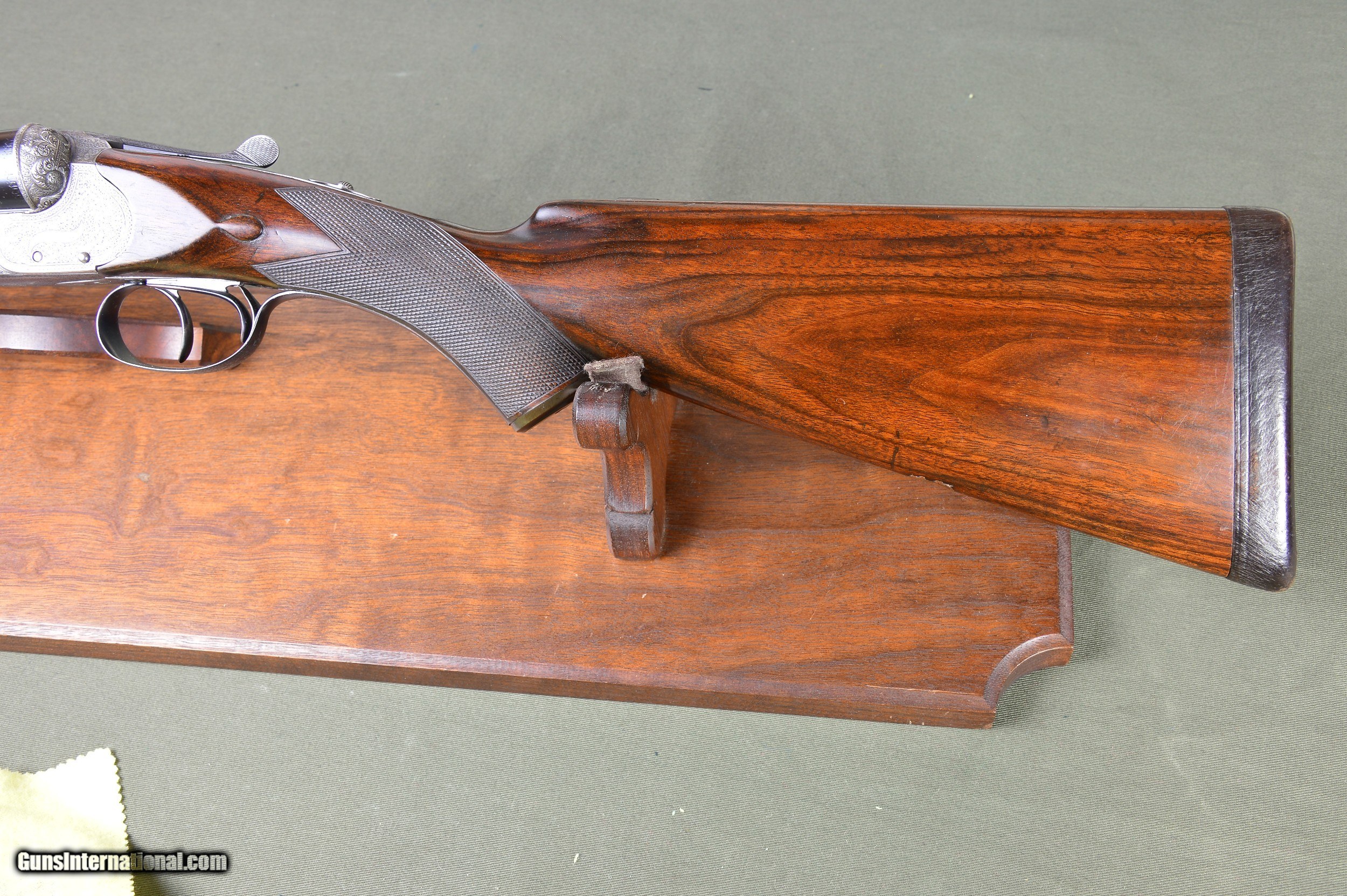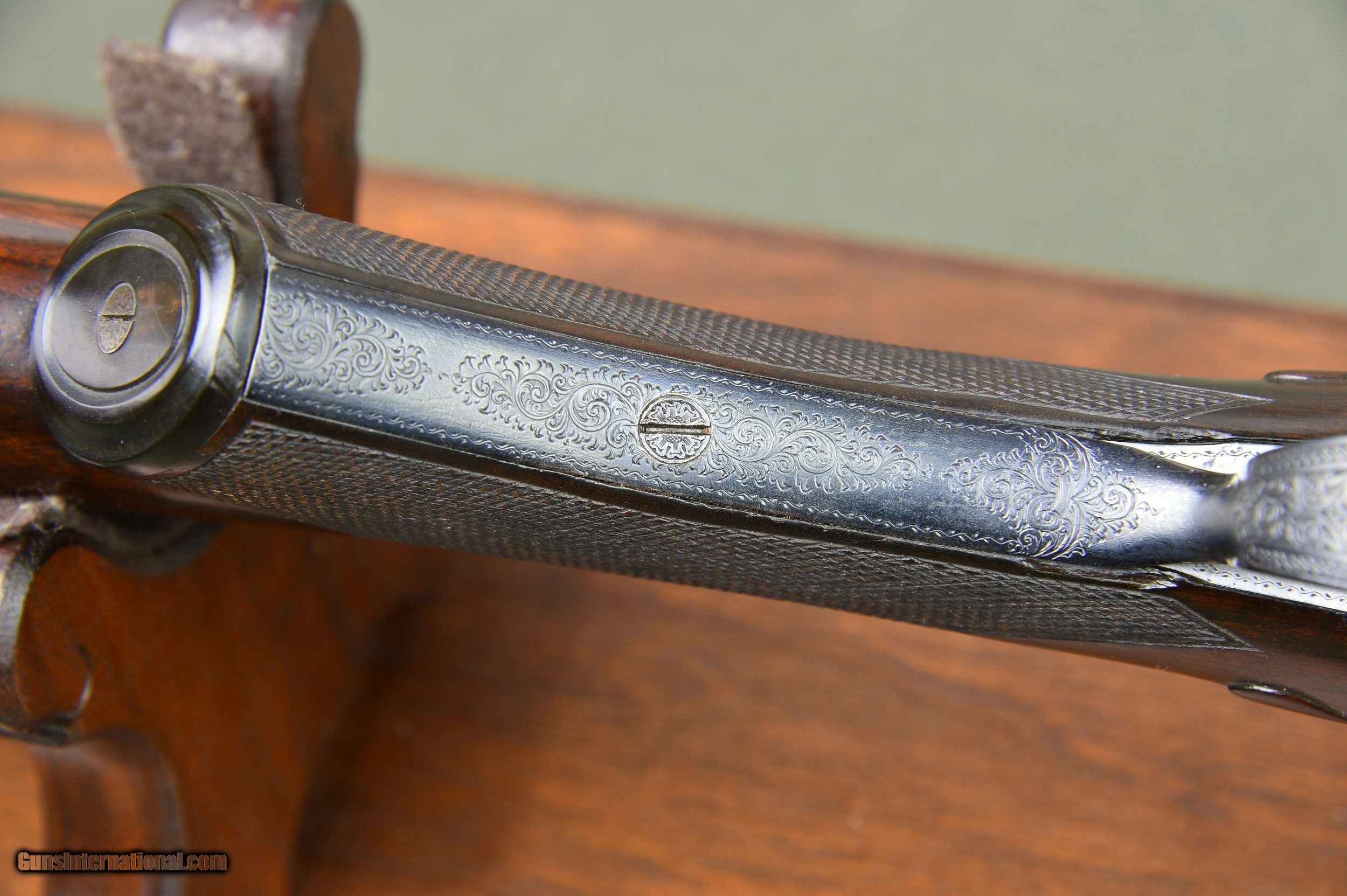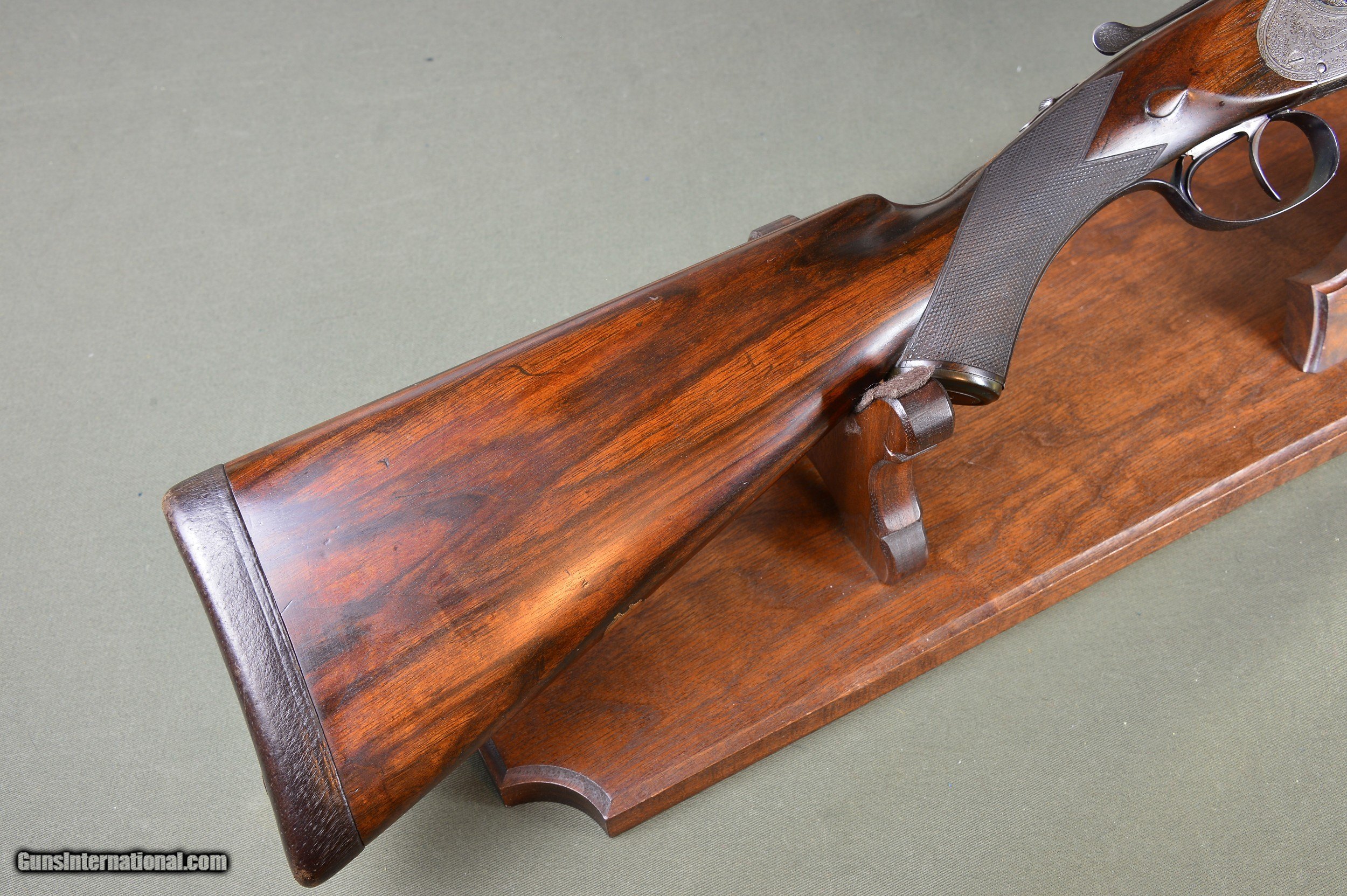 Description: *** SOLD *** Daniel Fraser & Son of Edinburgh are best known for their much sought-after rifles. However, few are aware that Fraser made a small number of unique and beautifully engraved boxlock shotguns of their own design. And here is a prime example. One of the most striking features of these special guns is their profuse and exquisite engraving. Full coverage of the action body and fantastically carved fences set this gun apart from any other. No. 2921 was manufactured in Scotland circa 1903 and has intercepting sears, gold washed internals, double triggers, auto ejectors, manual safety, and disc set strikers. It weighs 6lb 14oz. *** The original 30” chopper lump nitro steel barrels were London proofed in 2009 for 2-3/4” shotshells. The bores are shiny and the bluing is in excellent condition. The barrels are topped by a raised solid concave hand filed rib. The rib is inscribed “Dan’l Fraser & Co. Gun & Rifle Manufacturers 4 Leith St Terrace Edinburgh”. The right barrel is bored 0.729 with a constriction of 0.07 for Light Improved Cylinder choke. Minimum wall thickness is 0.027. The left barrel is also bored 0.727 and has a constriction of 0.015 for Light Modified choke. Minimum wall thickness is 0.026. *** The pistol grip stock and splinter forearm are made of highly figured French walnut. The checkering is crisp. Stock dimensions are 15-1/8” including a 3/4" leather recoil pad by 1-1/2” by 2-1/4”. Cast off for the righthand shot. *** Shooters and collectors of Scottish shotguns will understand that this is a rare opportunity to purchase one of these rare Frasers. This great handling double is a joy to shoot and to behold. Move quickly before it gets away. *** I am an FFL and will need a signed copy of your dealer’s FFL. Buyer is responsible for all shipping, insurance, and any other related charges. I give a 3-day non-firing inspection period which begins when the gun is delivered to purchaser’s FFL dealer or directly to the purchaser if the gun is classified as an Antique. Will only accept returns at buyer’s expense. SOLD |